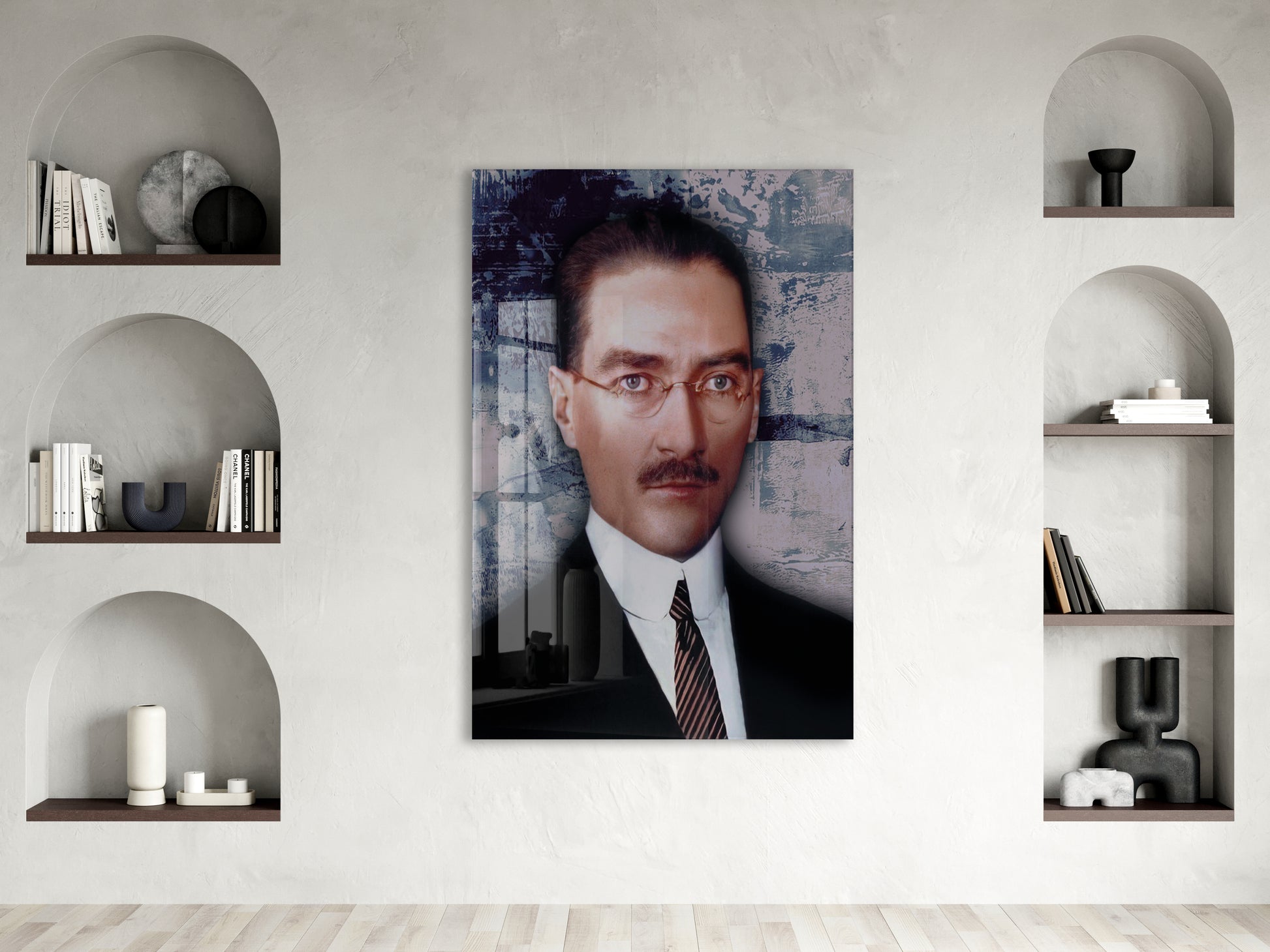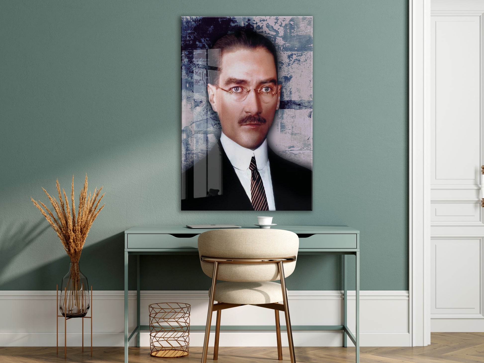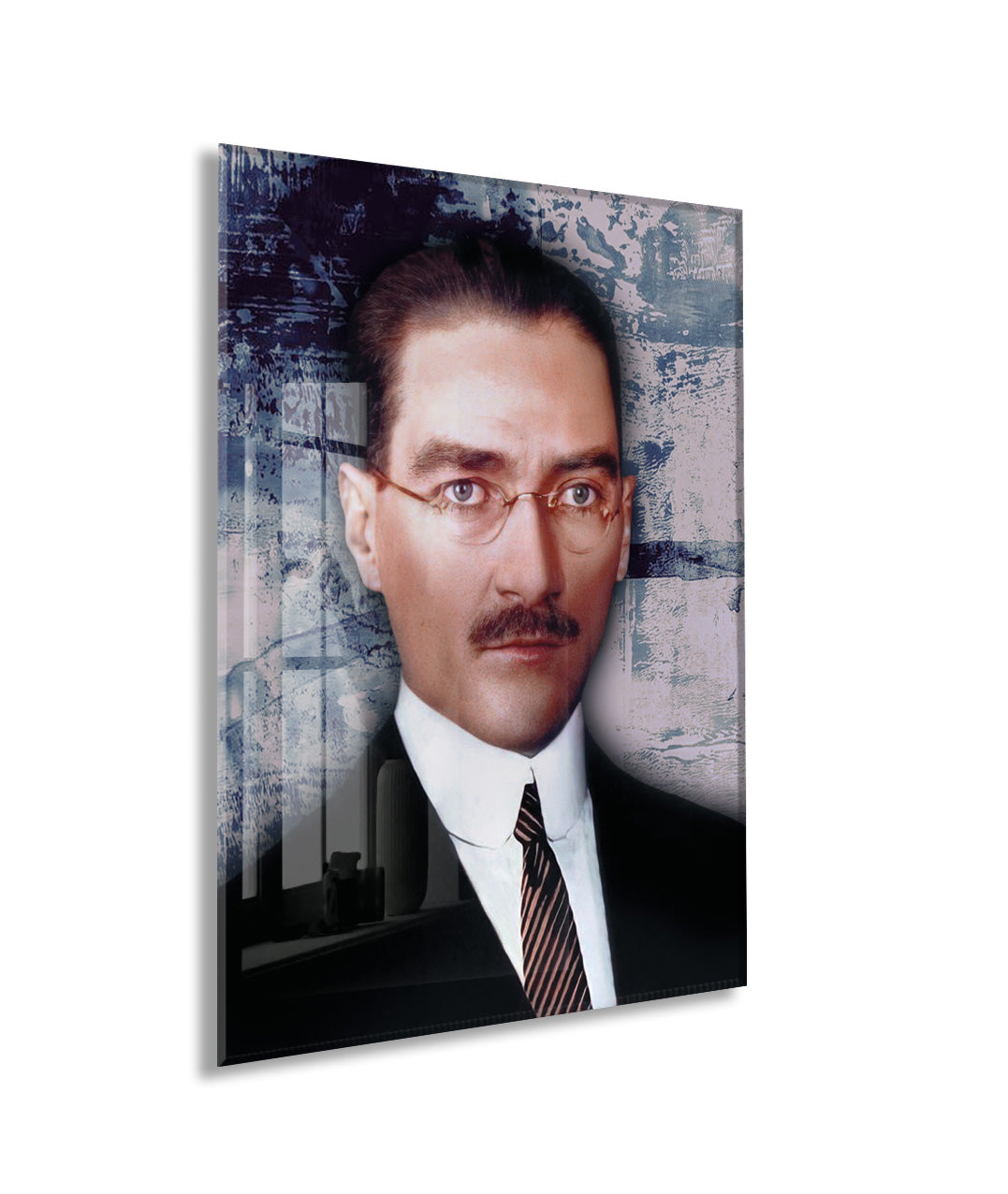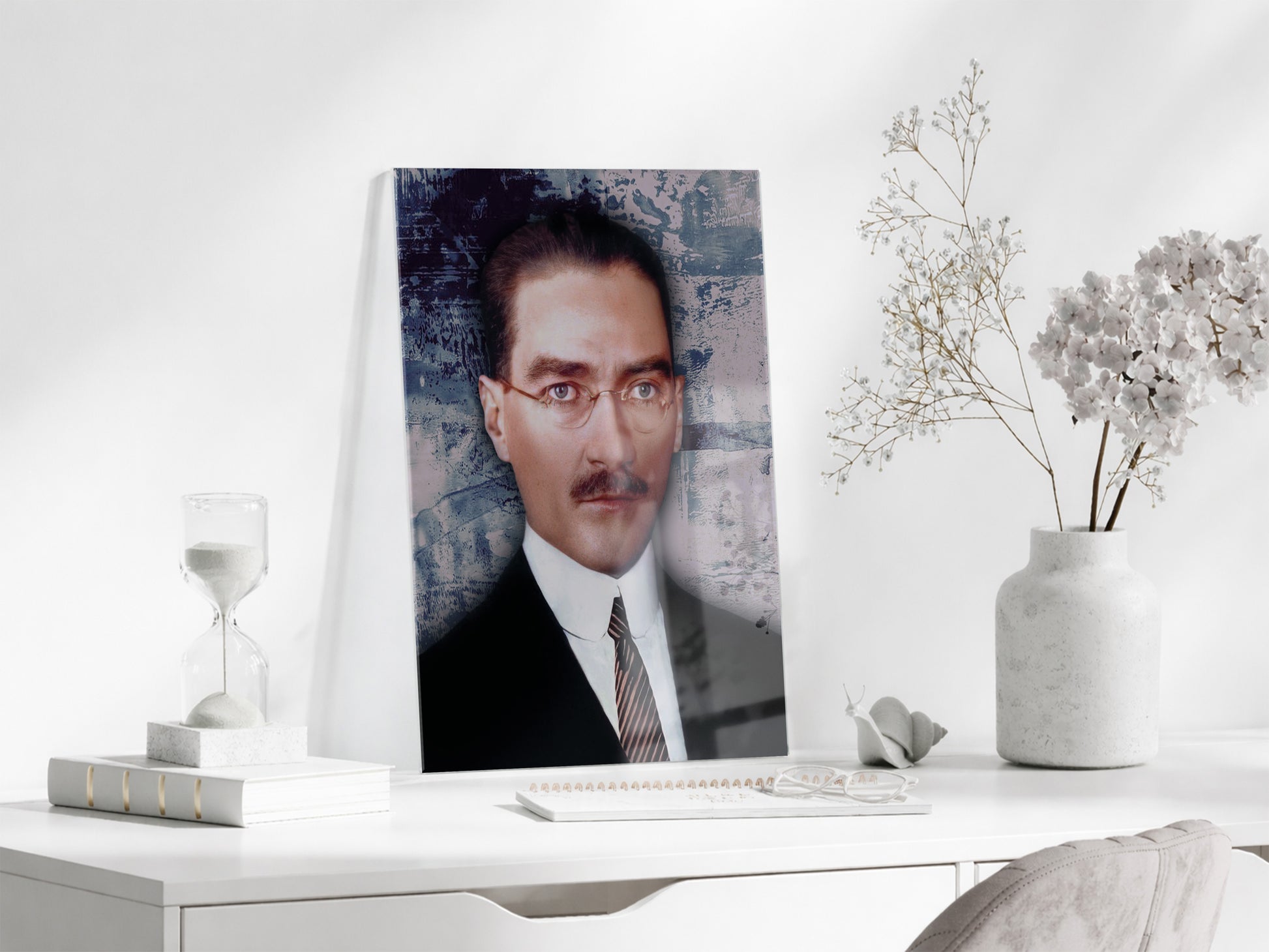 Atatürk Cam Tablo – Gözlüklü Portre Tasarımı, 4 mm Temperli Cam Üzerine Modern ve Prestijli Duvar Dekoru -PeonyAta1021