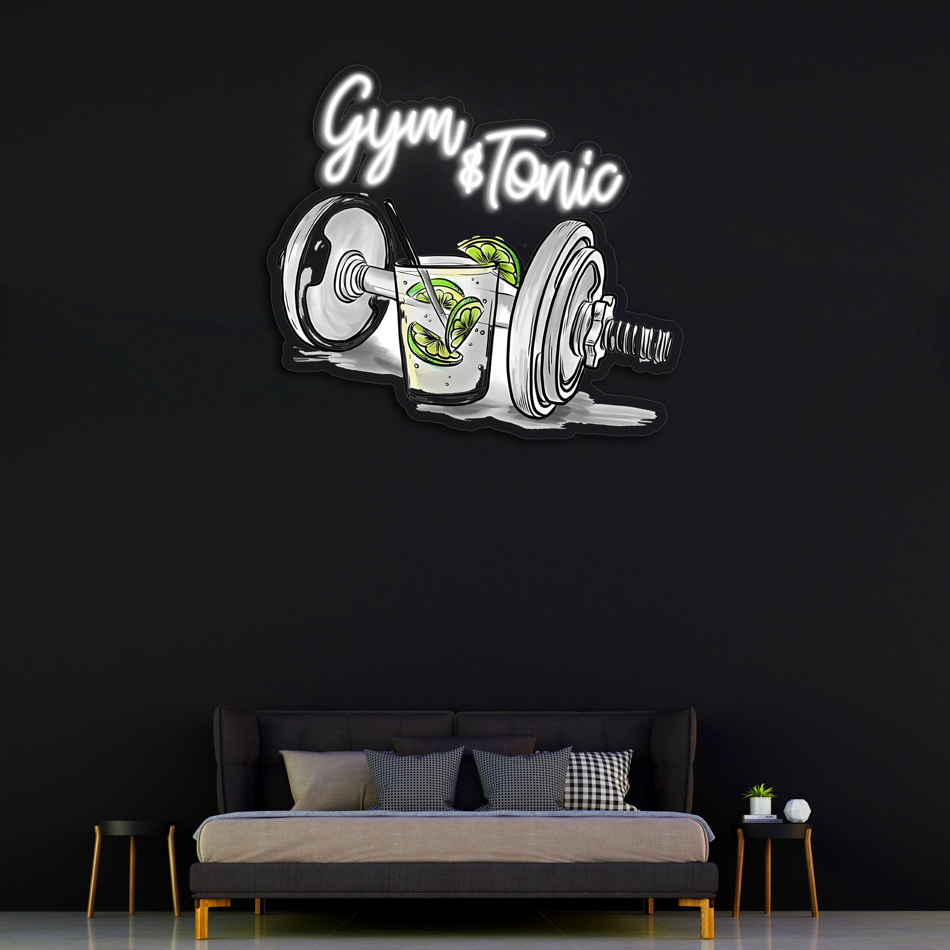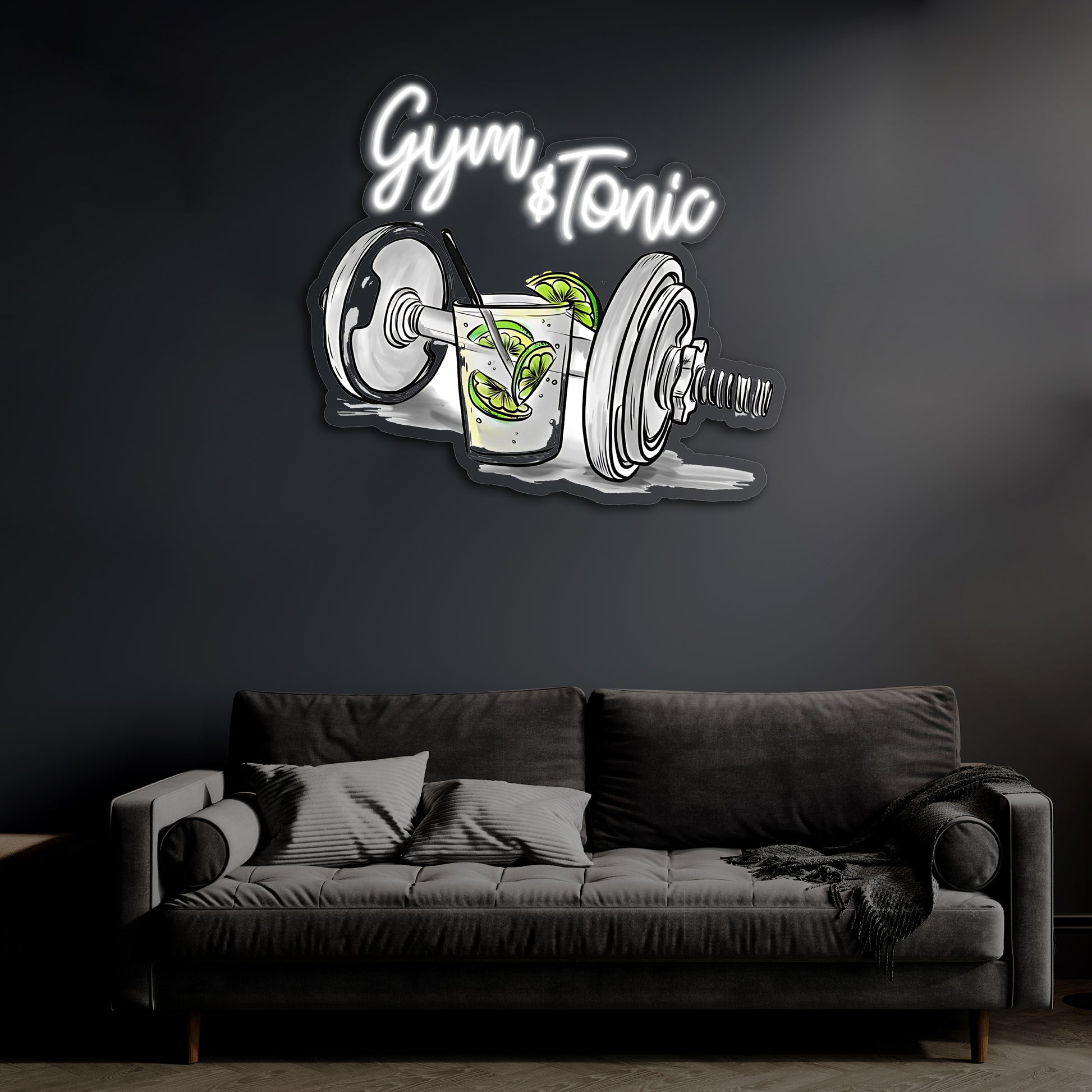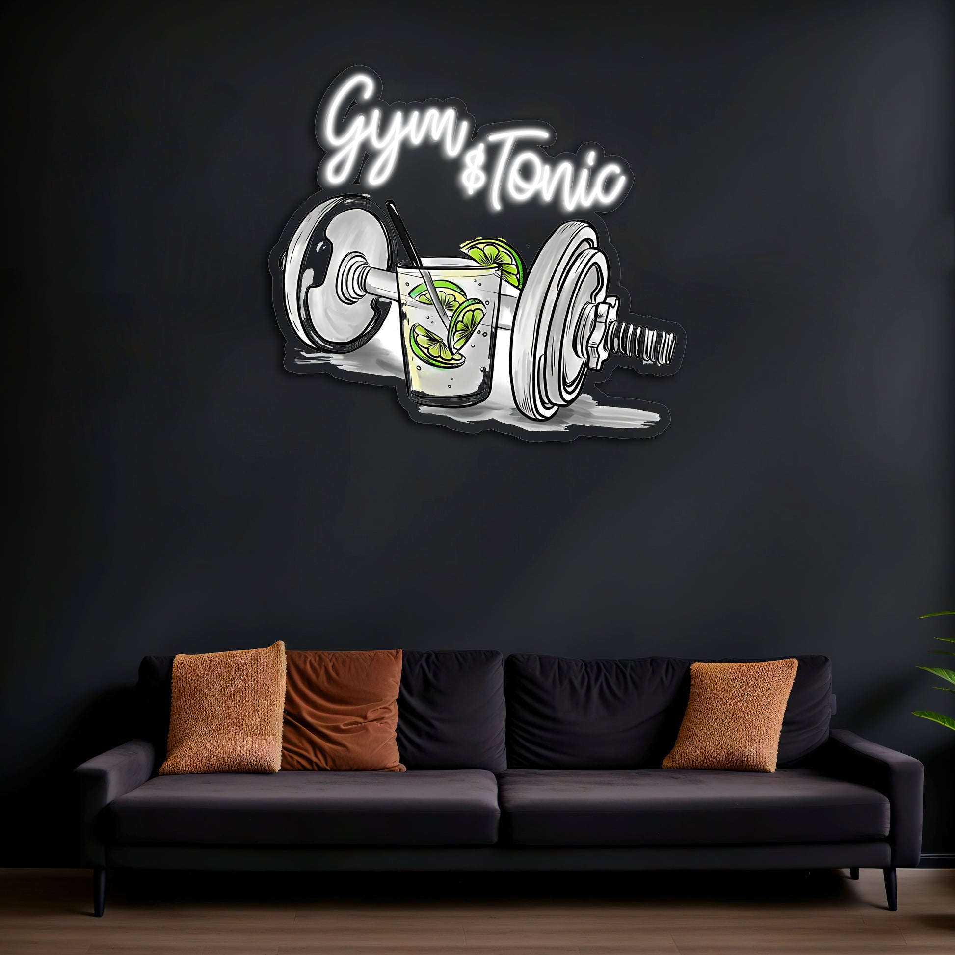 Gym & Tonic Neon Duvar Dekoru | Spor ve Kokteyl Temalı LED Işıklı Tablo | UV Baskı Pleksi Neon | Mizahi Bar ve Ev Dekoru