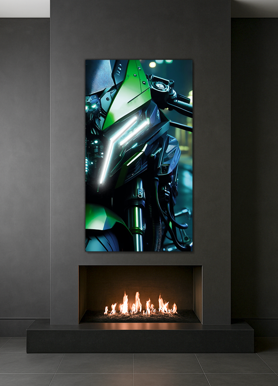 Bu yeşil spor motosiklet UV baskı neon tablo, ön farında yer alan beyaz LED çizgileriyle mekânınıza modern bir enerji katar.