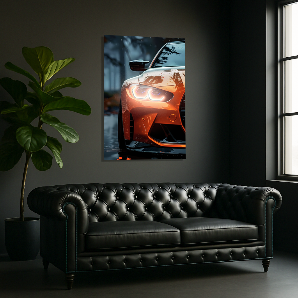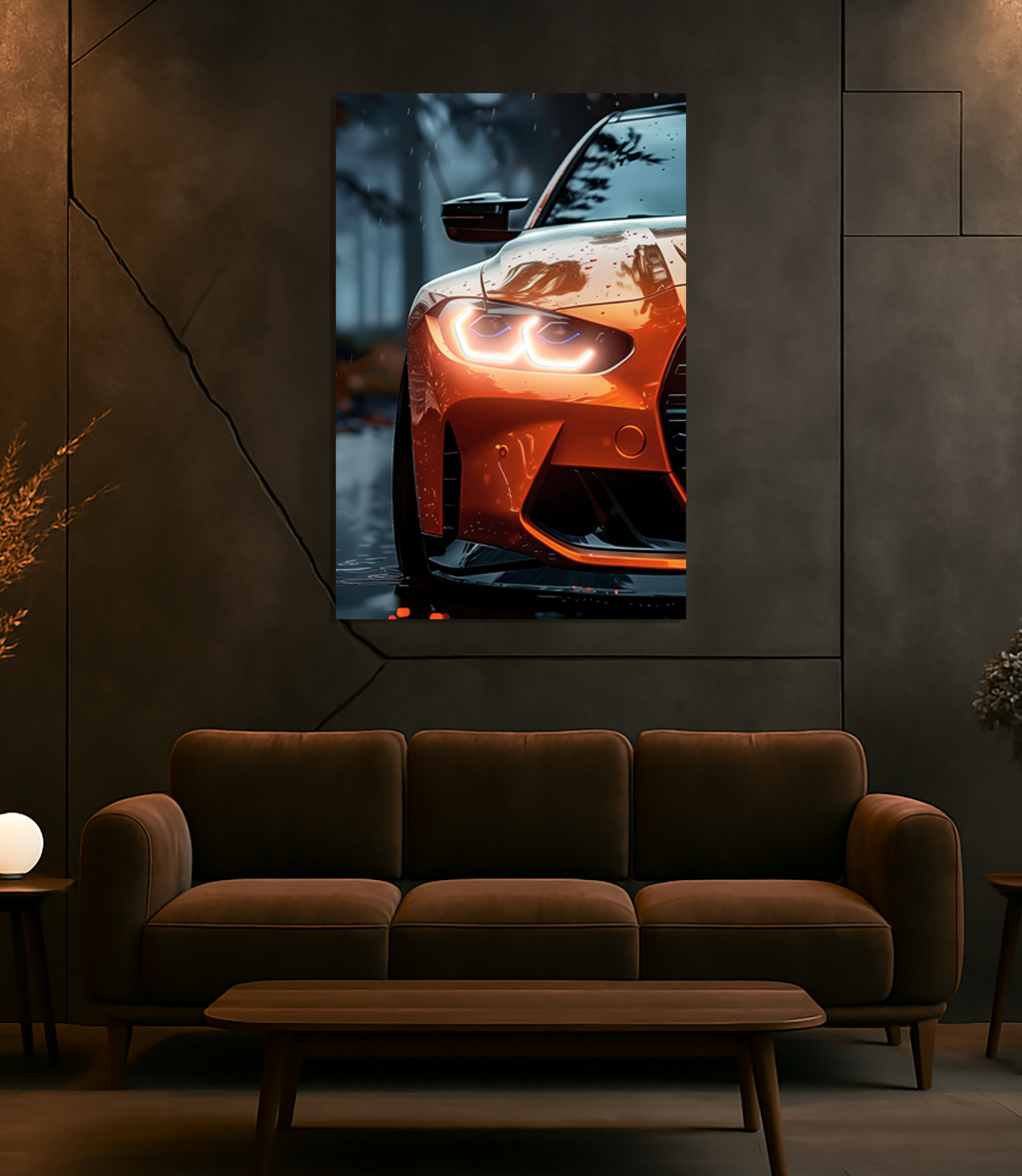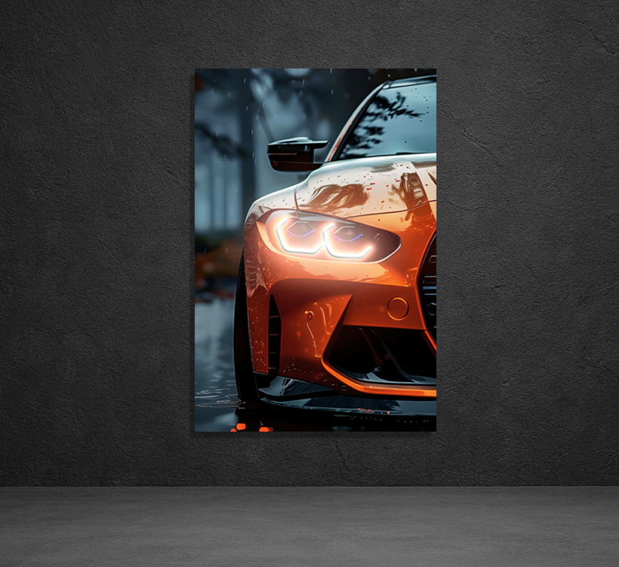 Yağmur damlalarının yansıttığı ışıklar altında parlayan bu turuncu spor otomobil UV baskı tablo, enerjiyi ve dinamizmi duvarlarınıza taşır.