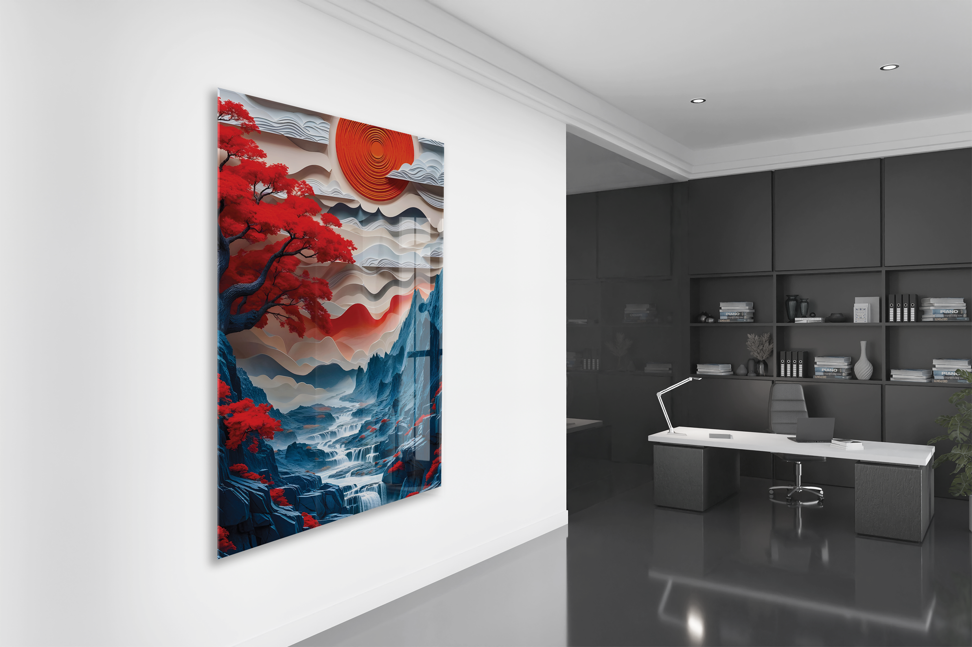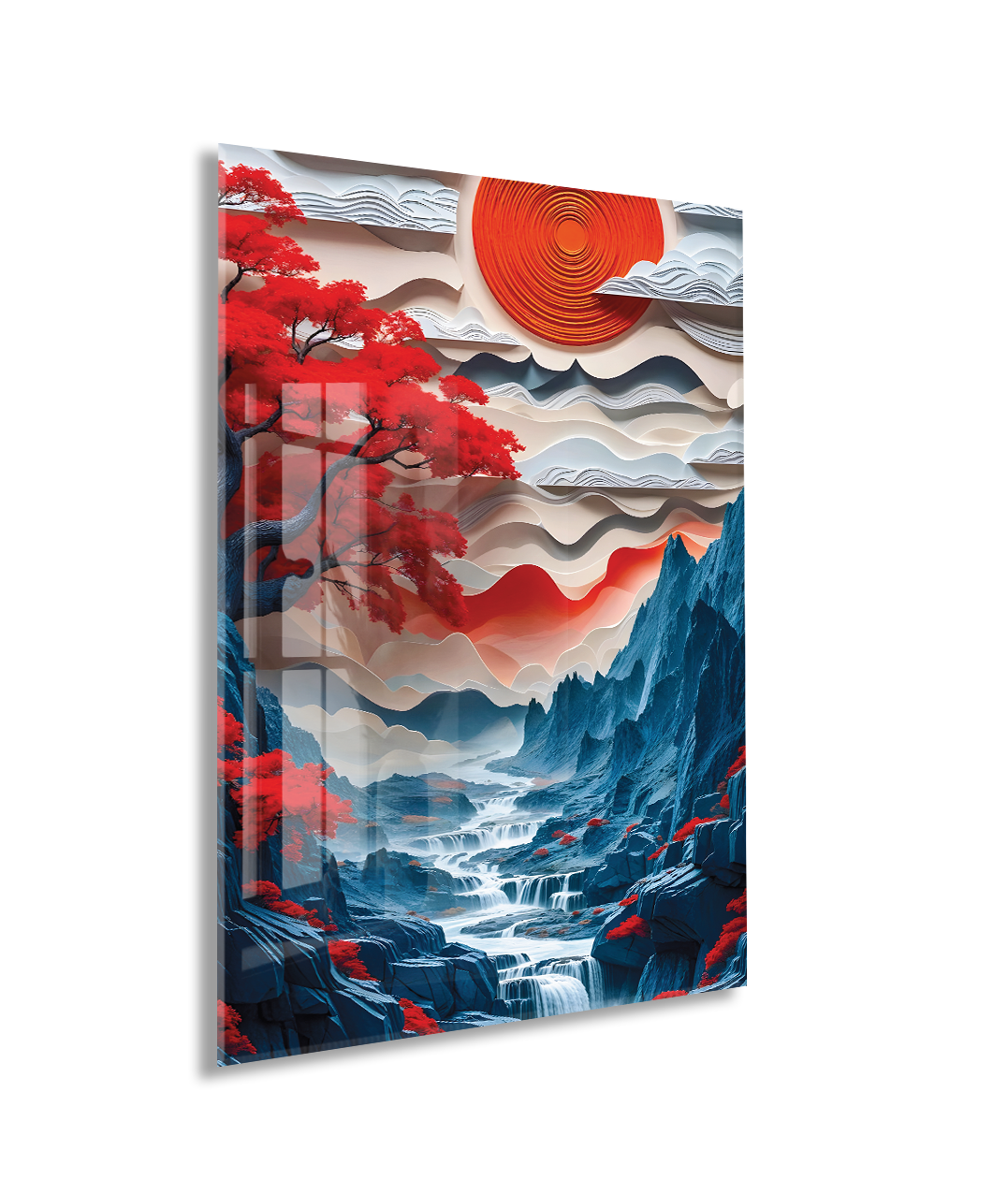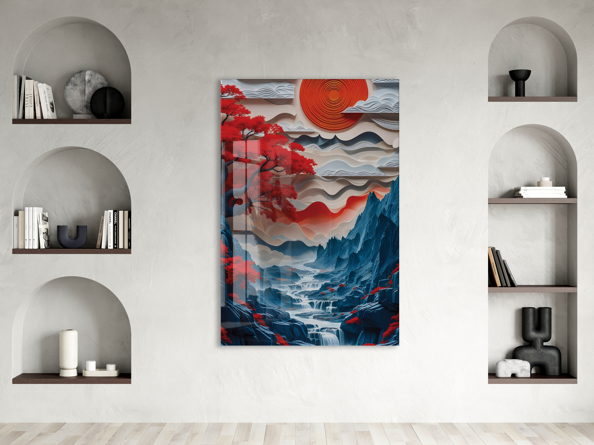 Modern Soyut Asya Manzarası Cam Tablo – Kızıl Güneş ve Dağ Temalı Sanatsal UV Baskılı Temperli Cam Duvar Tablosu - Peony009