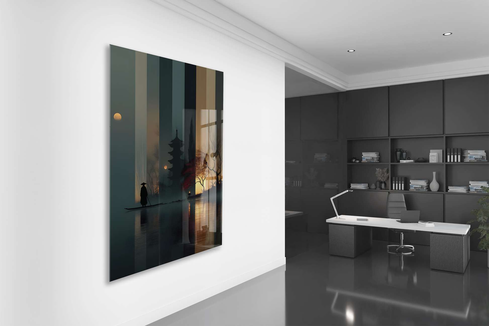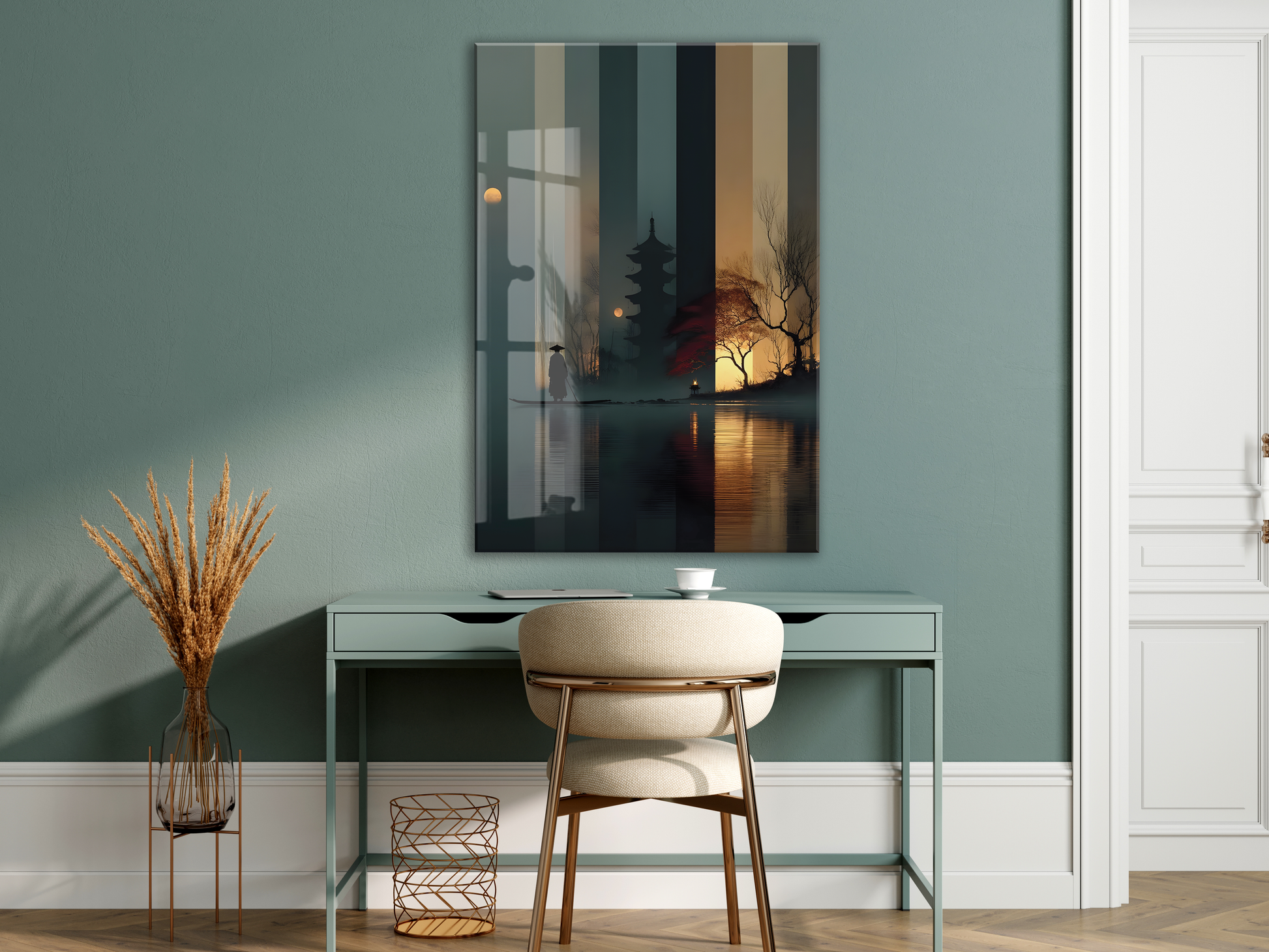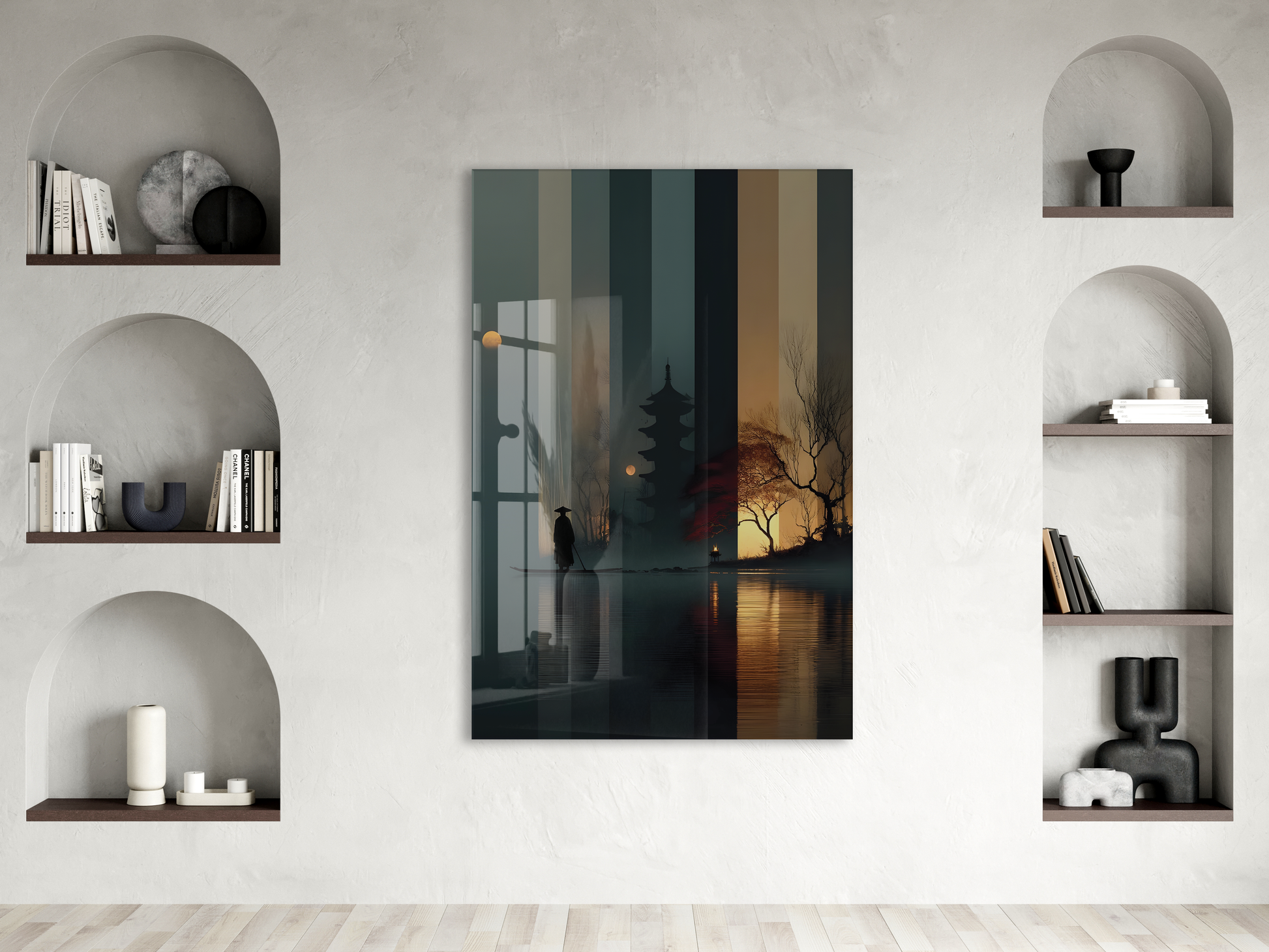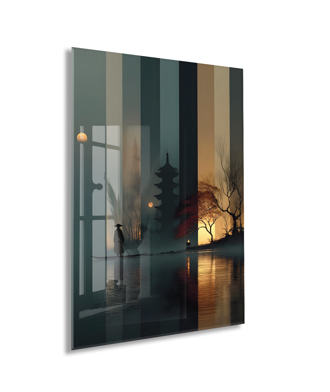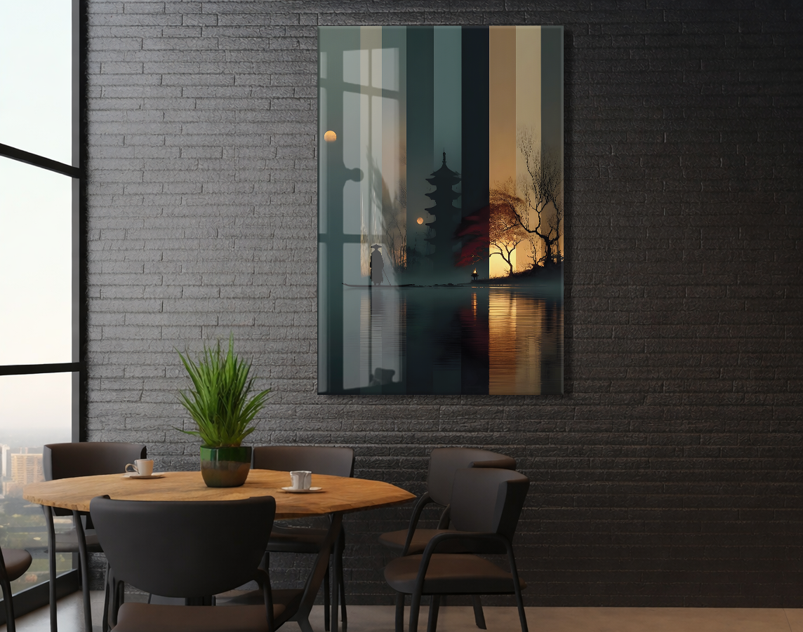 Modern Asya Tapınak Silüeti Cam Tablo – Gece ve Gün Batımı Temalı Sanatsal UV Baskılı Temperli Cam Duvar Tablosu - Peony016