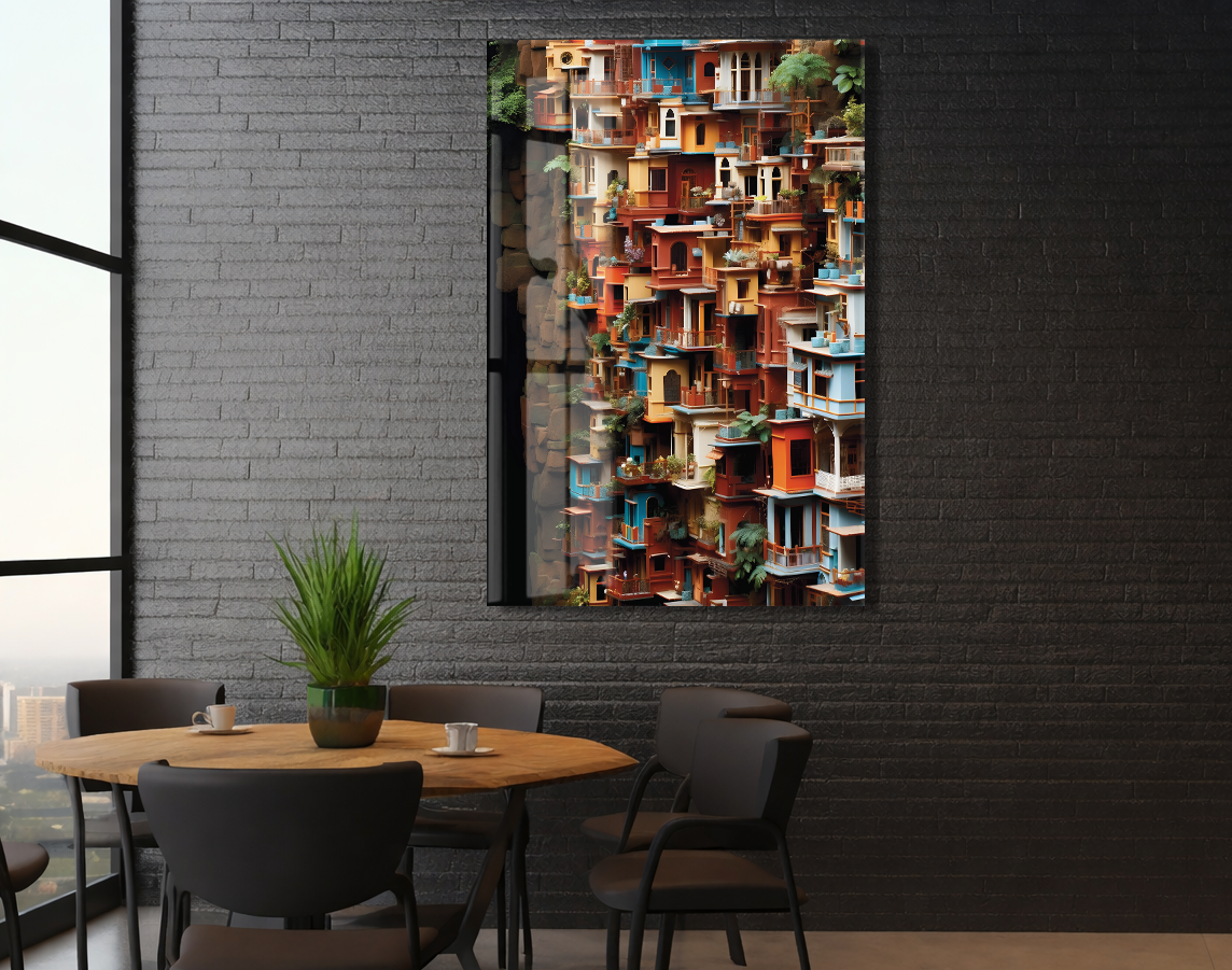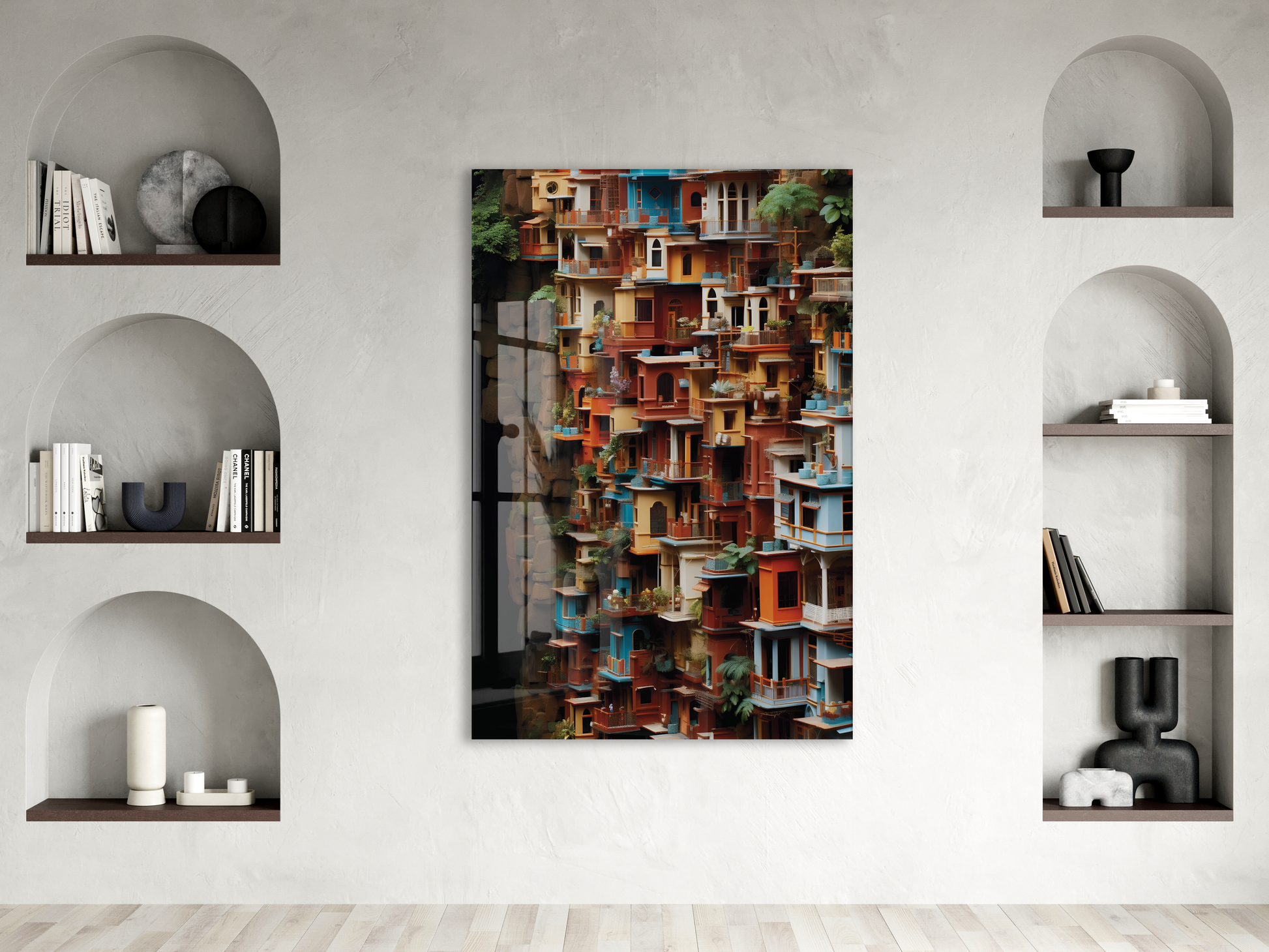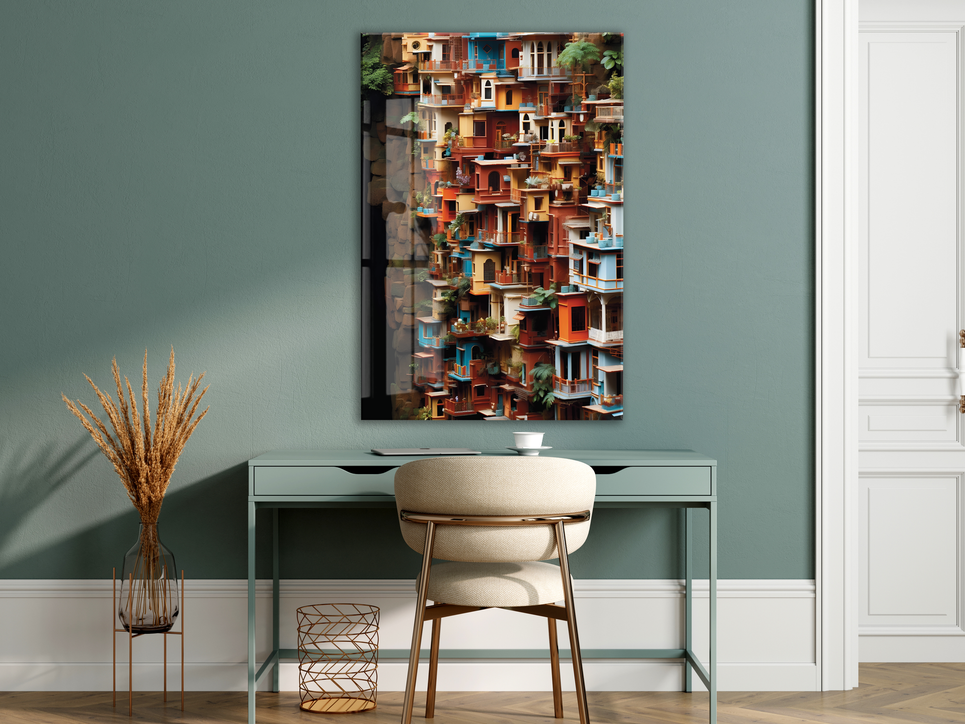 Modern Renkli Şehir Cepheleri Cam Tablo – Mimari ve Kentsel Sanat Temalı UV Baskılı Temperli Cam Duvar Tablosu - Peony019