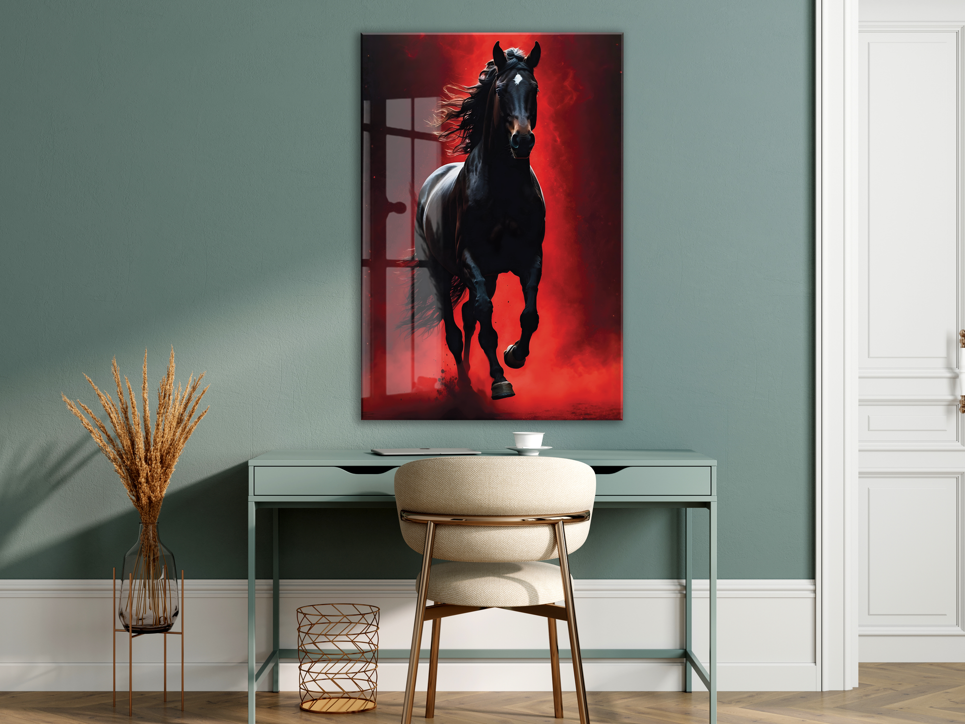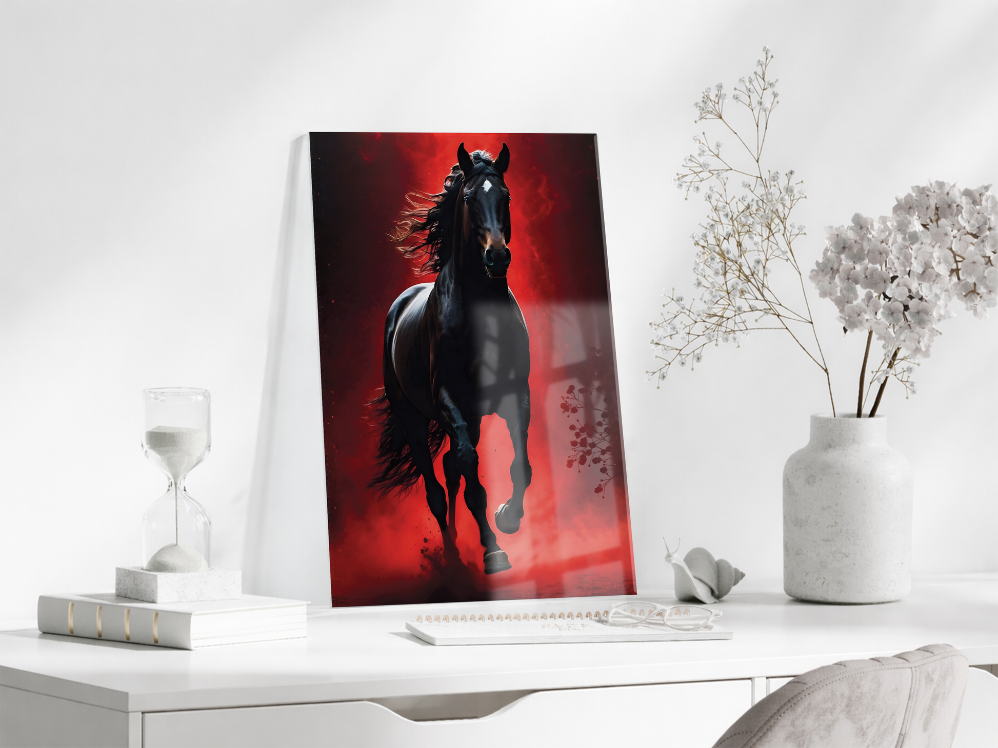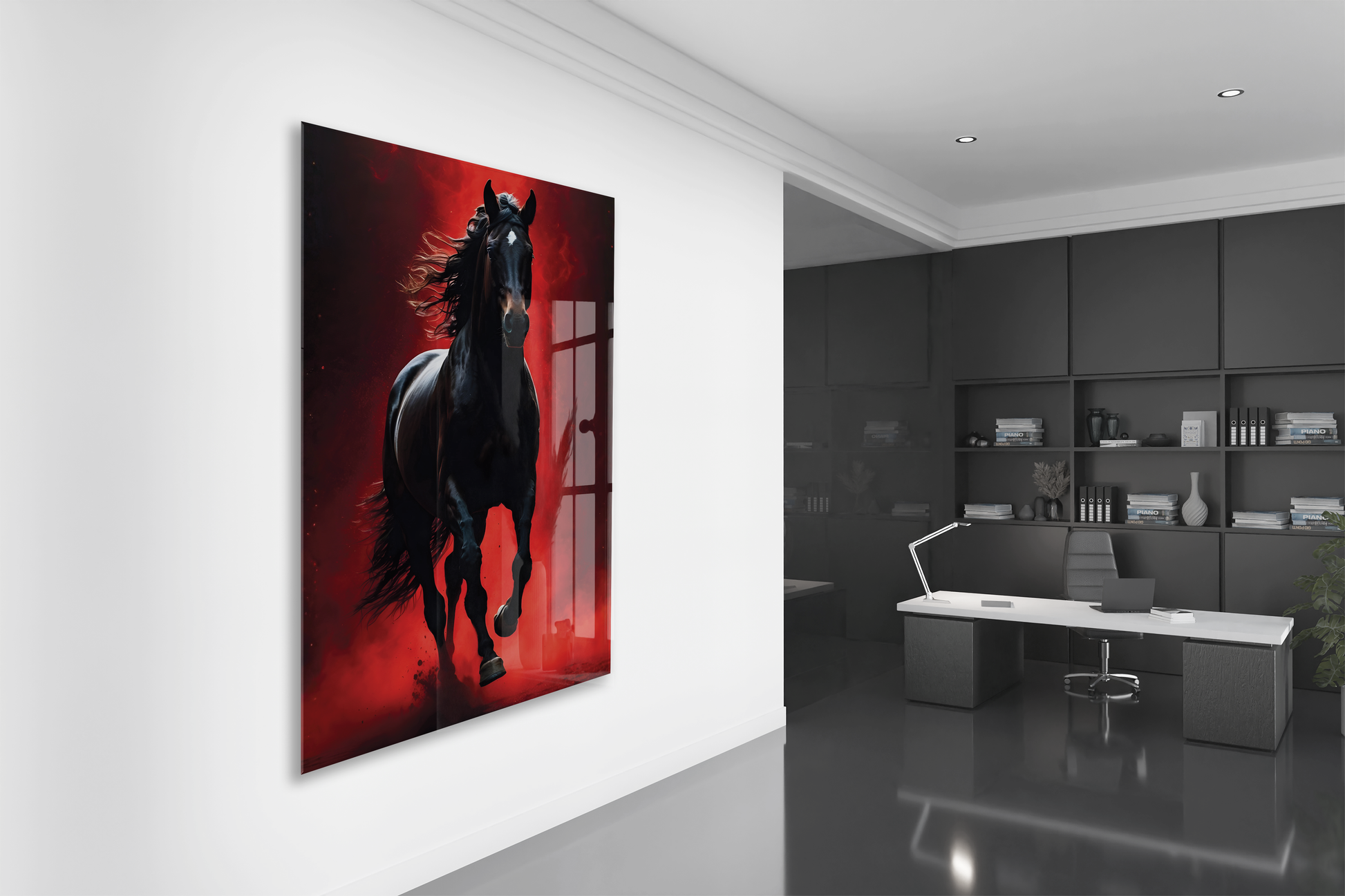 Kırmızı Arka Planlı Siyah At Cam Tablo – Güç ve Özgürlüğü Yansıtan Modern Sanatsal Duvar Dekoru - Peony021
