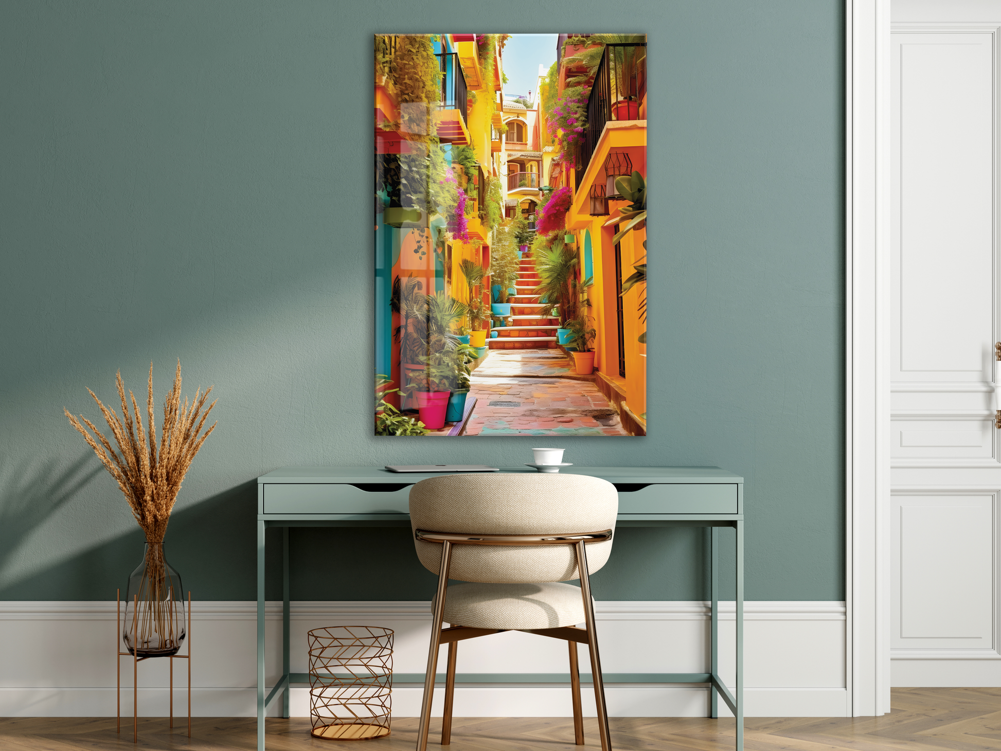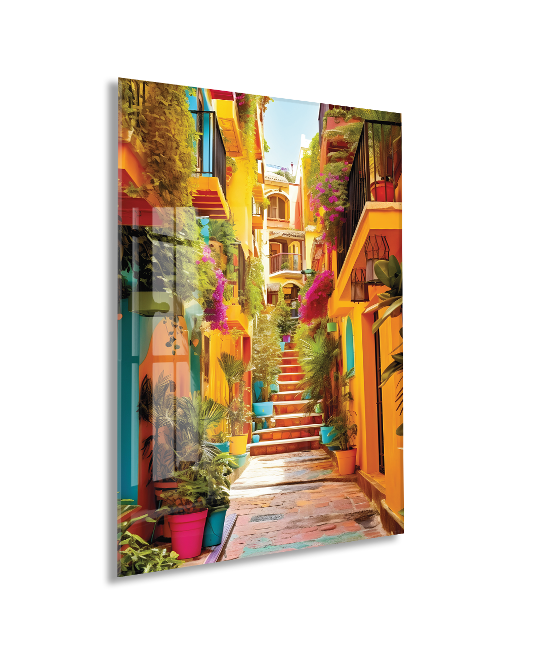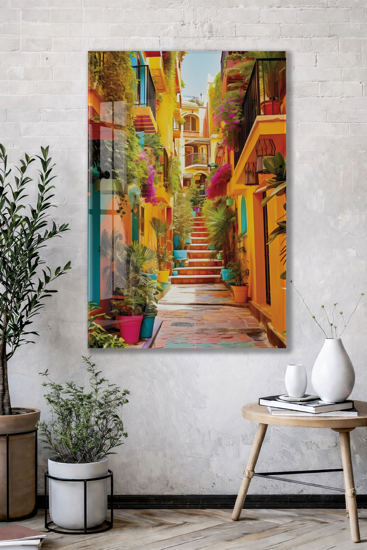 Renkli Akdeniz Sokağı Cam Tablo – Canlı Mimari ve Dar Sokak Temalı Dekoratif Duvar Tablosu - Peony054
