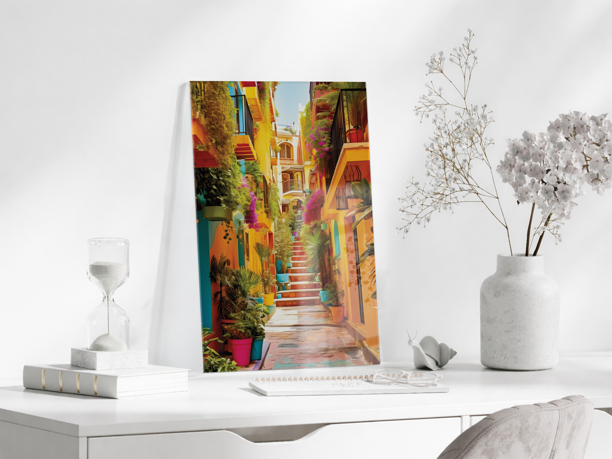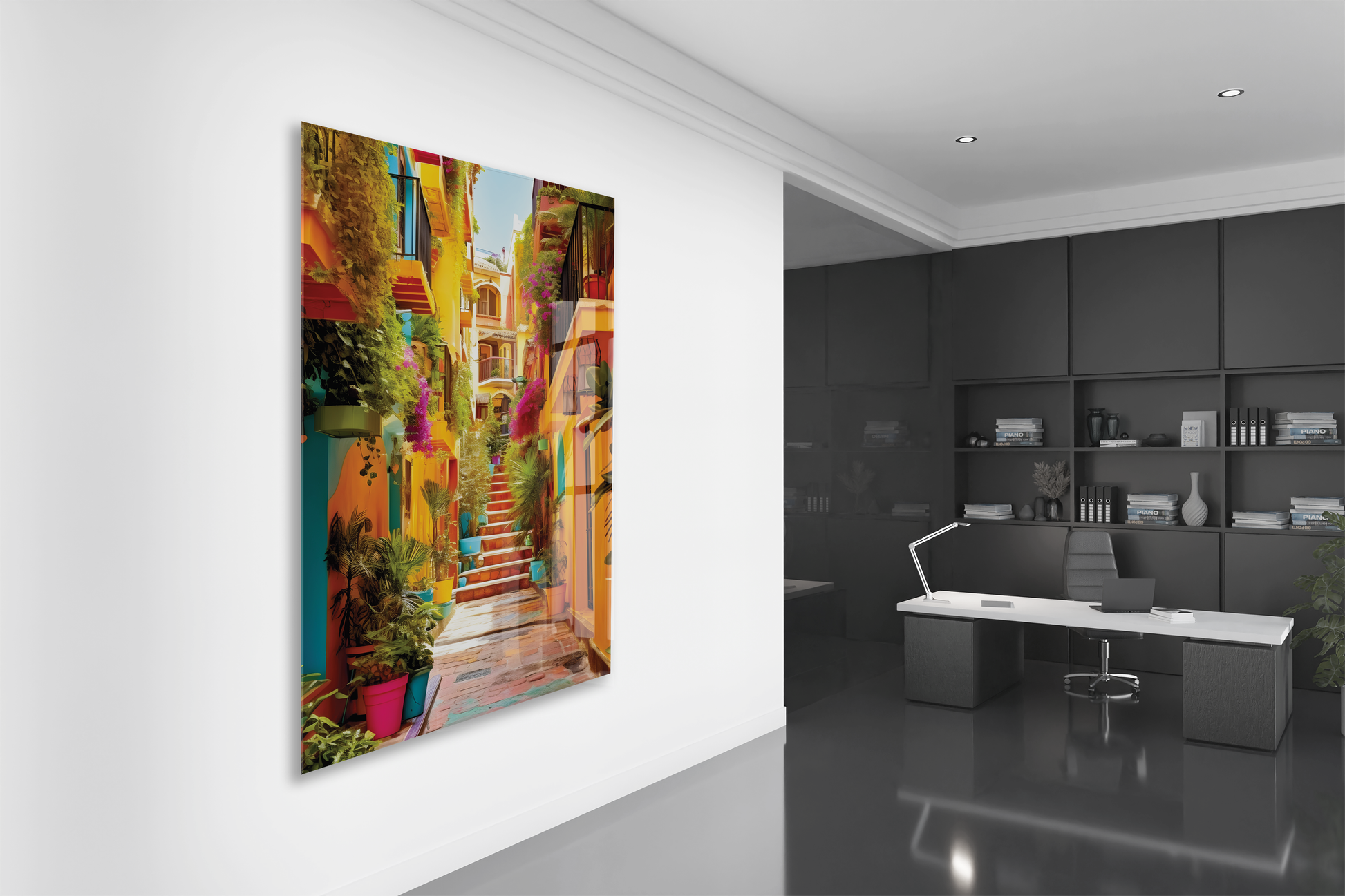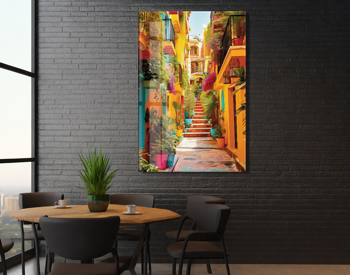 Renkli Akdeniz Sokağı Cam Tablo – Canlı Mimari ve Dar Sokak Temalı Dekoratif Duvar Tablosu - Peony054