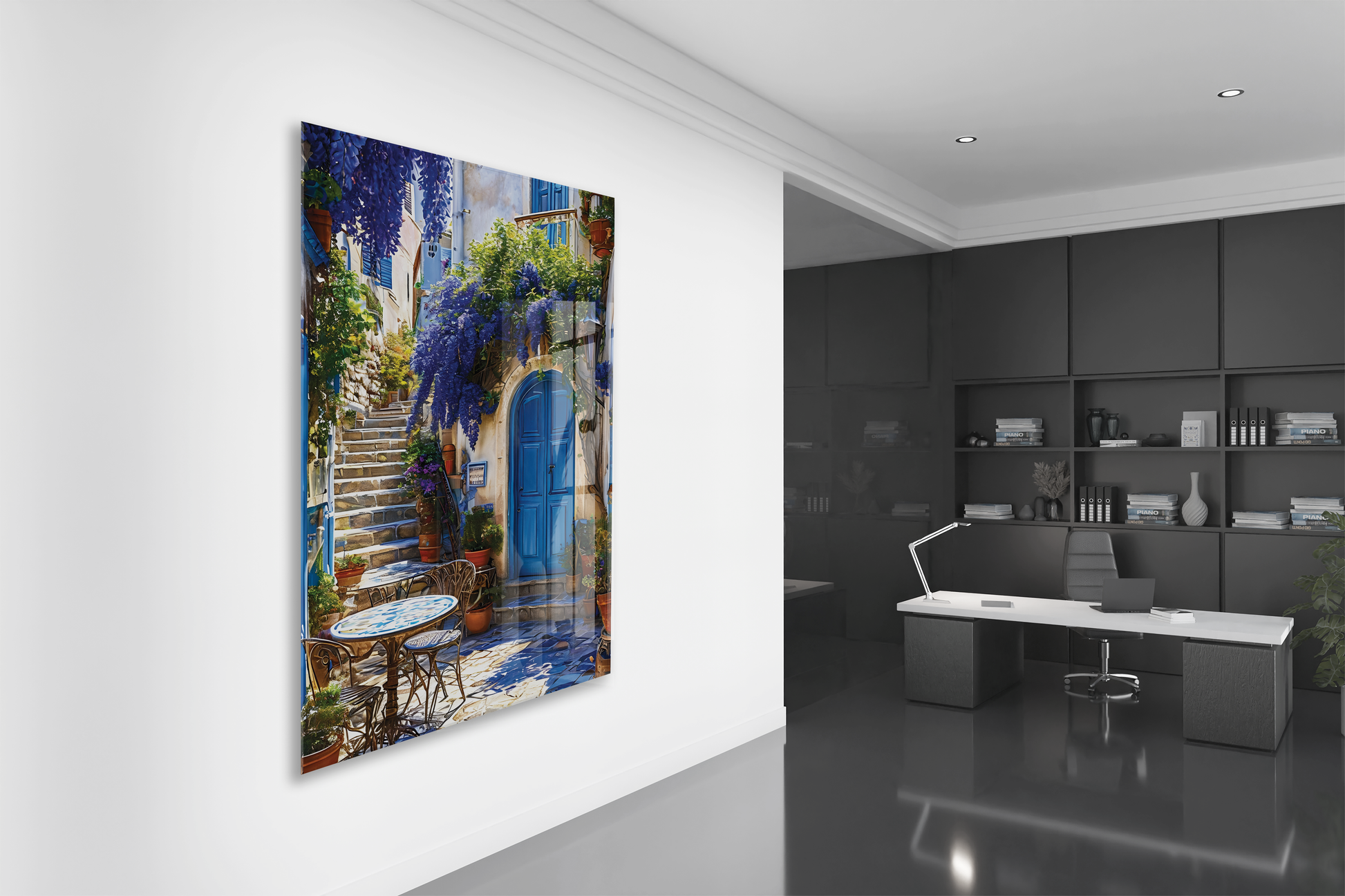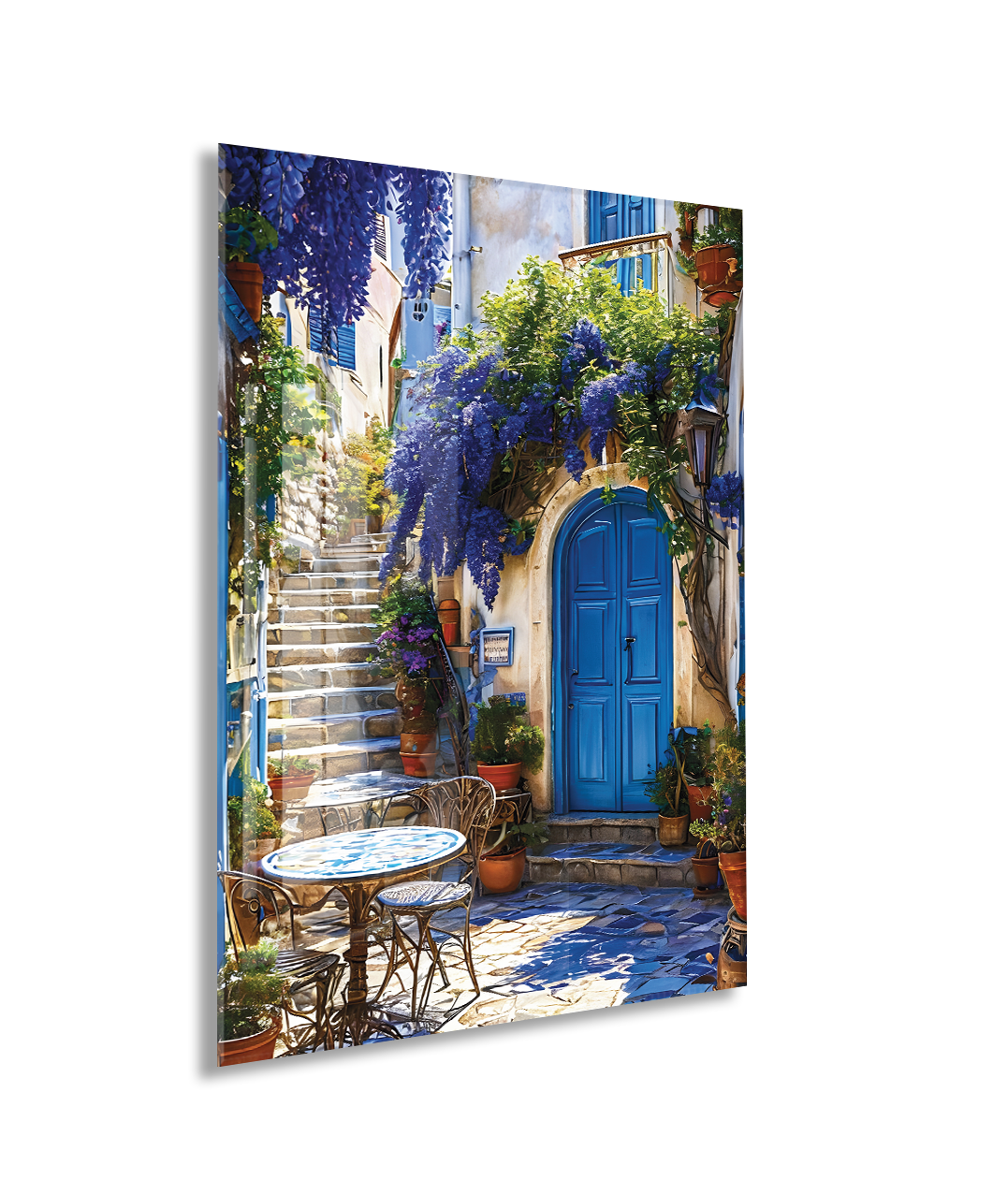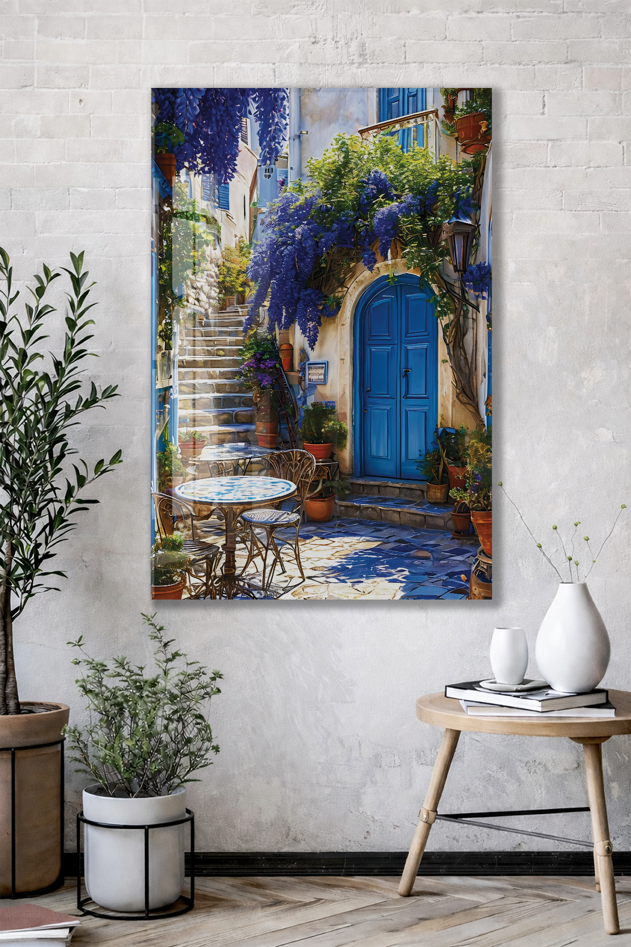 Mavi Kapılı Akdeniz Sokağı Cam Tablo – Çiçekli Taş Merdiven ve Ege Esintili Duvar Dekoru - Peony055