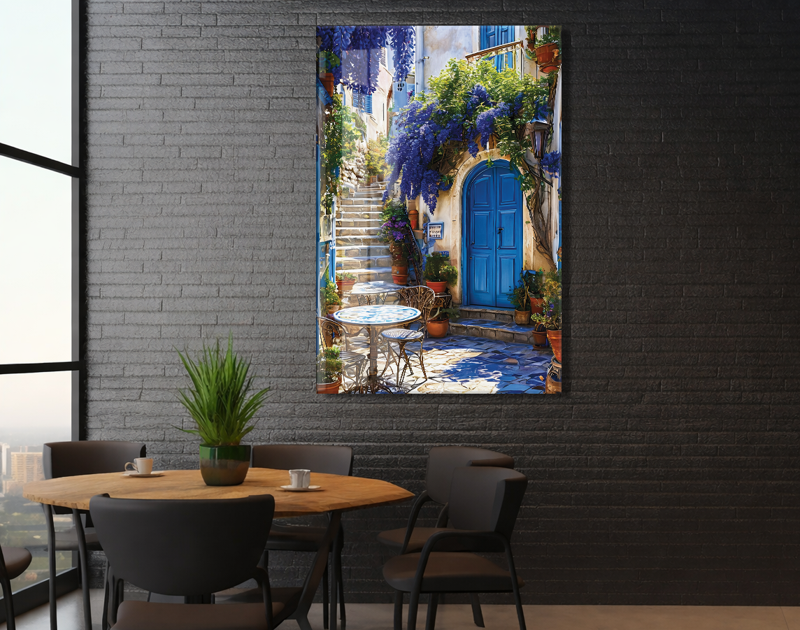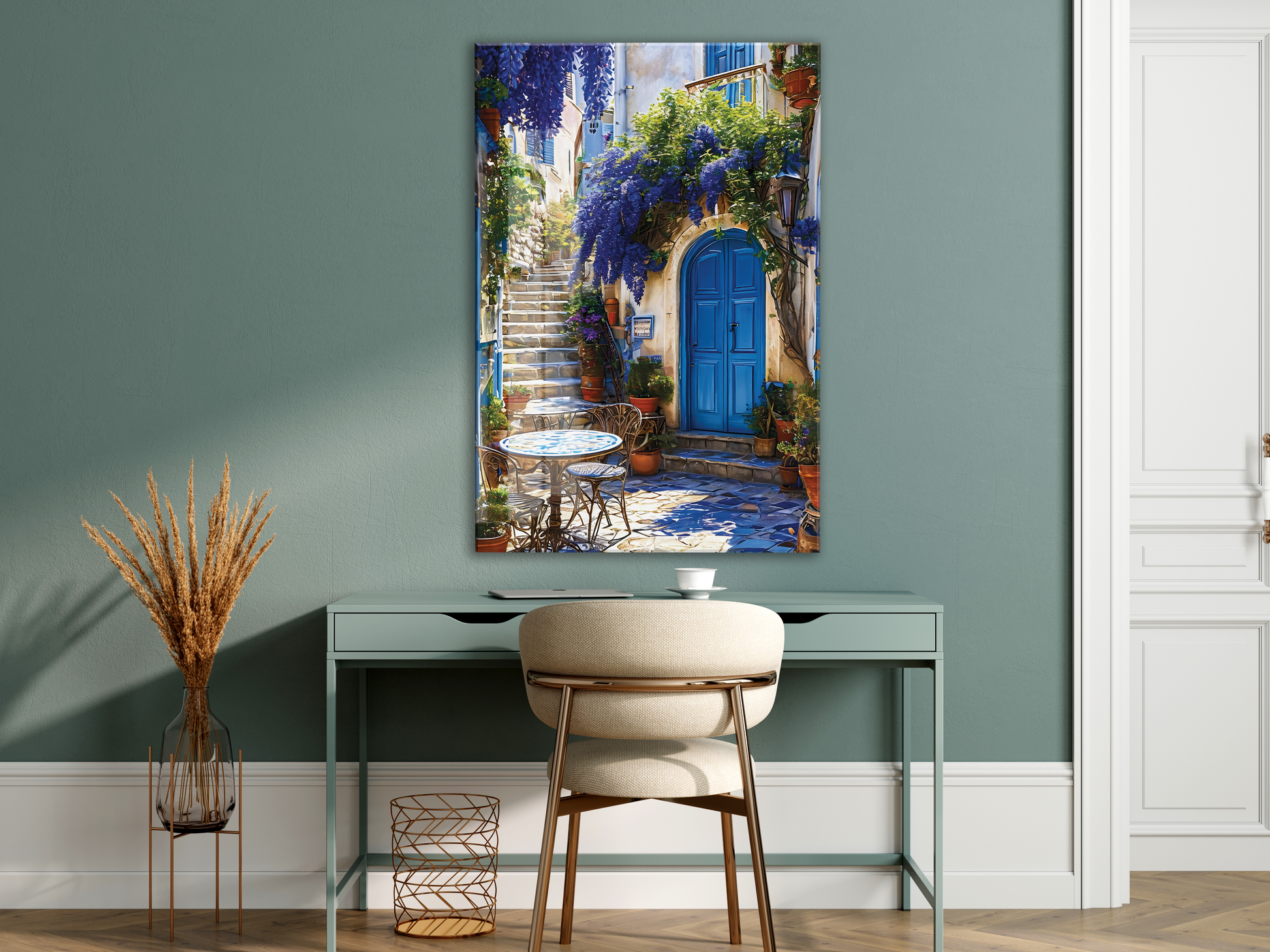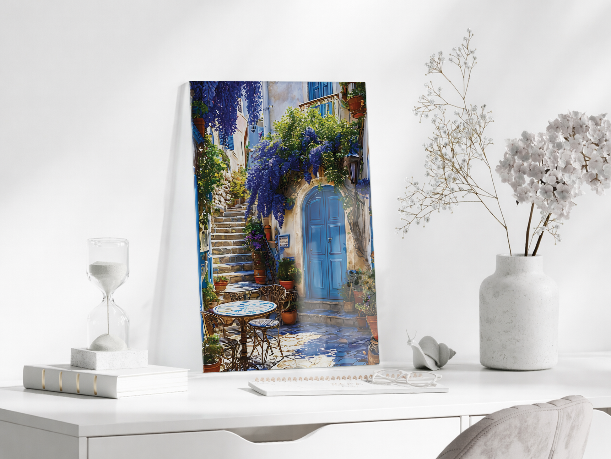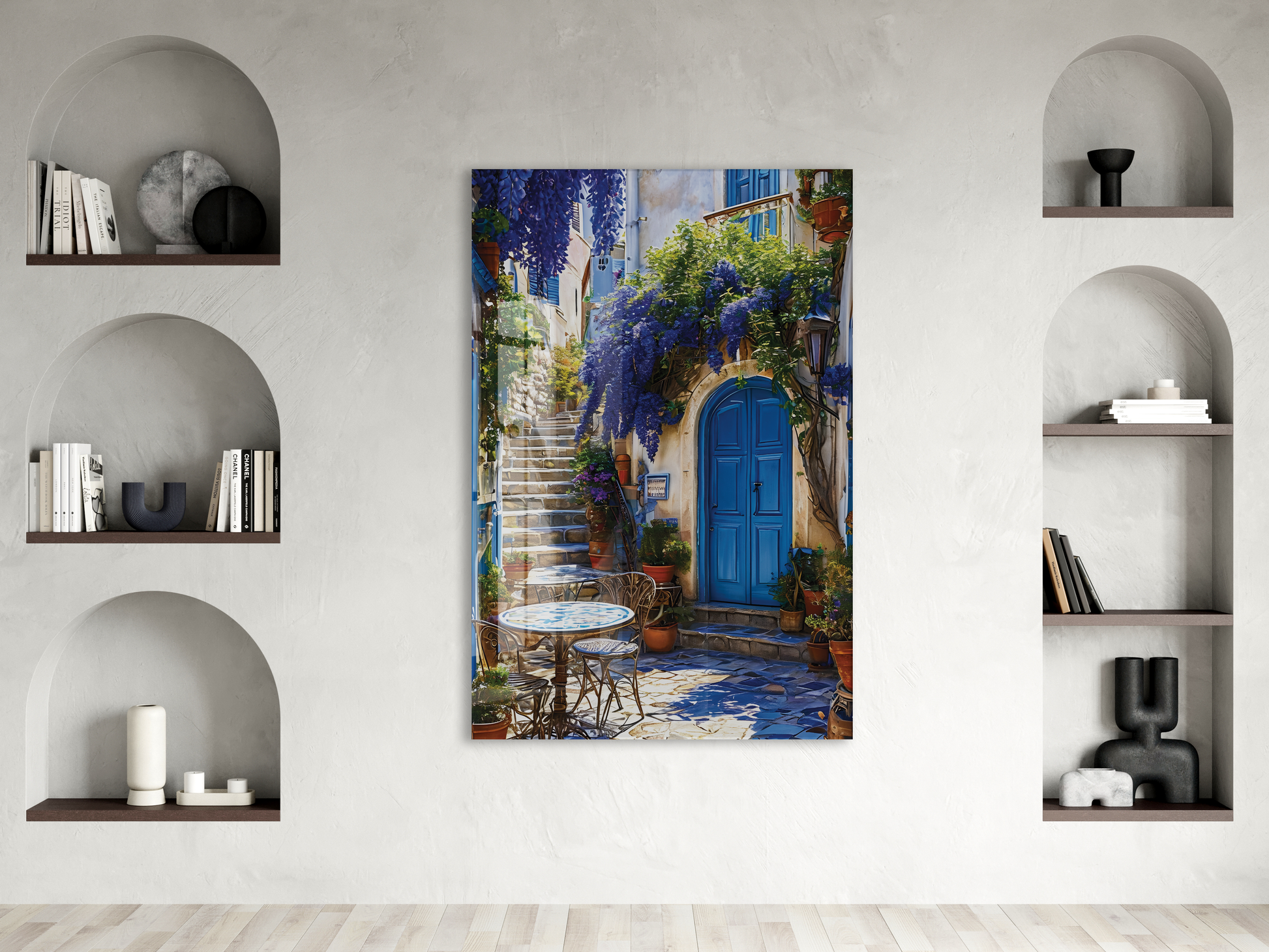 Mavi Kapılı Akdeniz Sokağı Cam Tablo – Çiçekli Taş Merdiven ve Ege Esintili Duvar Dekoru - Peony055