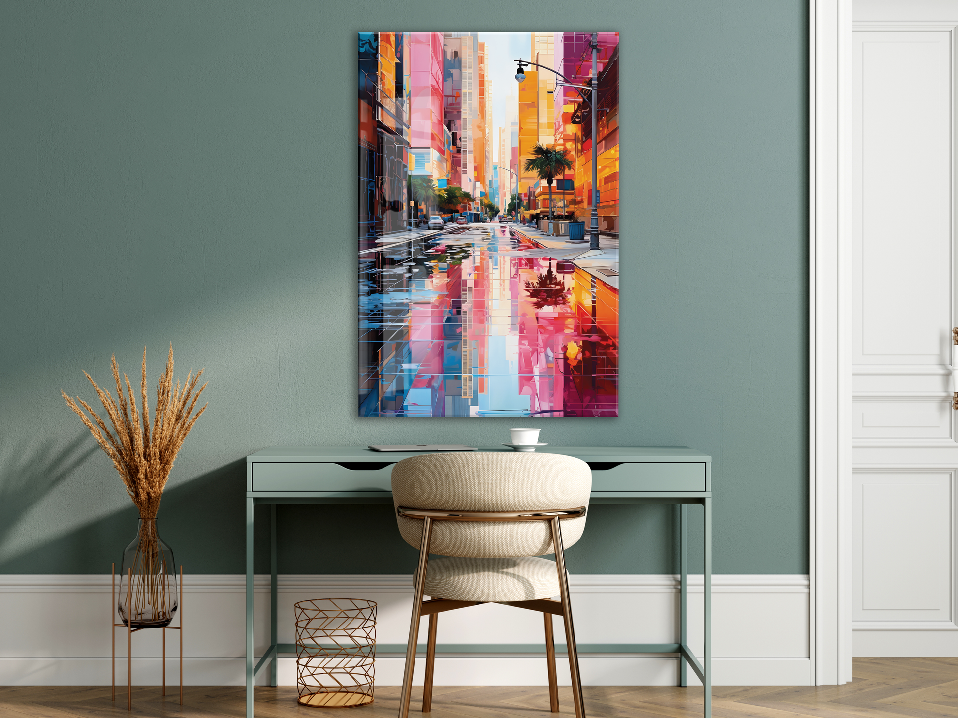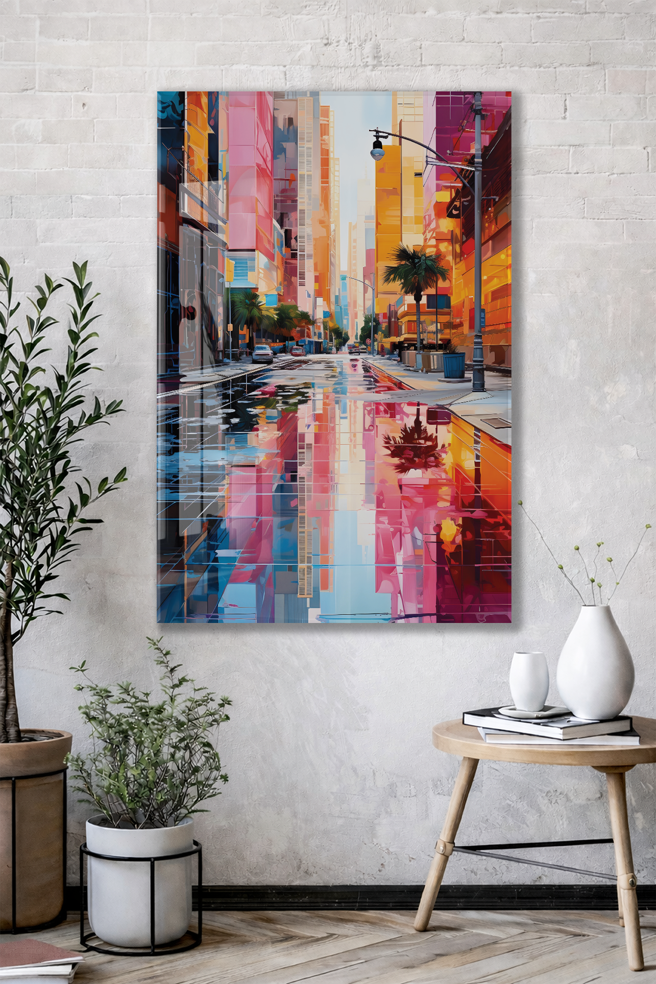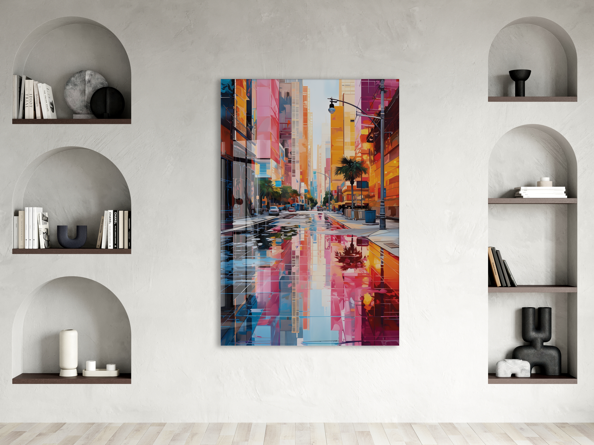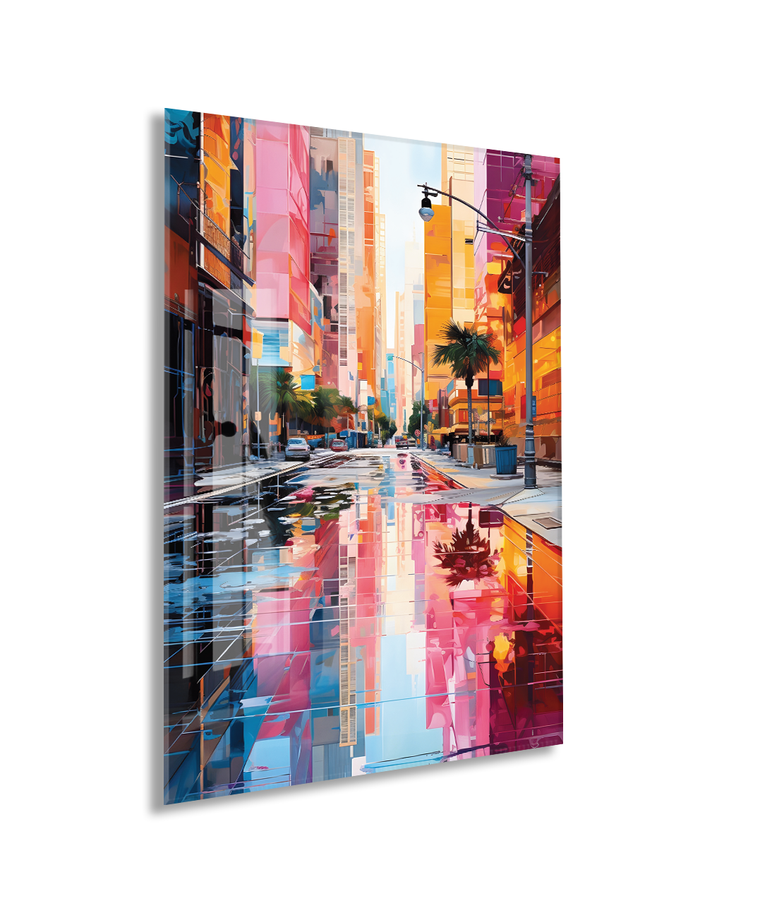 Renkli Modern Şehir Sokağı Cam Tablo – Yansımalı Sokak Manzarası ve Çağdaş Duvar Dekoru - Peony056