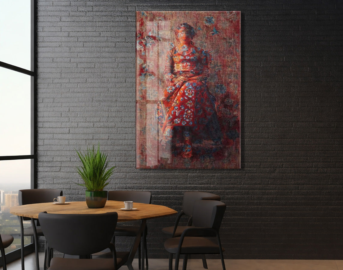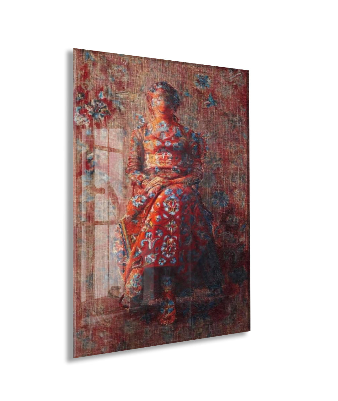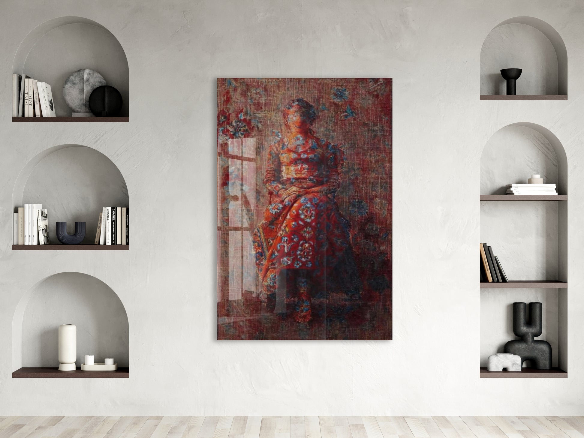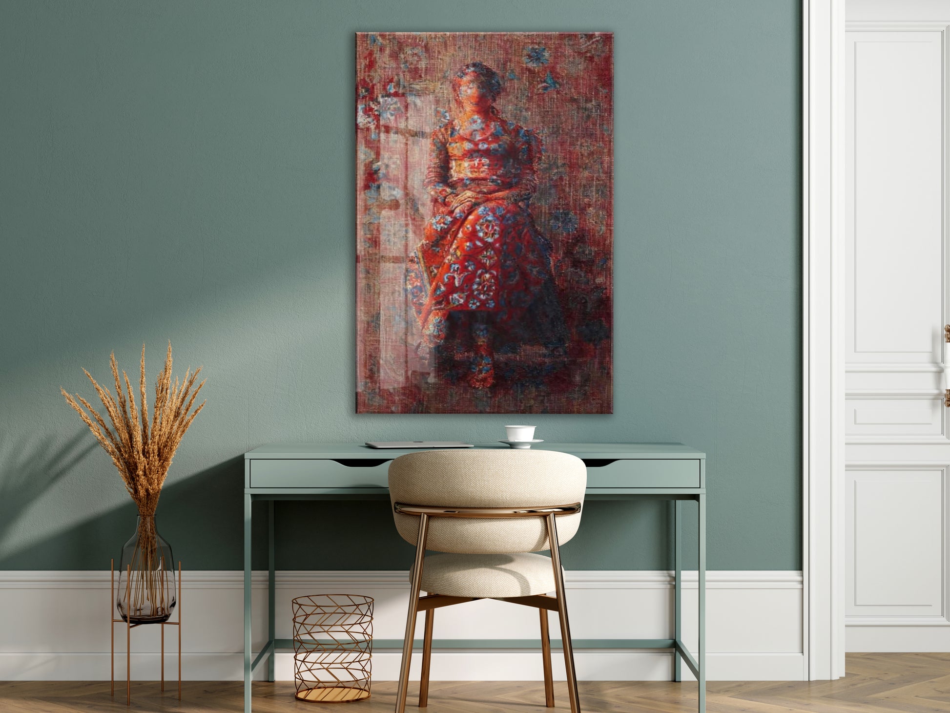 Oryantal Desenli Kırmızı Elbiseli Kadın Figürlü Cam Tablo – Sanatsal ve Vintage Duvar Dekoru - Peony059
