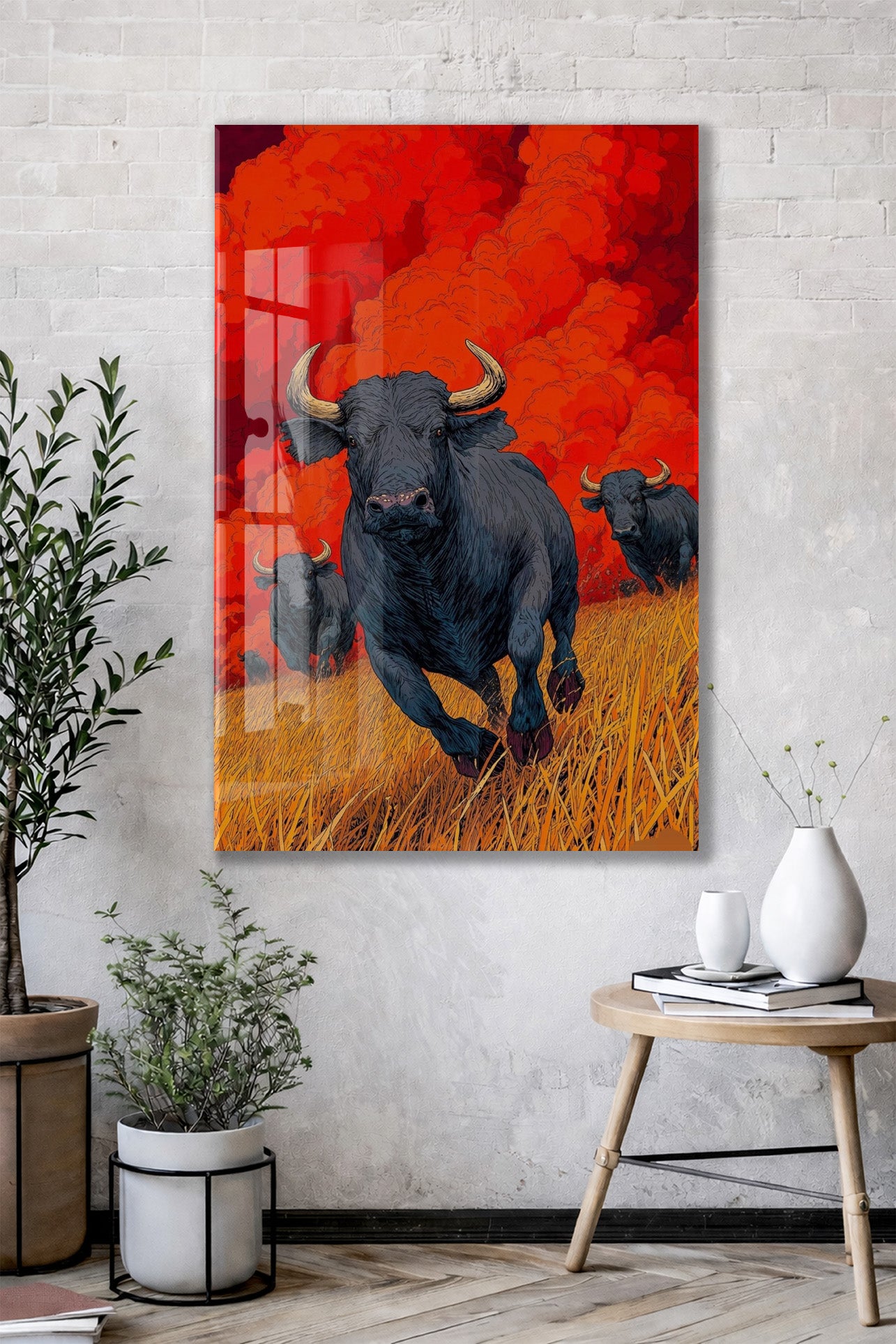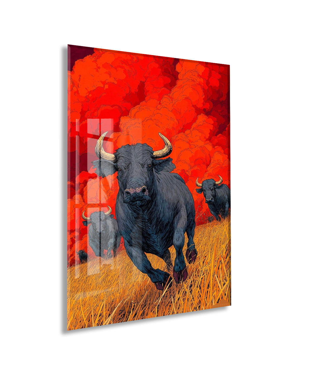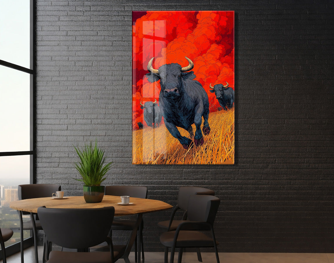 Koşan Boğa Figürlü Cam Tablo – Kırmızı Arka Planlı Modern Güç Temalı Duvar Dekoru - Peony074