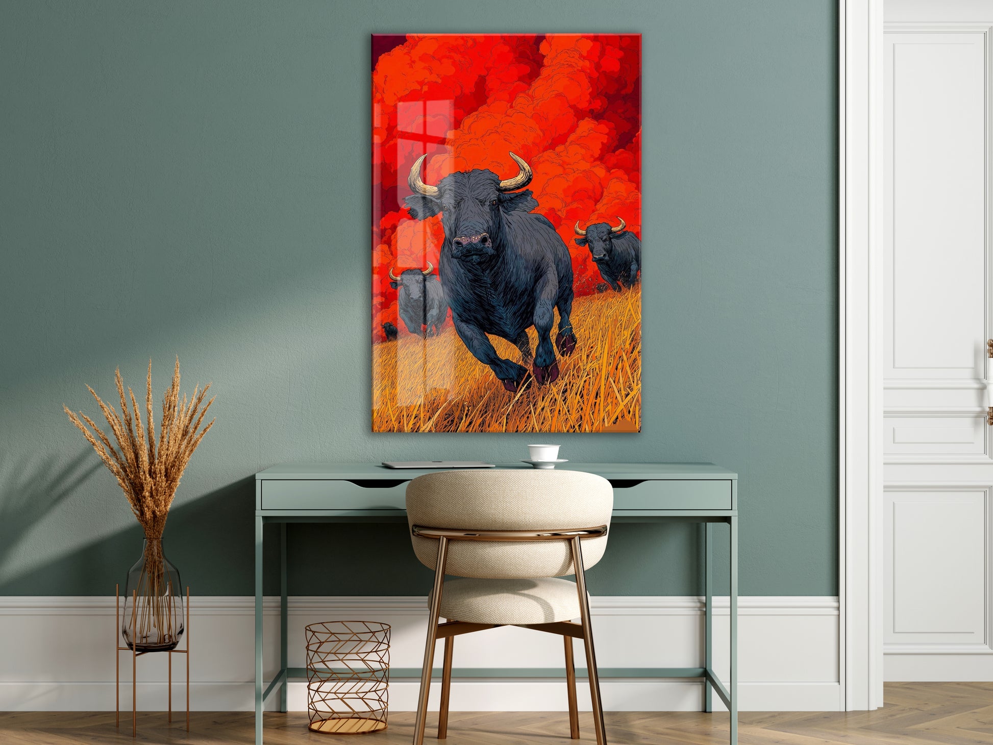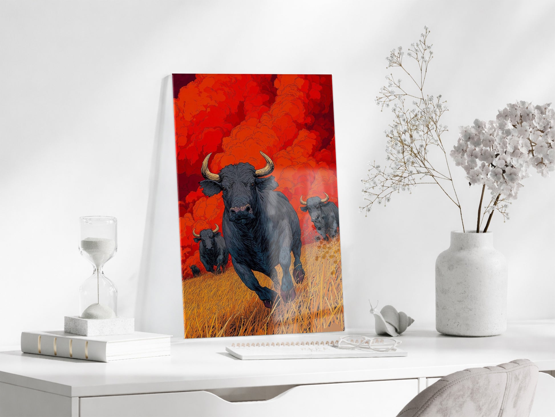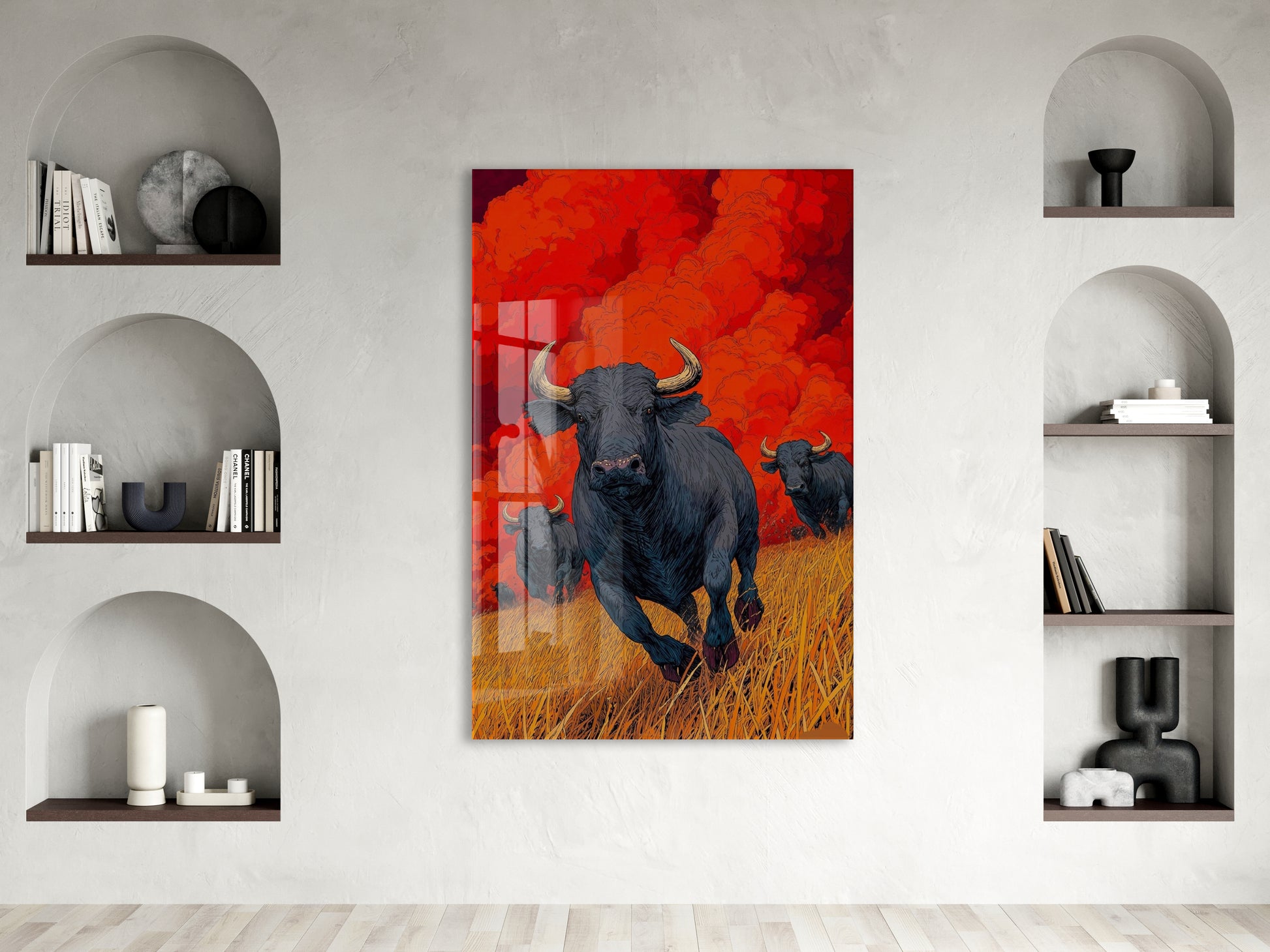 Koşan Boğa Figürlü Cam Tablo – Kırmızı Arka Planlı Modern Güç Temalı Duvar Dekoru - Peony074