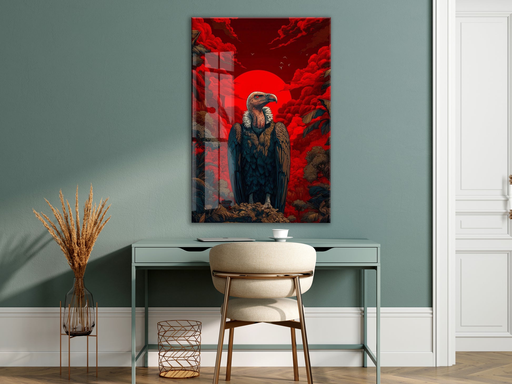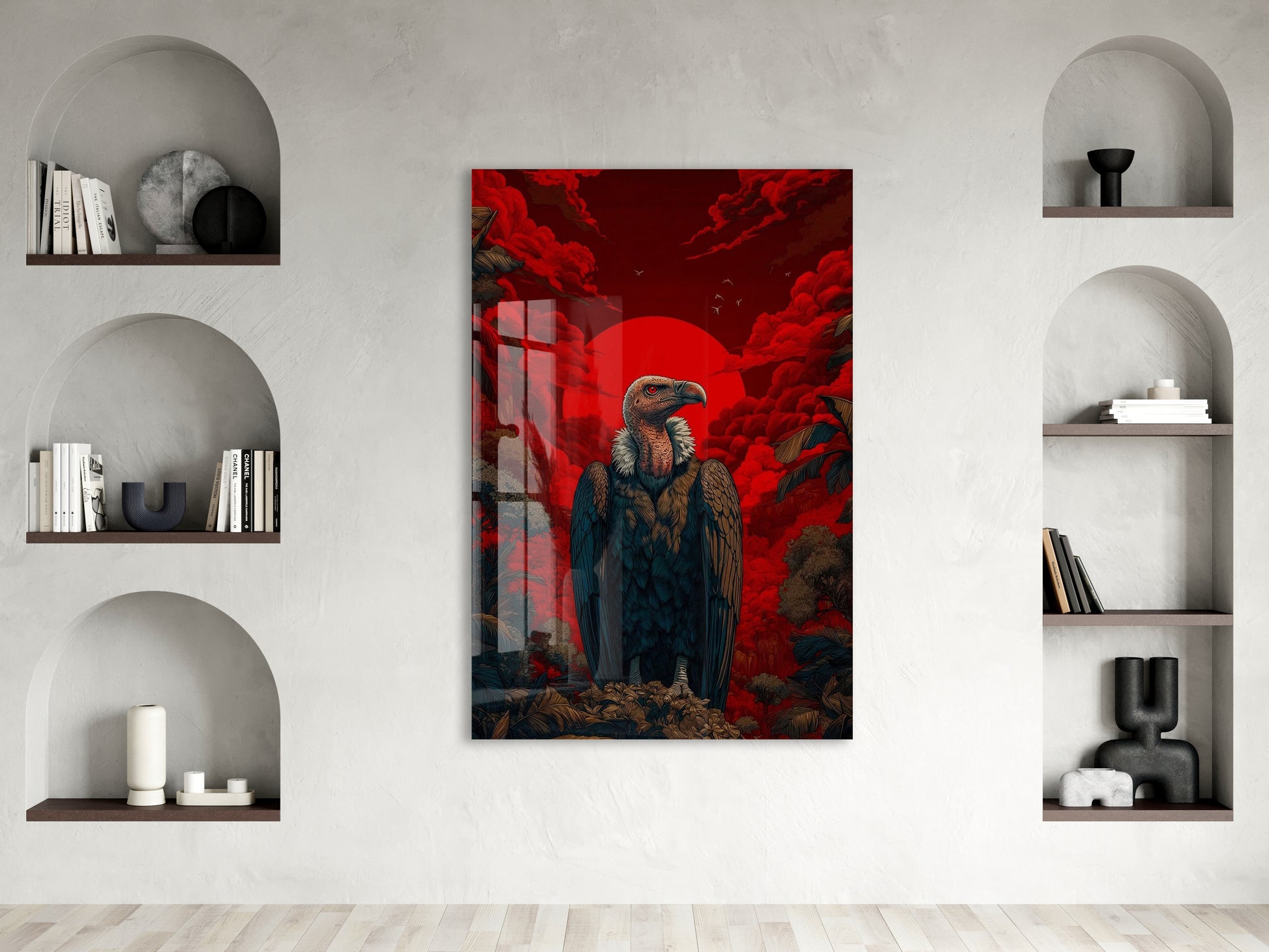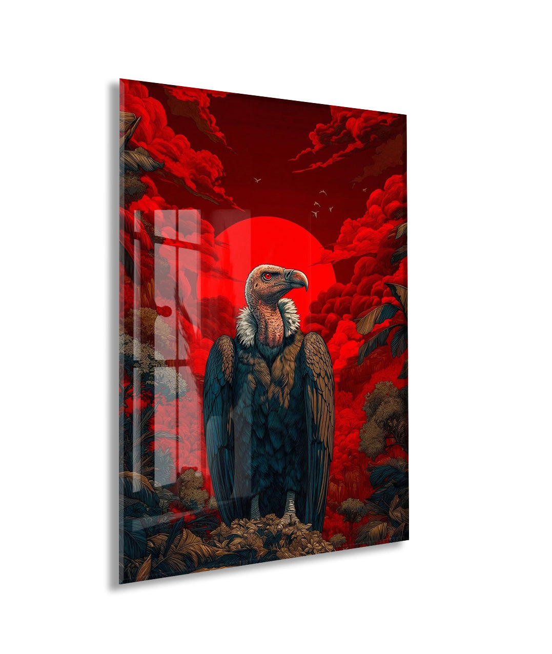 Kızıl Güneş Fonlu Akbaba Cam Tablo – Güç ve Hakimiyet Temalı Modern Duvar Dekoru - Peony079