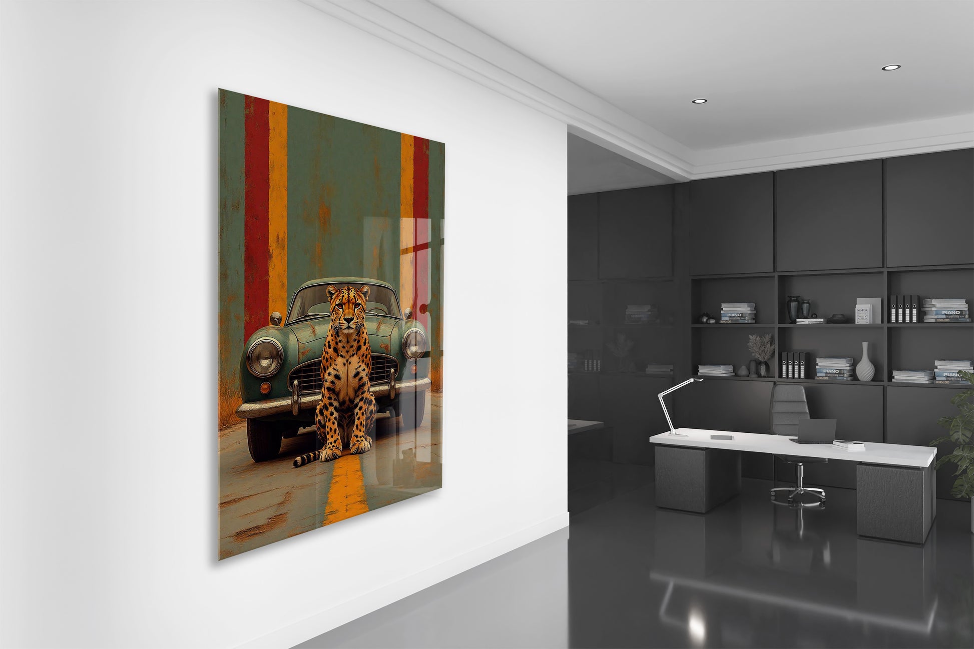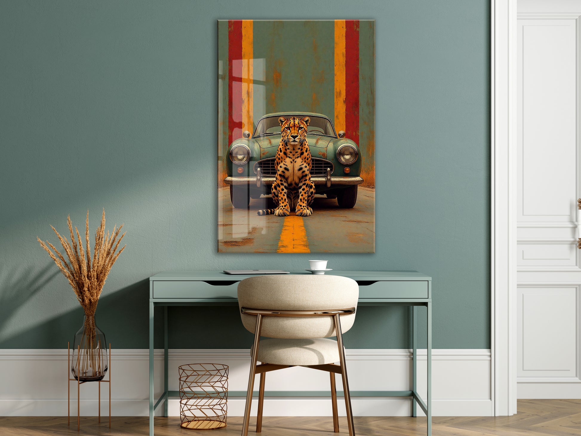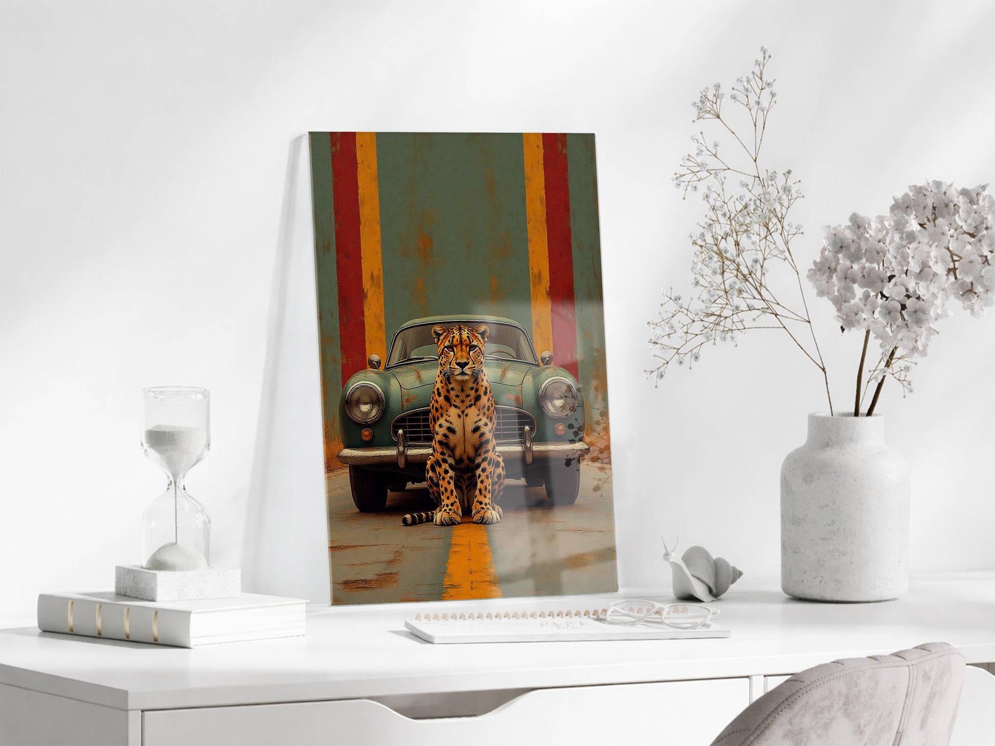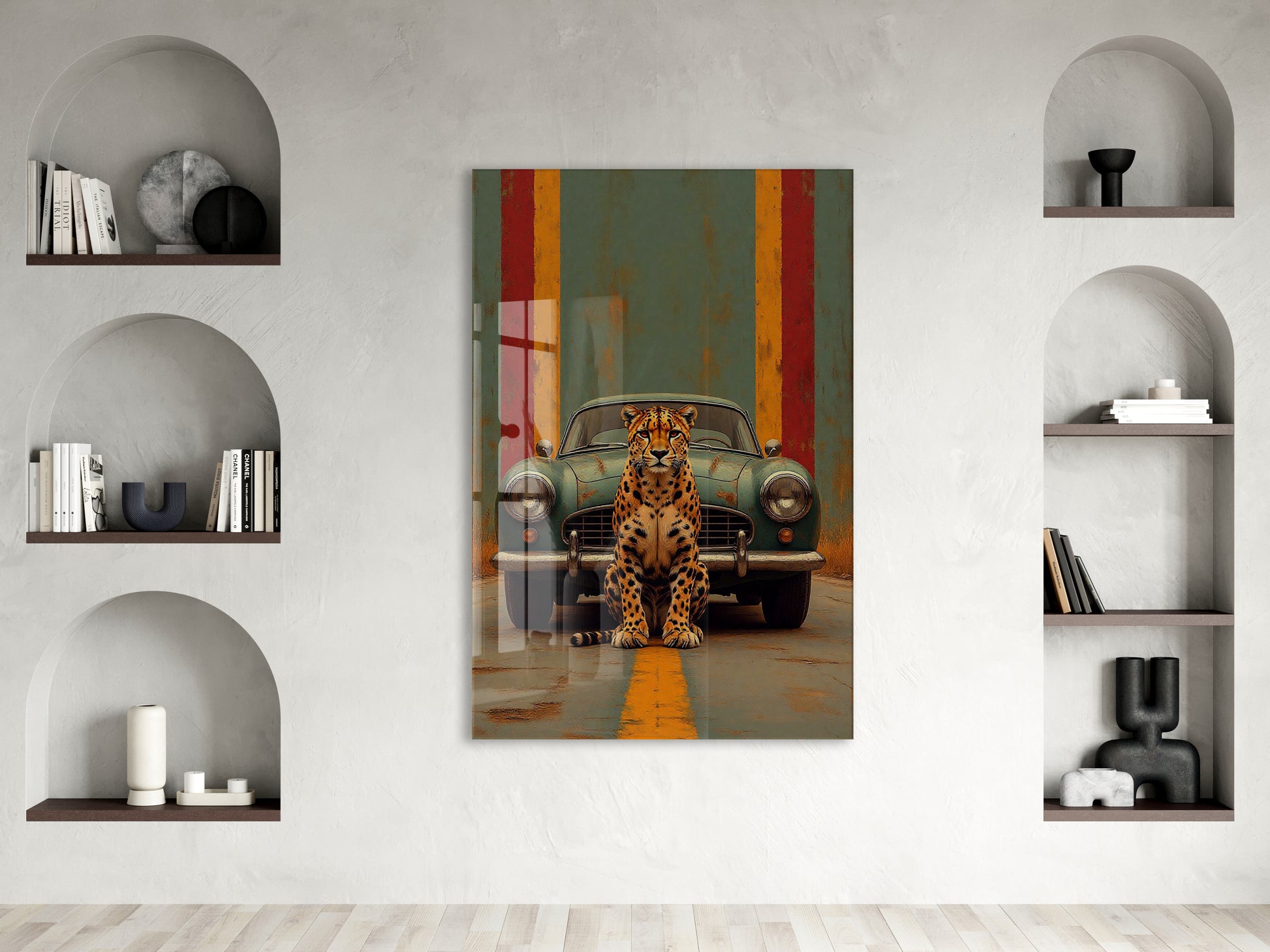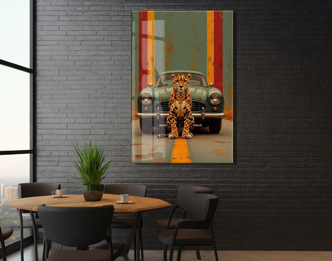 Klasik Otomobil ve Leopar Cam Tablo – Modern Urban Duvar Sanatı - Peony087