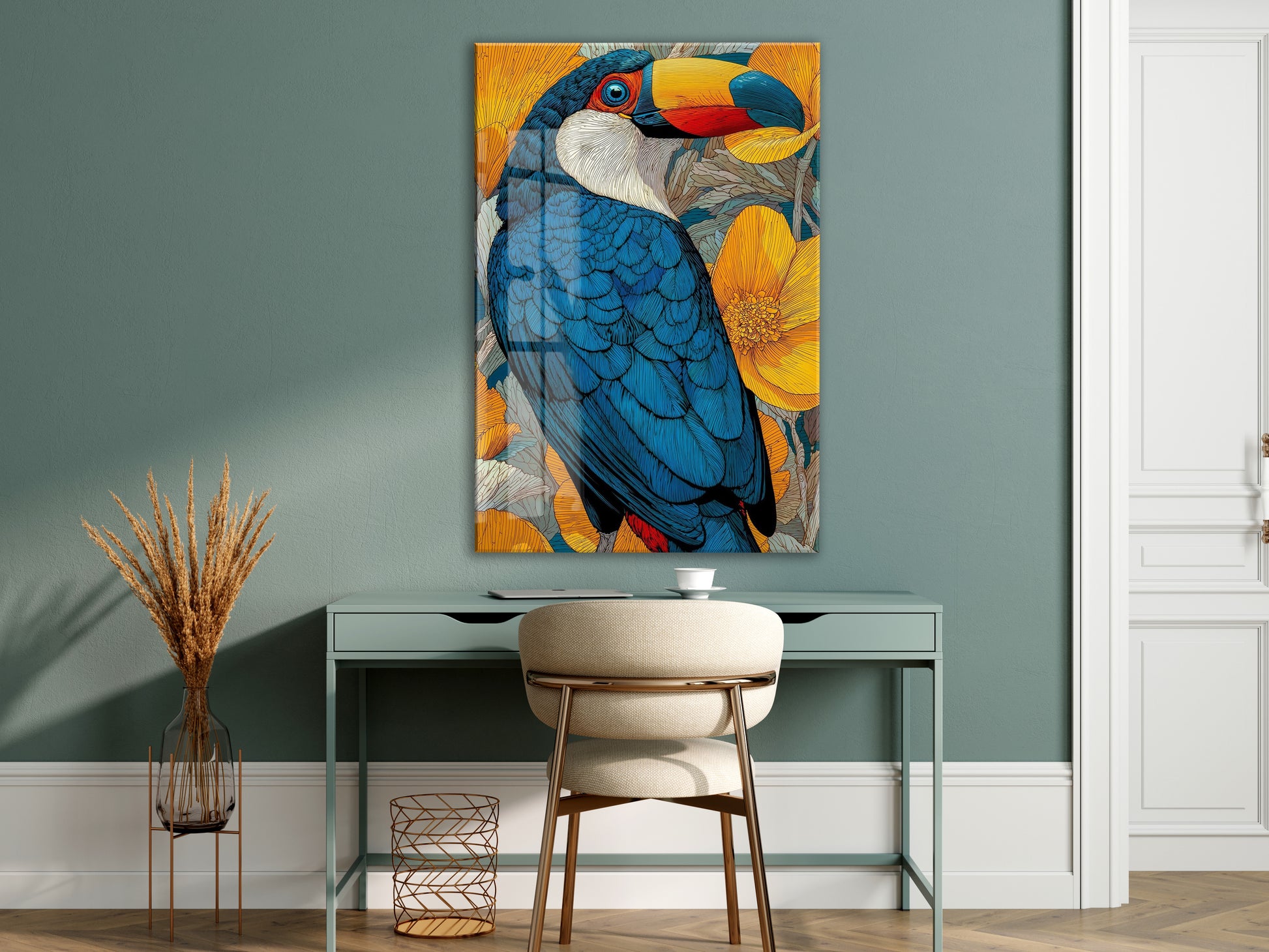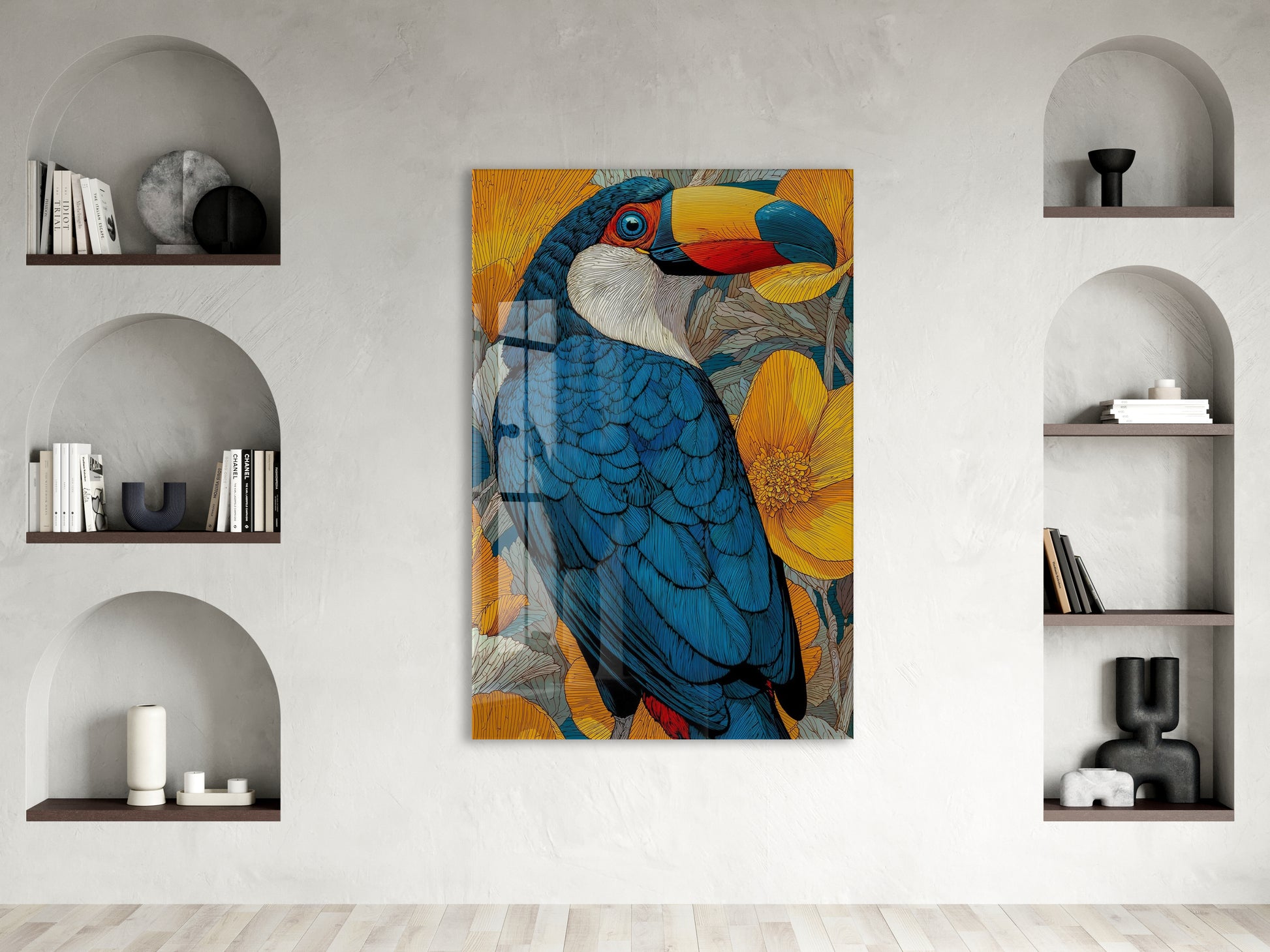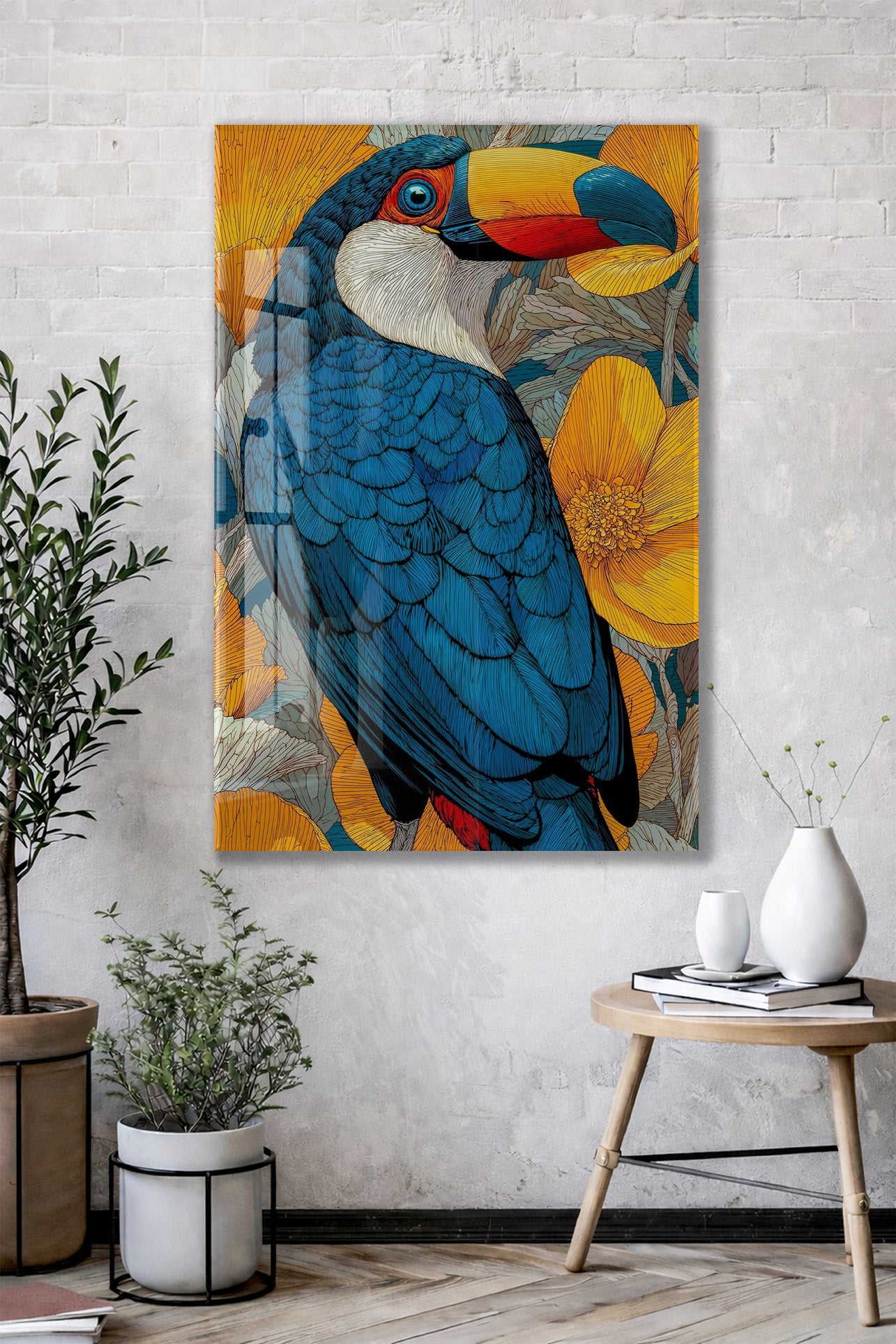 Renkli Tukan Kuşu Cam Duvar Tablosu – Tropikal Çiçekli Modern Tasarım- Peony117