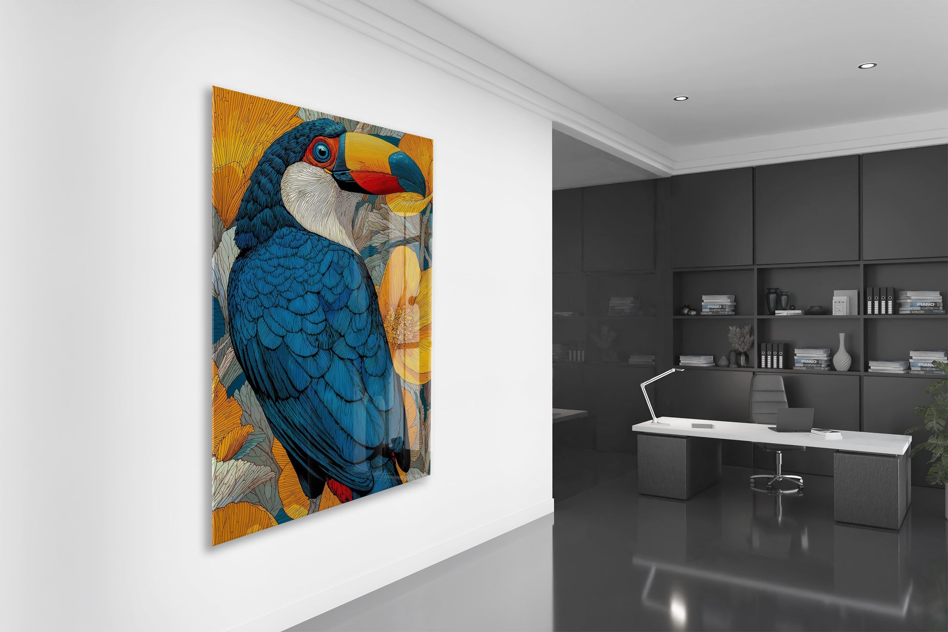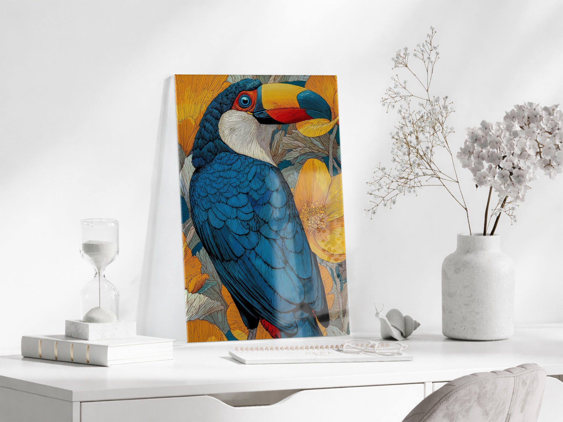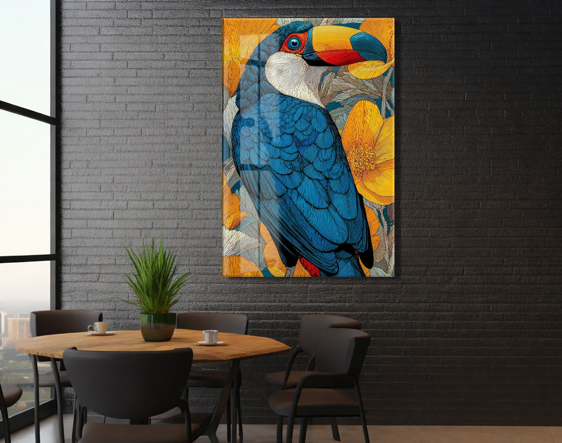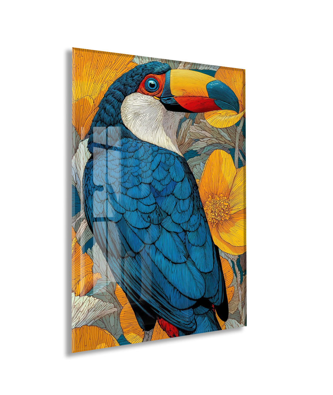 Renkli Tukan Kuşu Cam Duvar Tablosu – Tropikal Çiçekli Modern Tasarım- Peony117