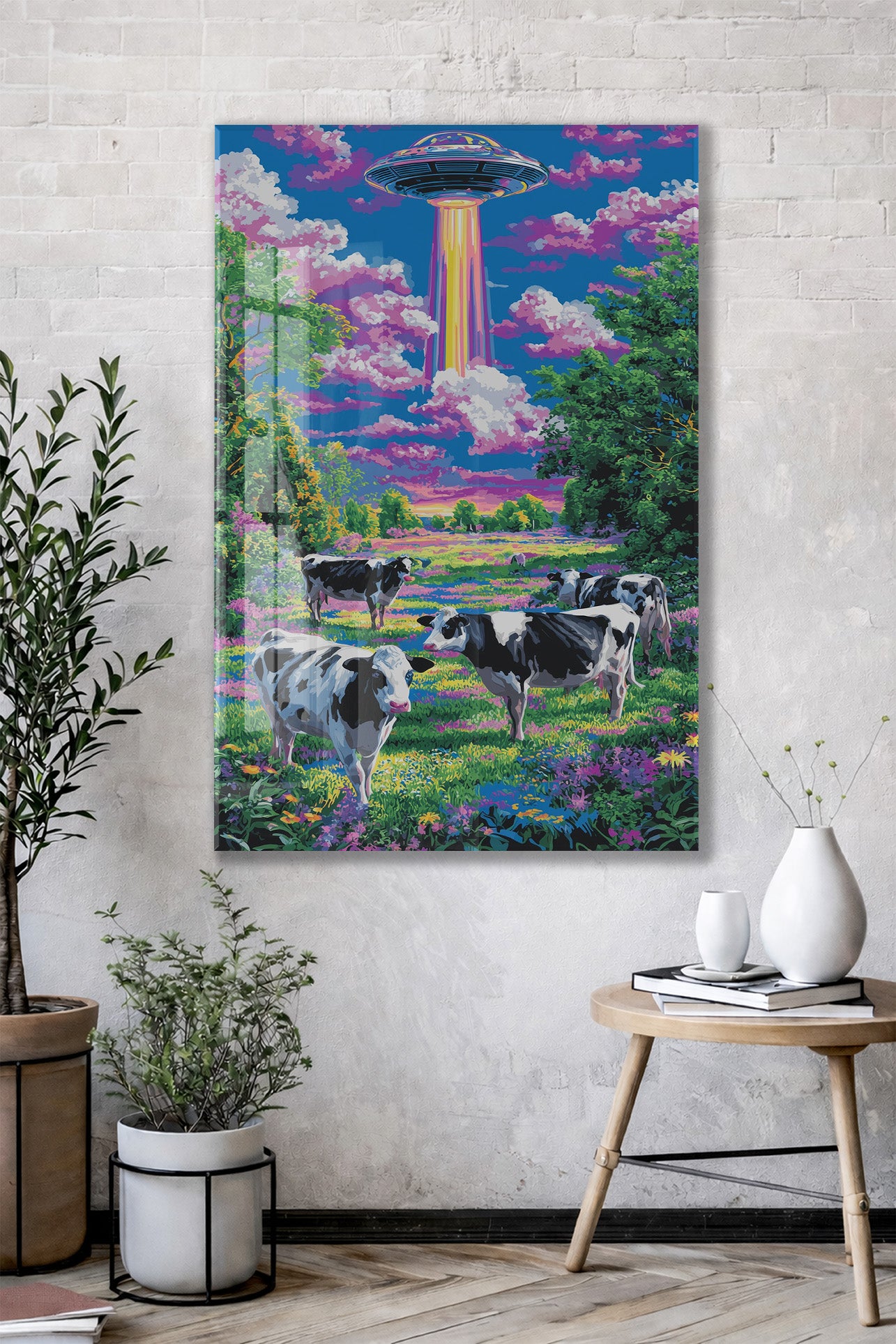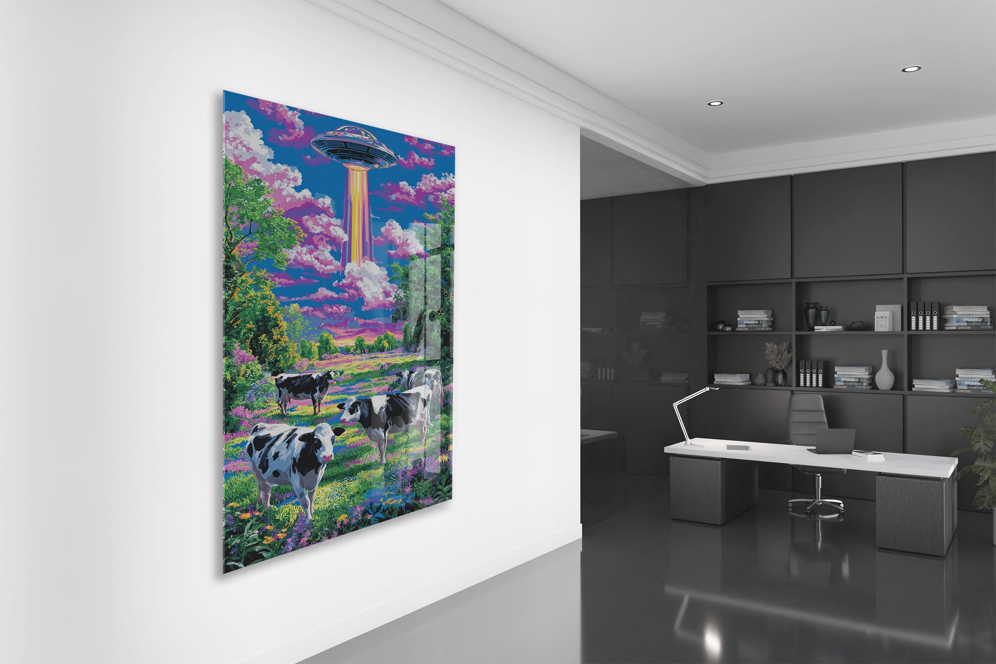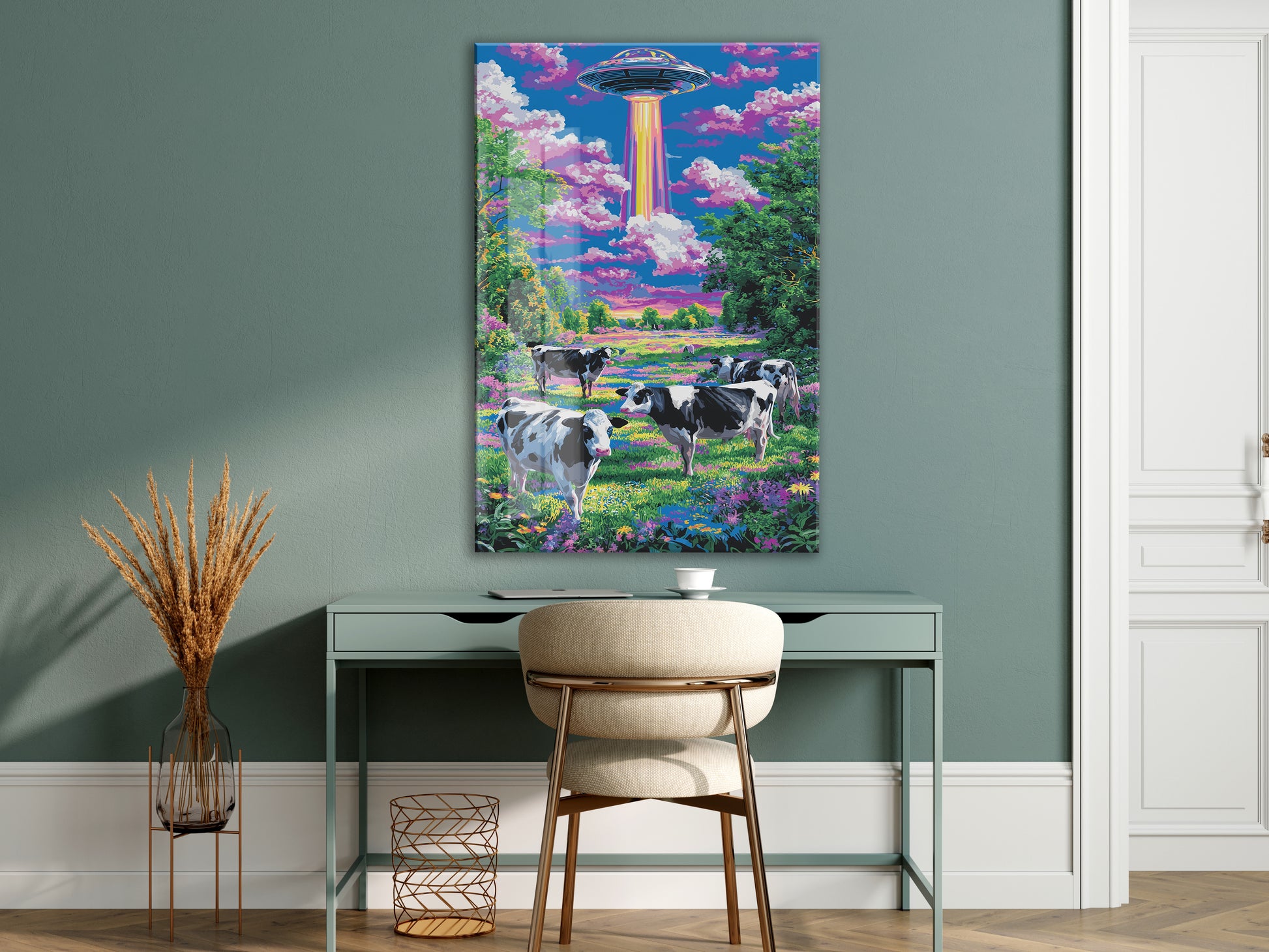 UFO ve Renkli Tarlada İnekler – Fantastik Manzara Duvar Tablosu - Peony128