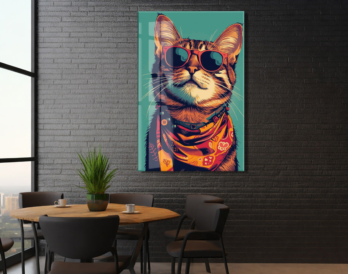 Gözlüklü Hipster Kedi Cam Duvar Tablosu – Modern ve Cool Tasarım - Peony129