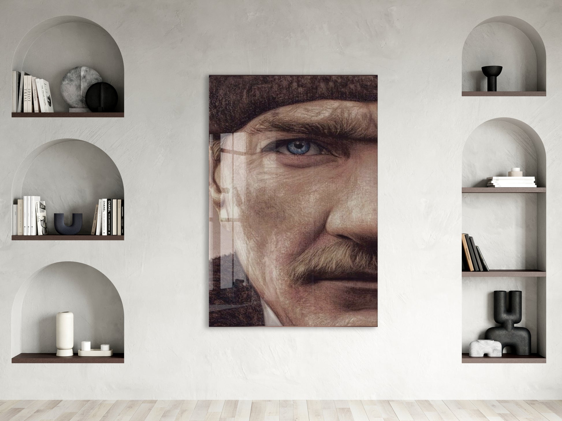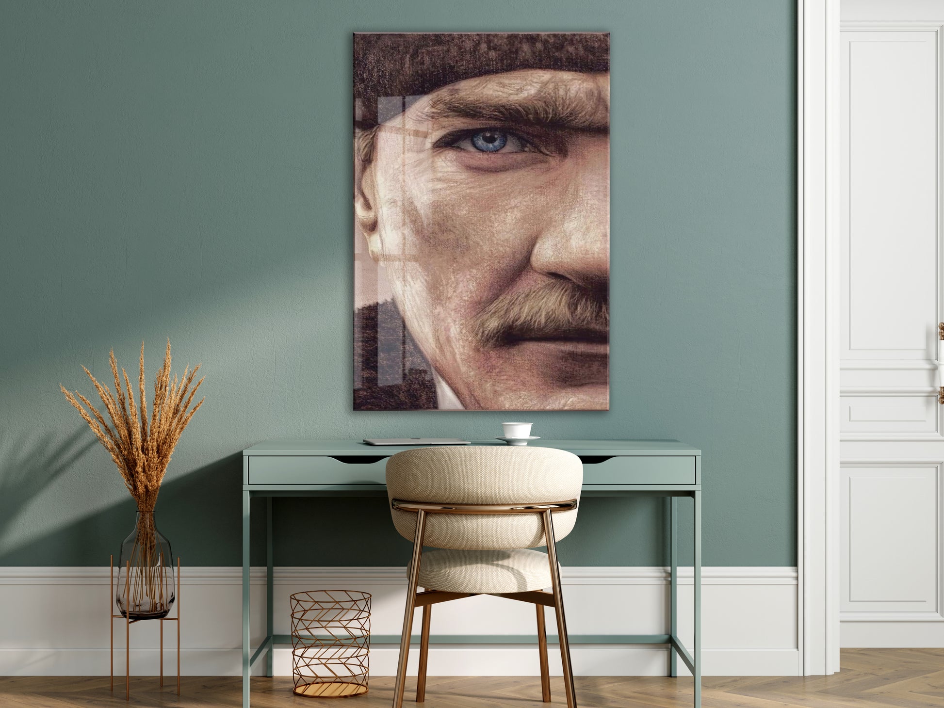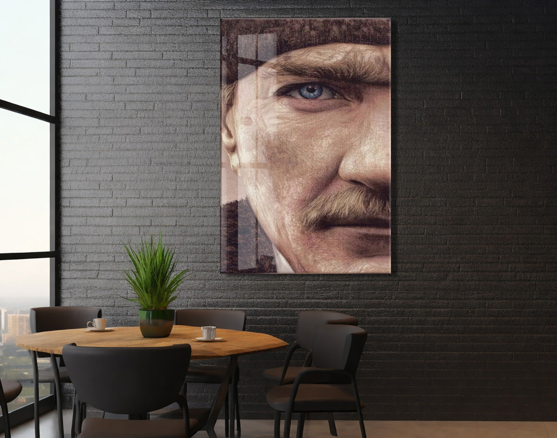 Atatürk Mavi Göz Detayı Cam Tablo – 4 mm Temperli Cam, Sanatsal Portre Duvar Dekoru -PeonyAta053
