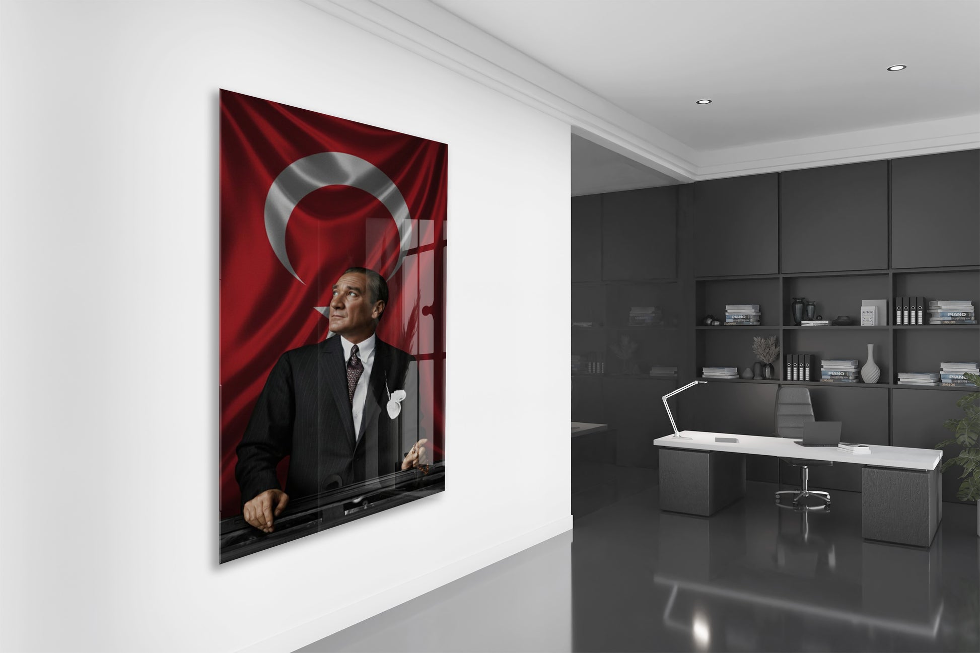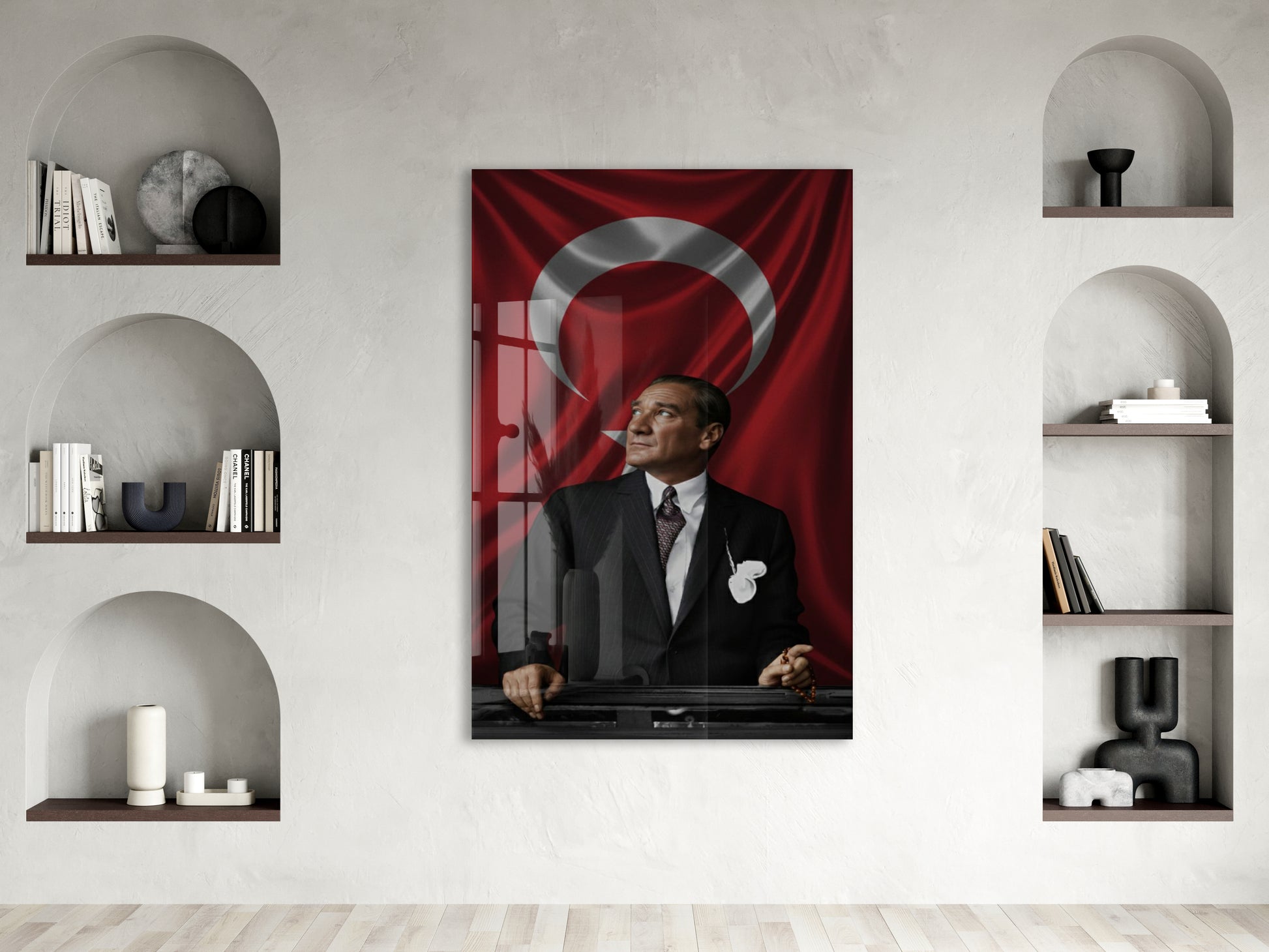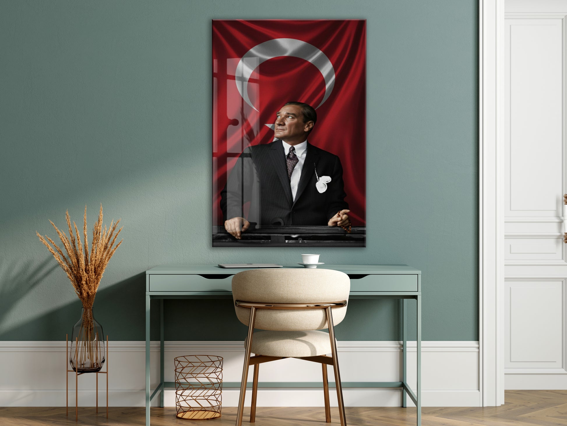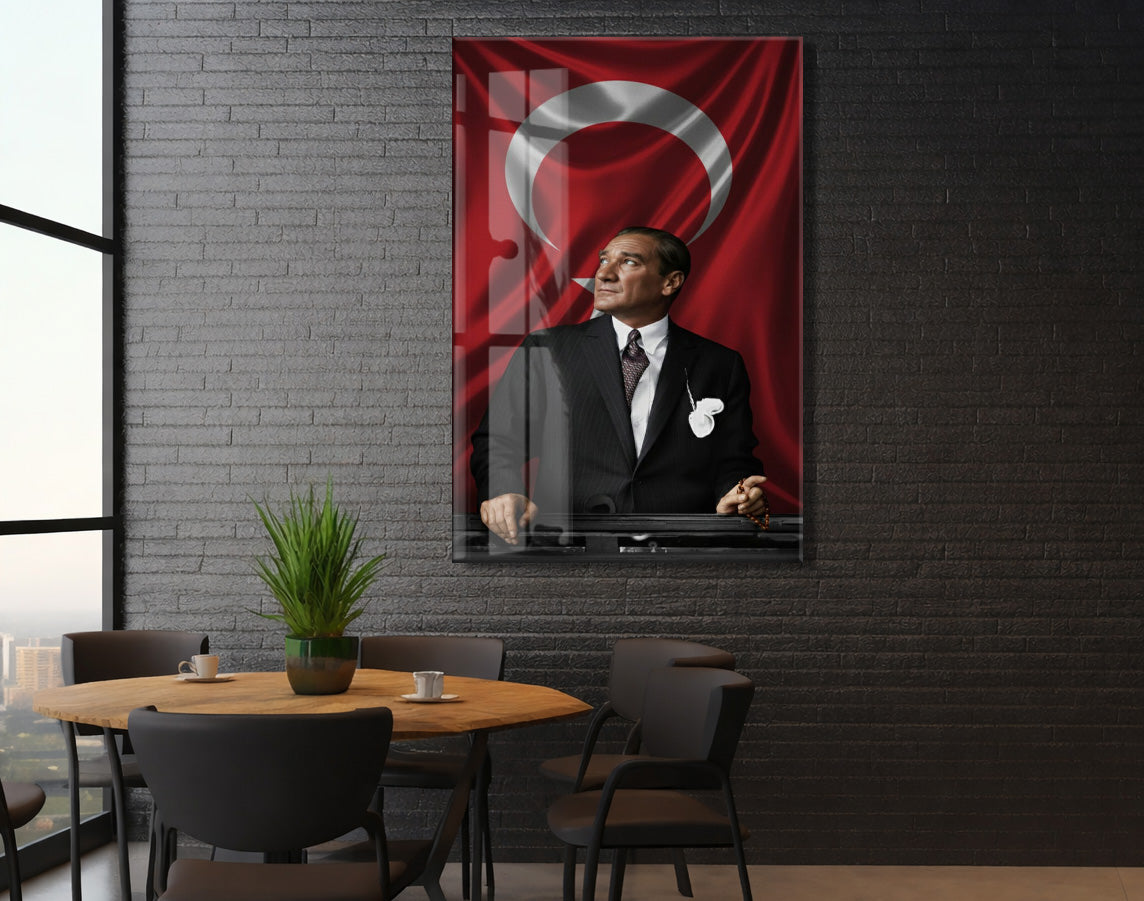 Atatürk Türk Bayrağı Önünde Cam Tablo – Devlet Adamlığı ve Liderlik Temalı 4 mm Temperli Cam-PeonyAta057