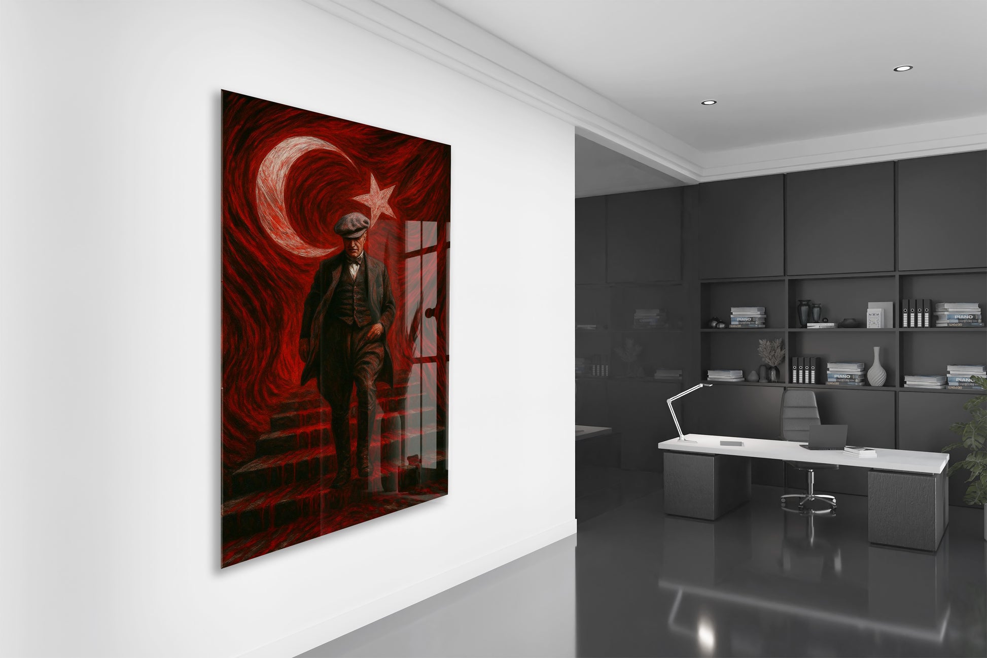 Atatürk Sanatsal Cam Tablo – Ay Yıldızlı Kırmızı Fonlu Devrim Temalı Duvar Sanatı -PeonyAta062