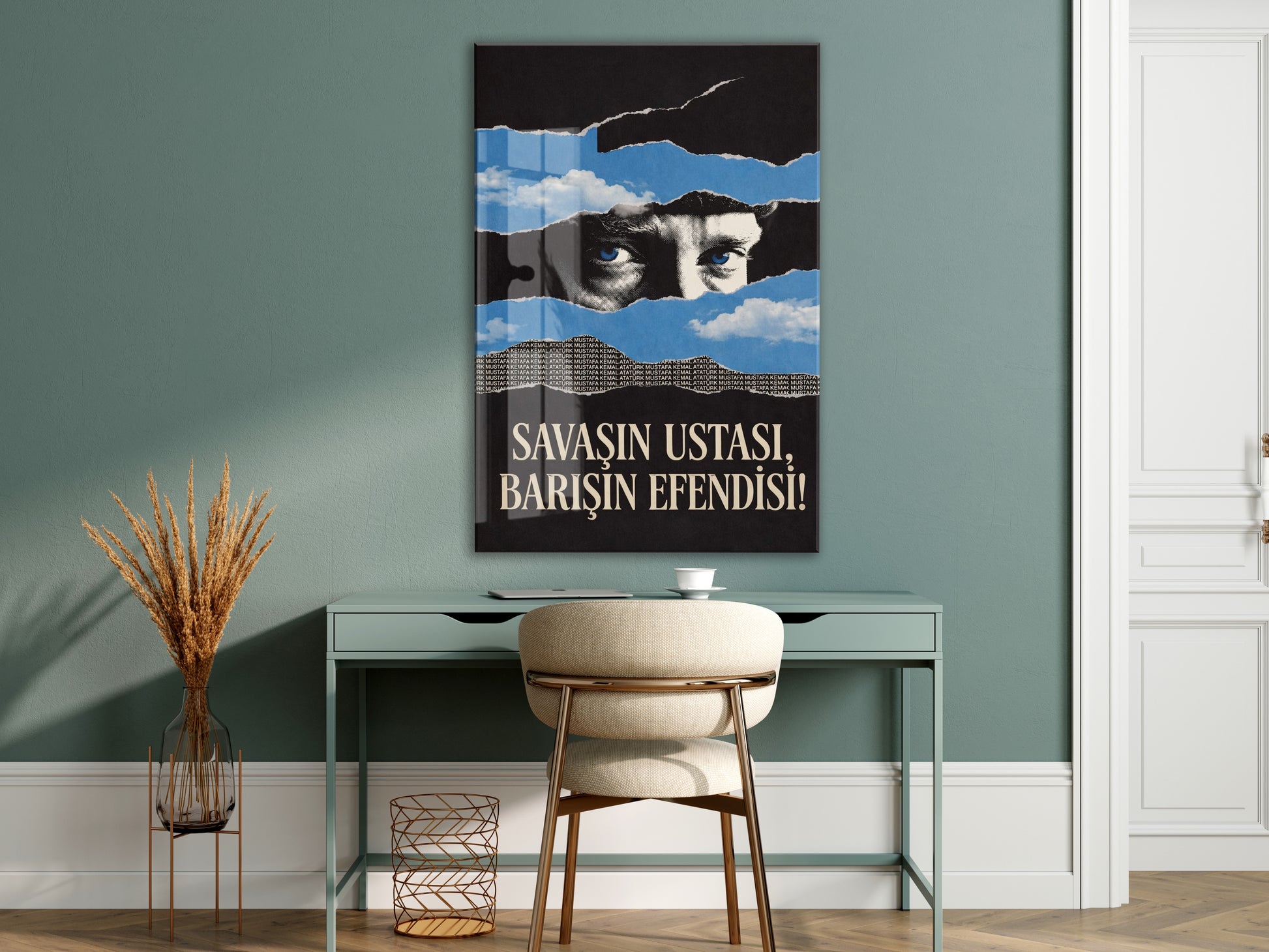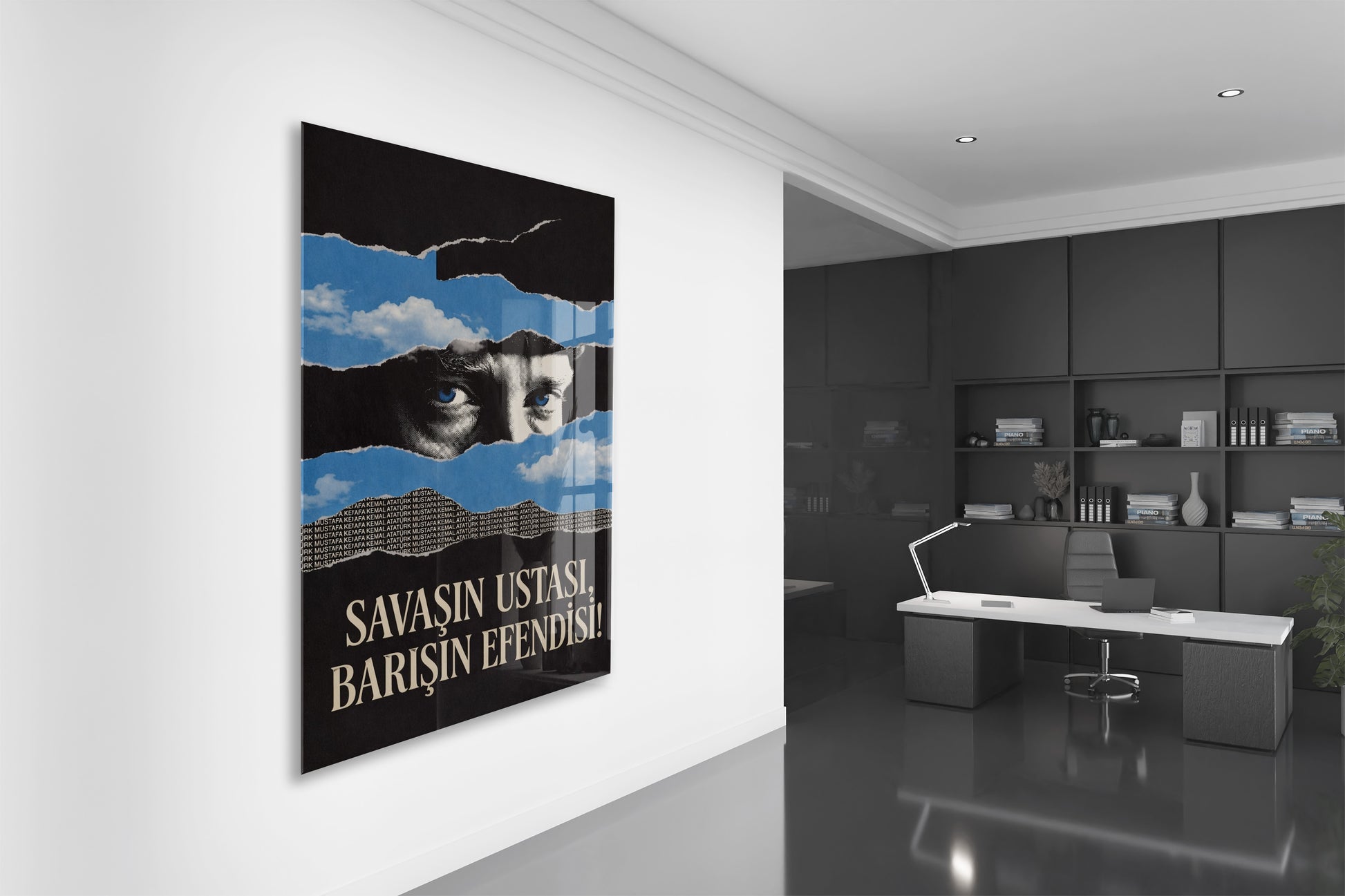 Mustafa Kemal Atatürk Savaşın Ustası Barışın Efendisi Cam Tablo – Modern Mavi Siyah Atatürk Duvar Dekoru -PeonyAta076