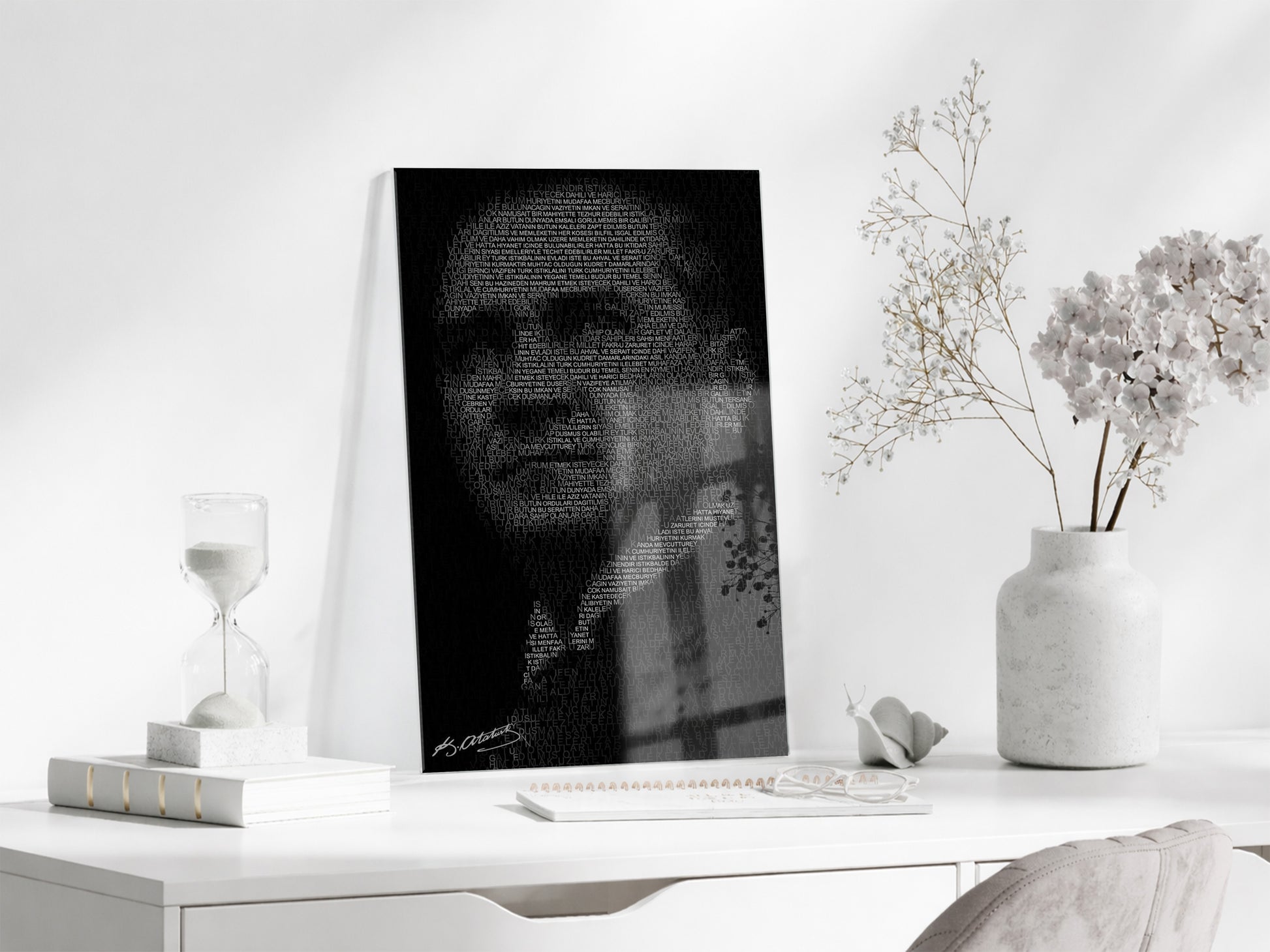 Atatürk Silüet Cam Baskı Tablo | Nutuk Metinli Siyah Beyaz Modern Duvar Dekoru, 4mm Temperli Cam, Yüksek Çözünürlüklü UV Baskı PeonyAta045