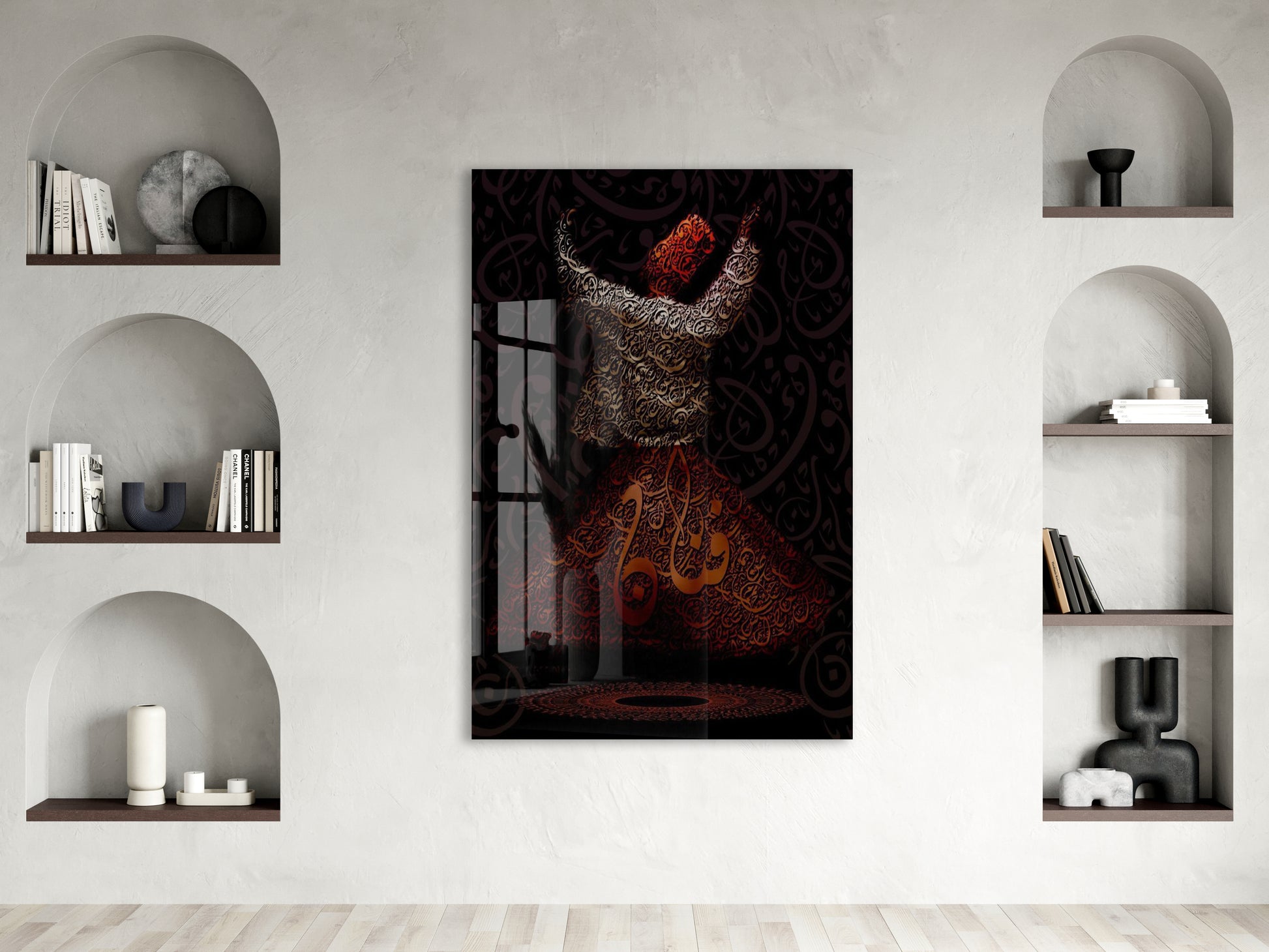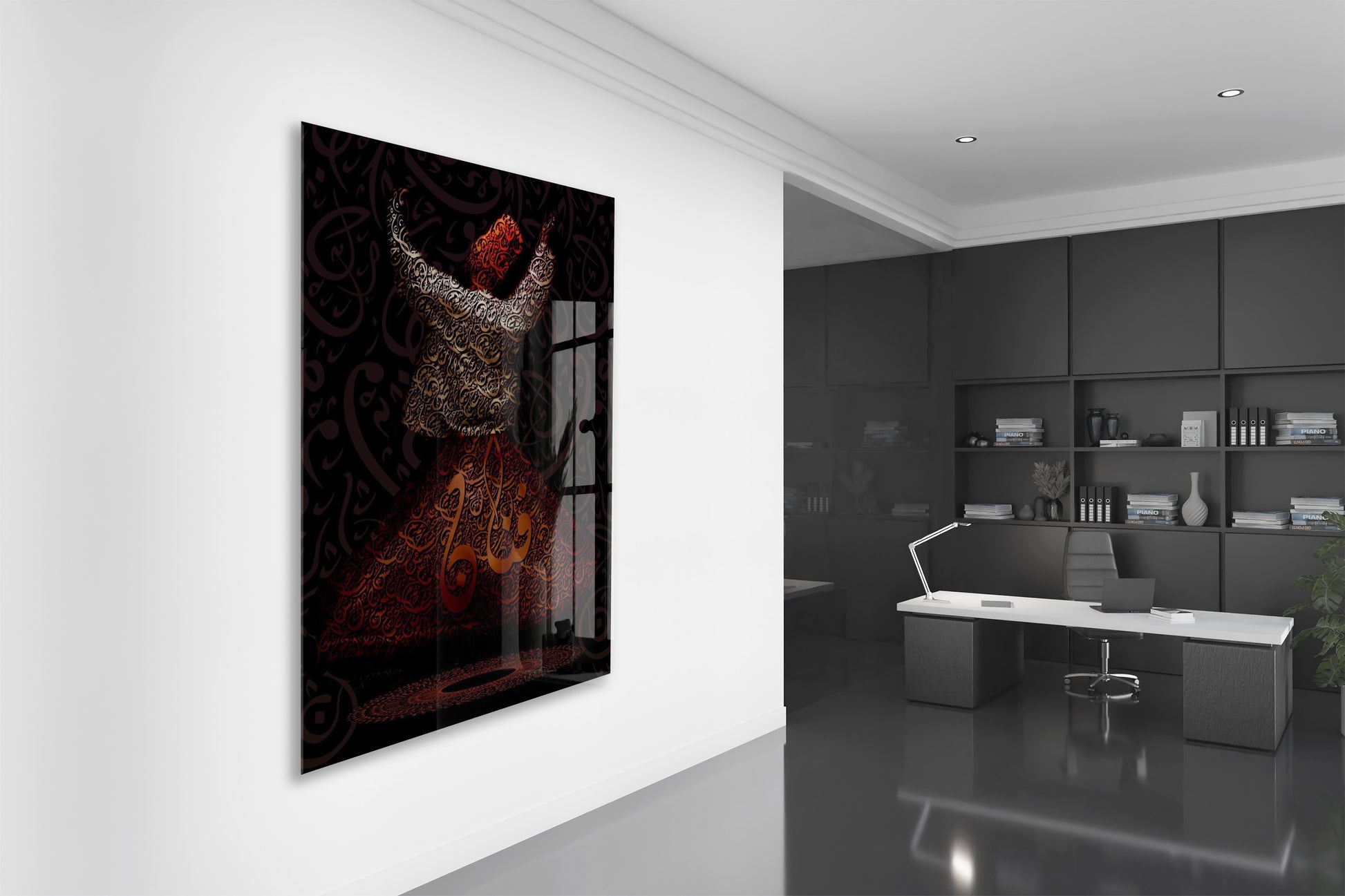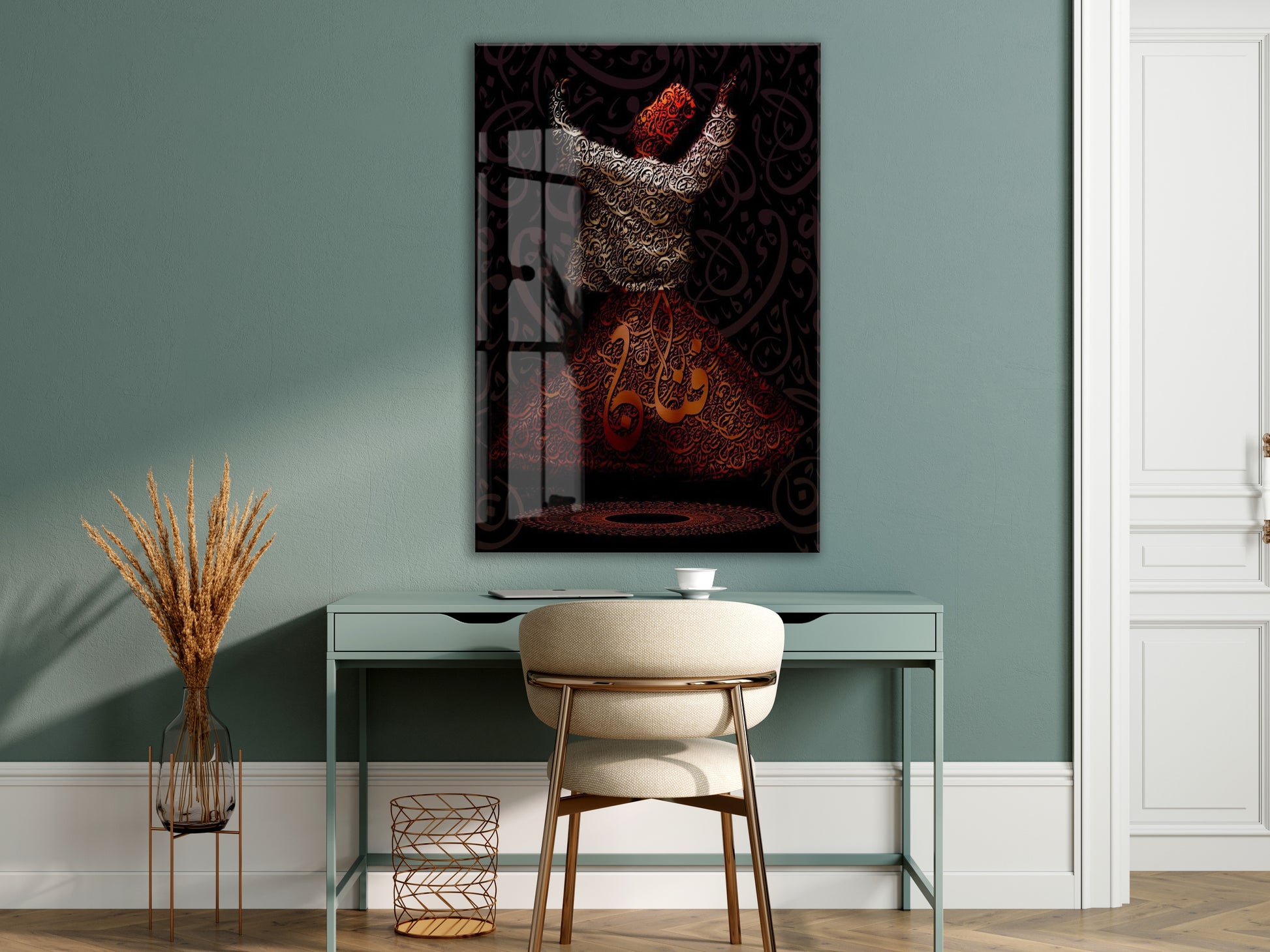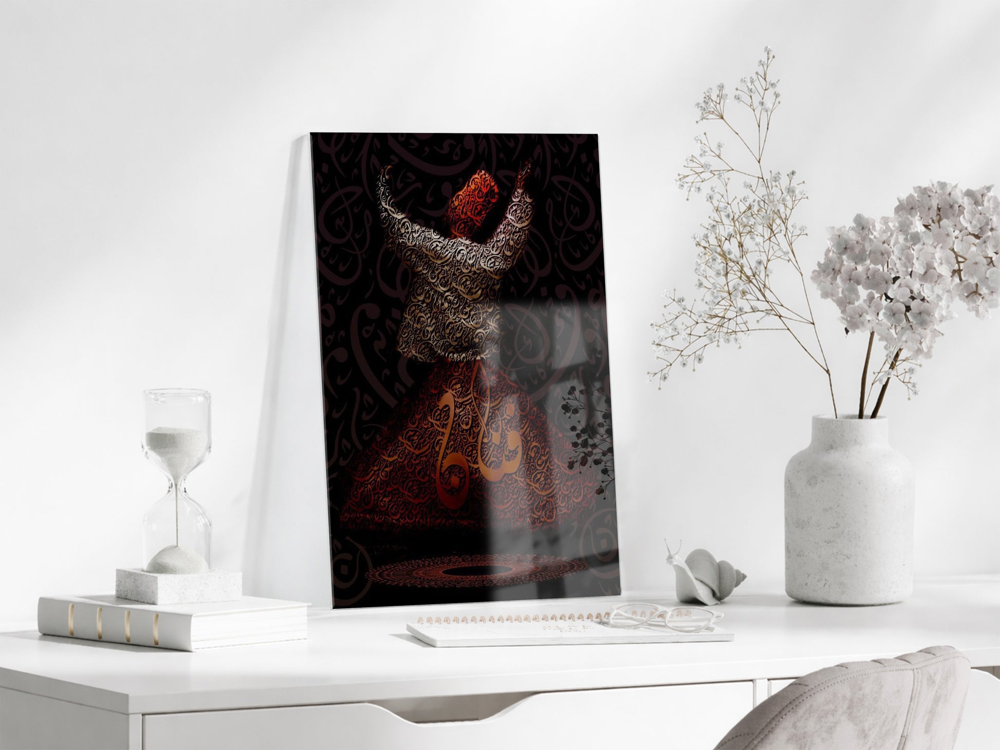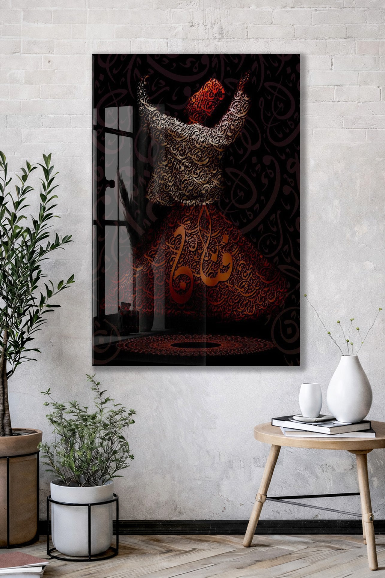 Bu cam tabloda sema eden Mevlevi derviş figürü yer almakta olup, etek bölümünde ve kompozisyonun merkezinde “Allah” lafzı hat sanatıyla işlenmiştir. Görsel, tasavvufta ilahi aşk, zikir ve Allah’a yönelişi sembolize eder.