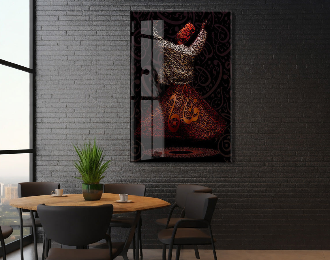 Allah Lafzı ile Sema Eden Mevlevi Derviş Cam Tablo | Tasavvuf Sanatı, İlahi Aşk ve Zikir Temalı İslami Hat Duvar Dekoru - PeonyDini0105