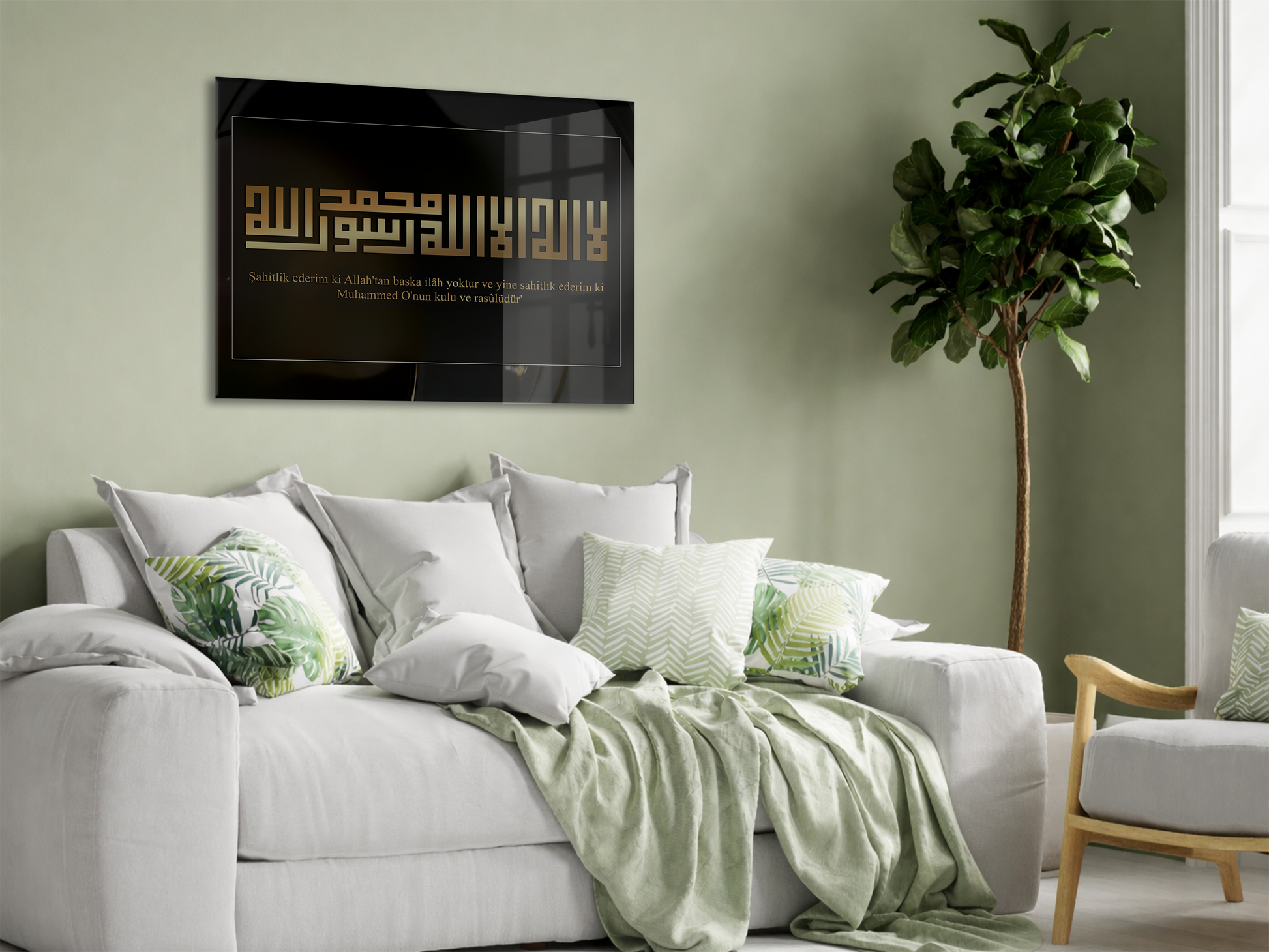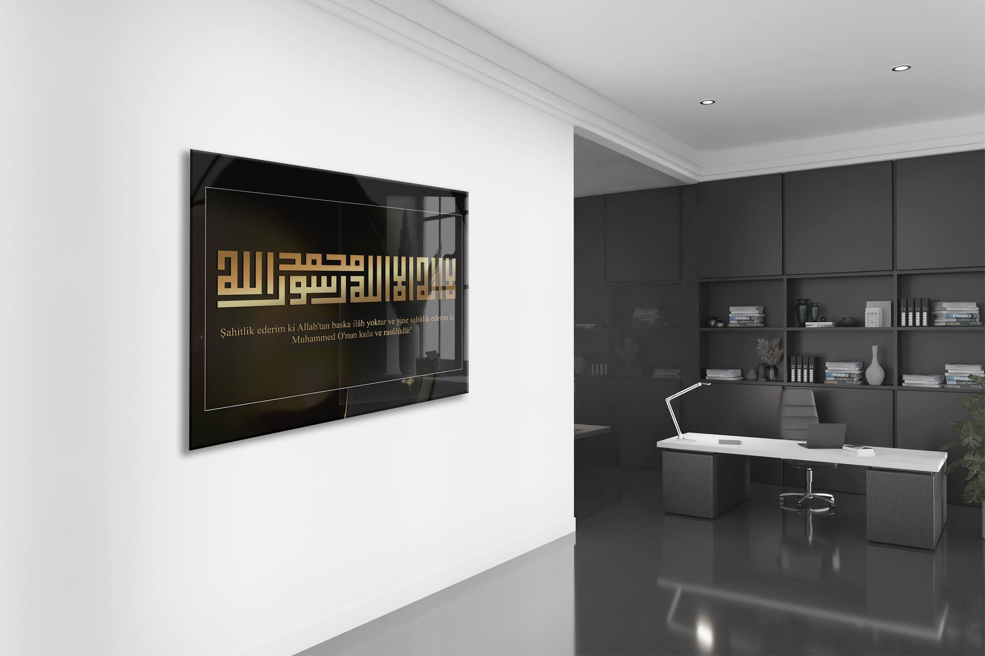 Altın Kufi Hat ile Kelime-i Şehadet – Modern Siyah Cam Tablo - PeonyDini085
