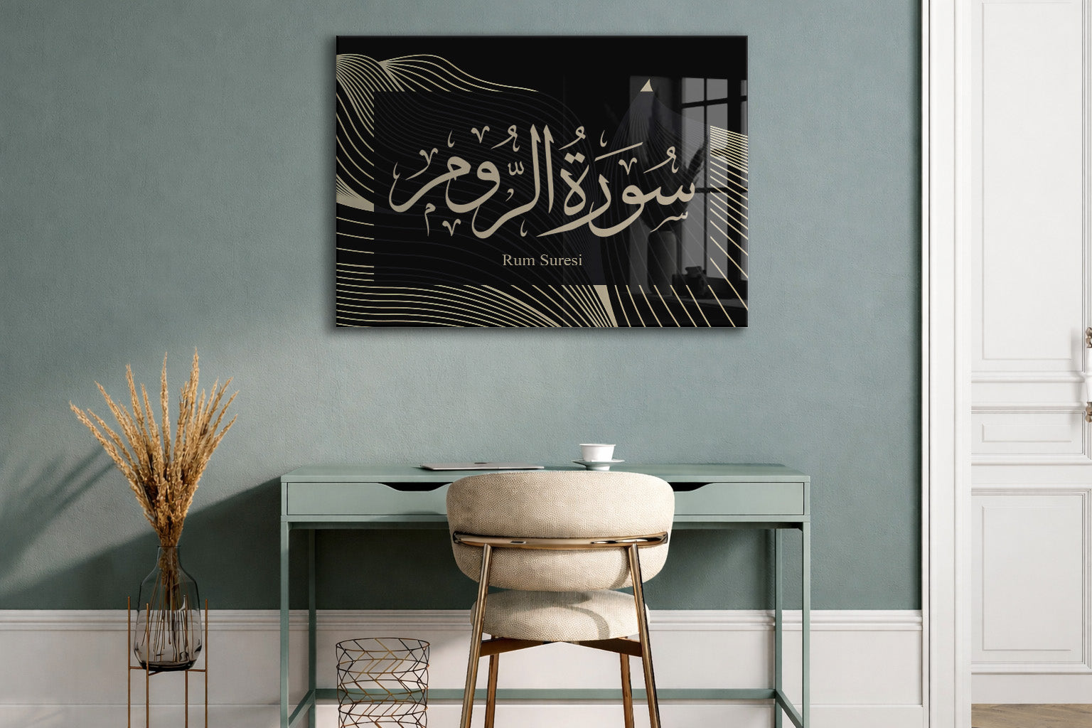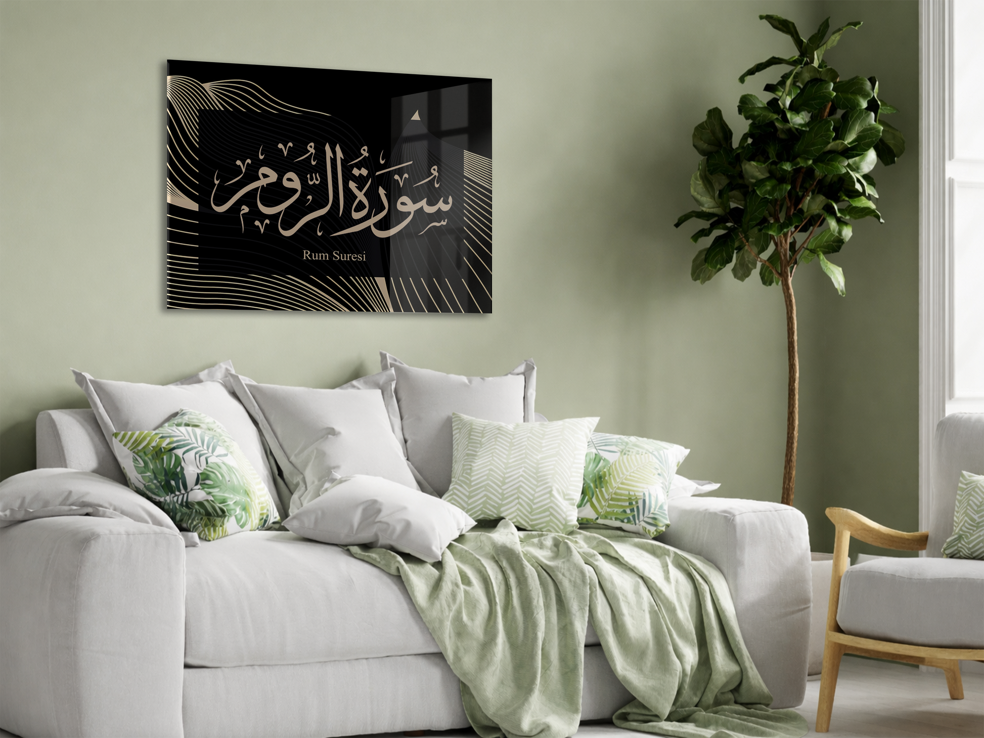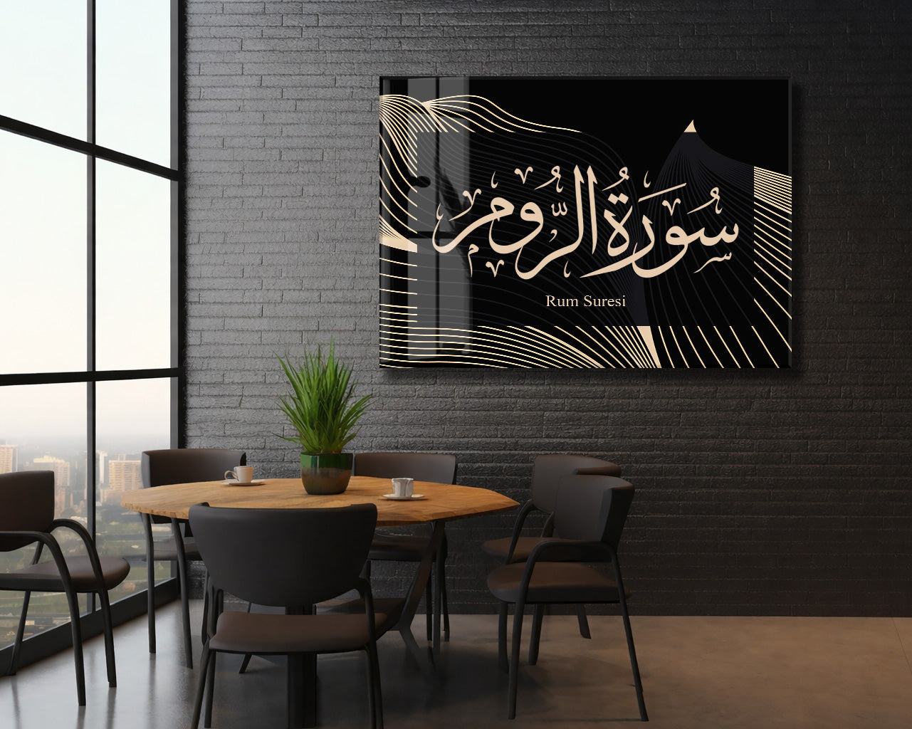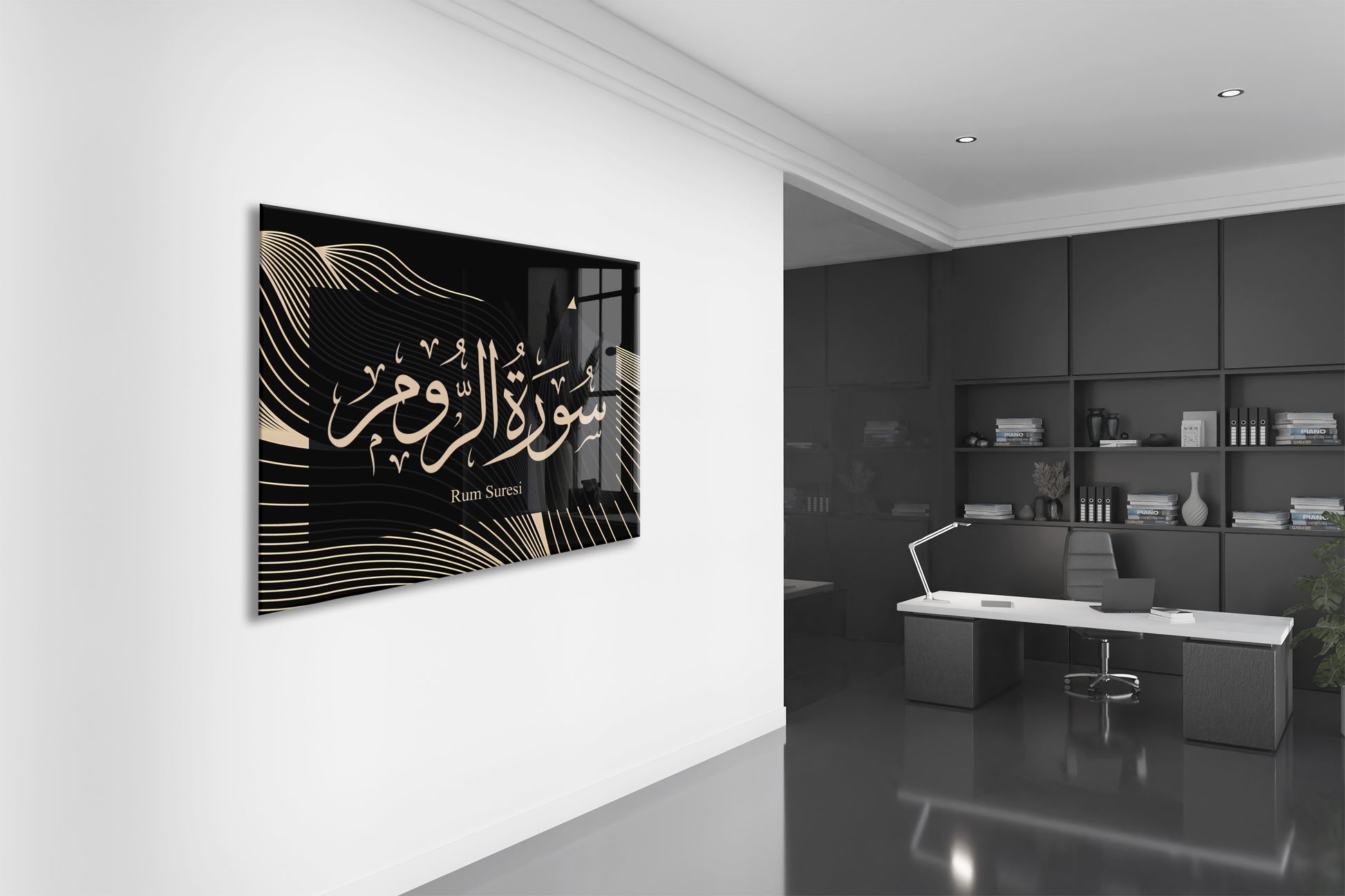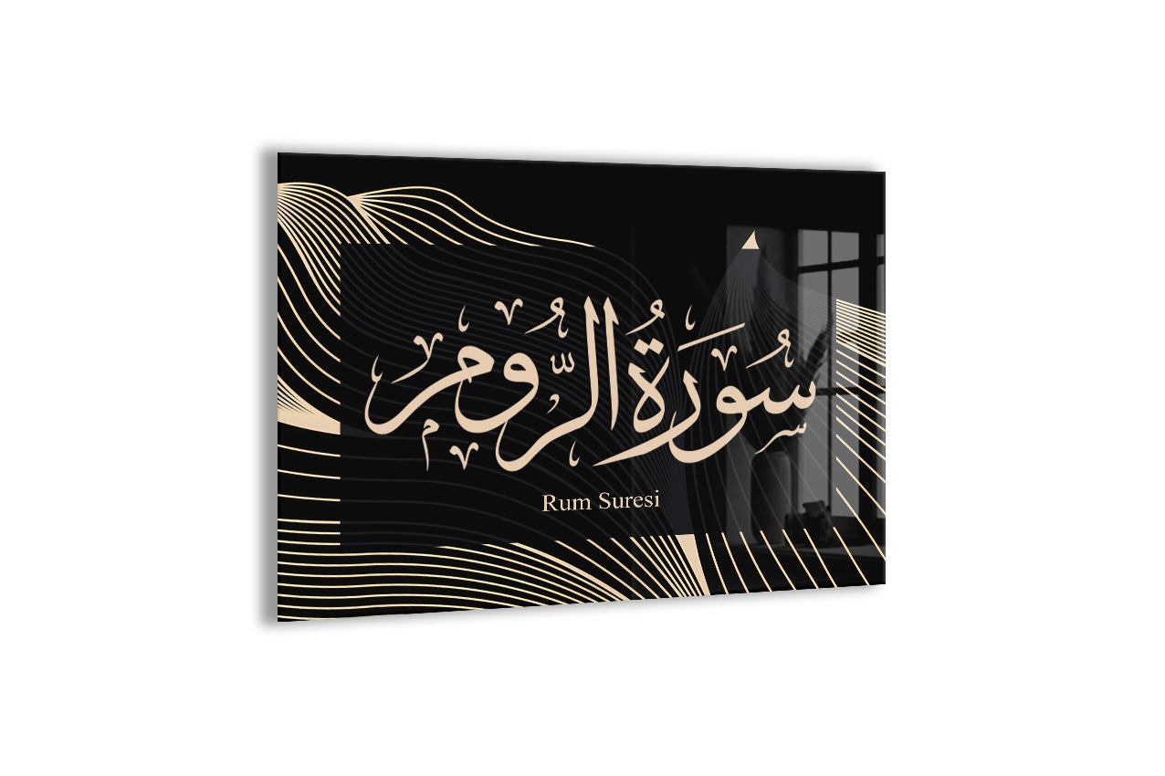 Sure-i Rum Cam Tablo – Altın Hat Yazılı Modern İslami Duvar Dekoru - PeonyDini096