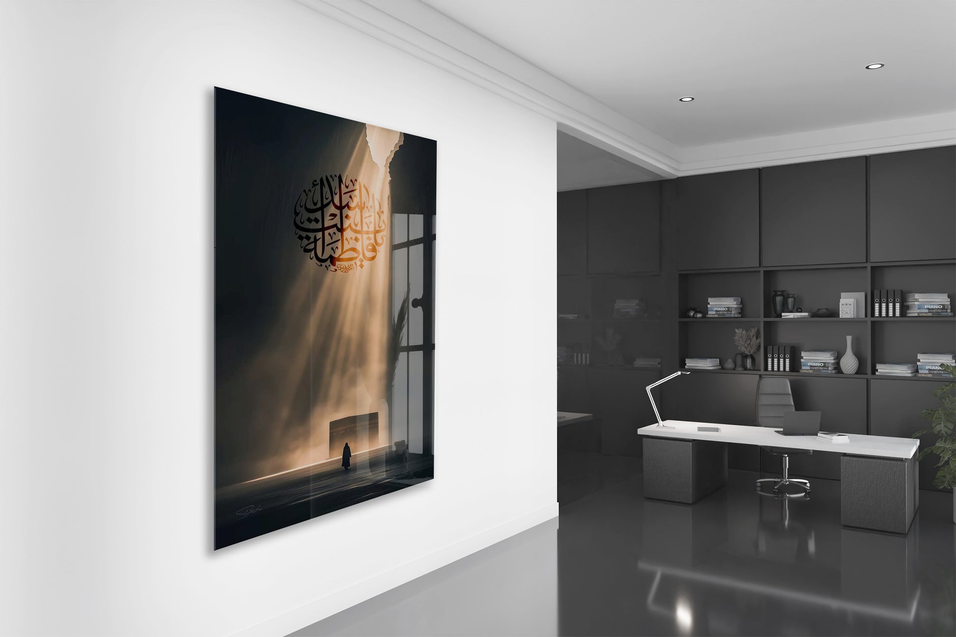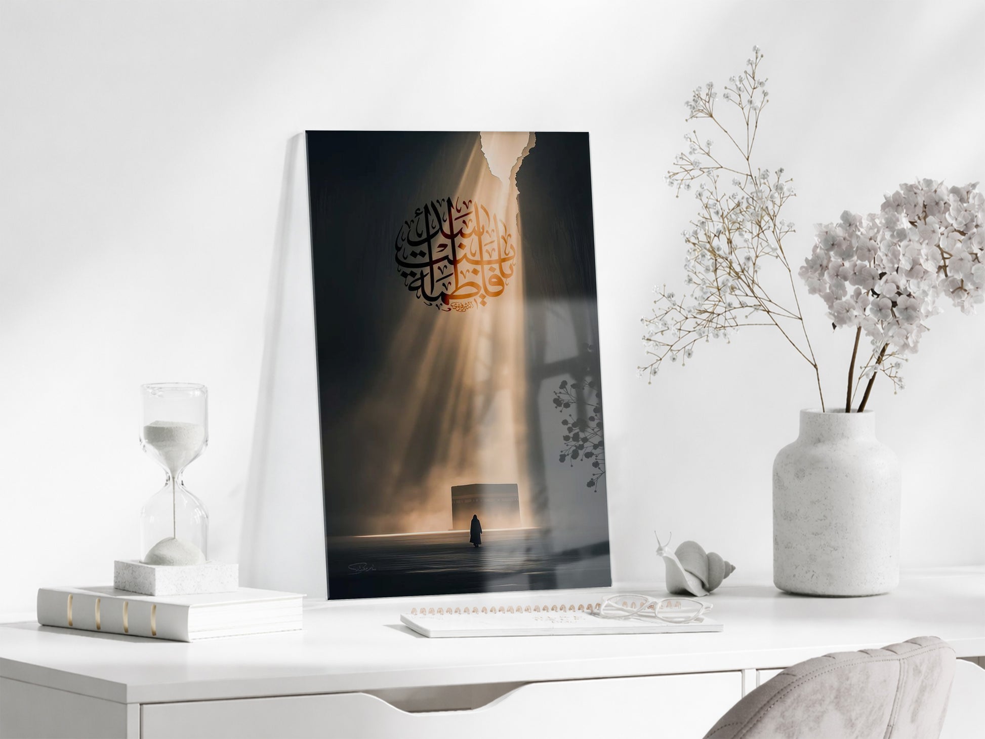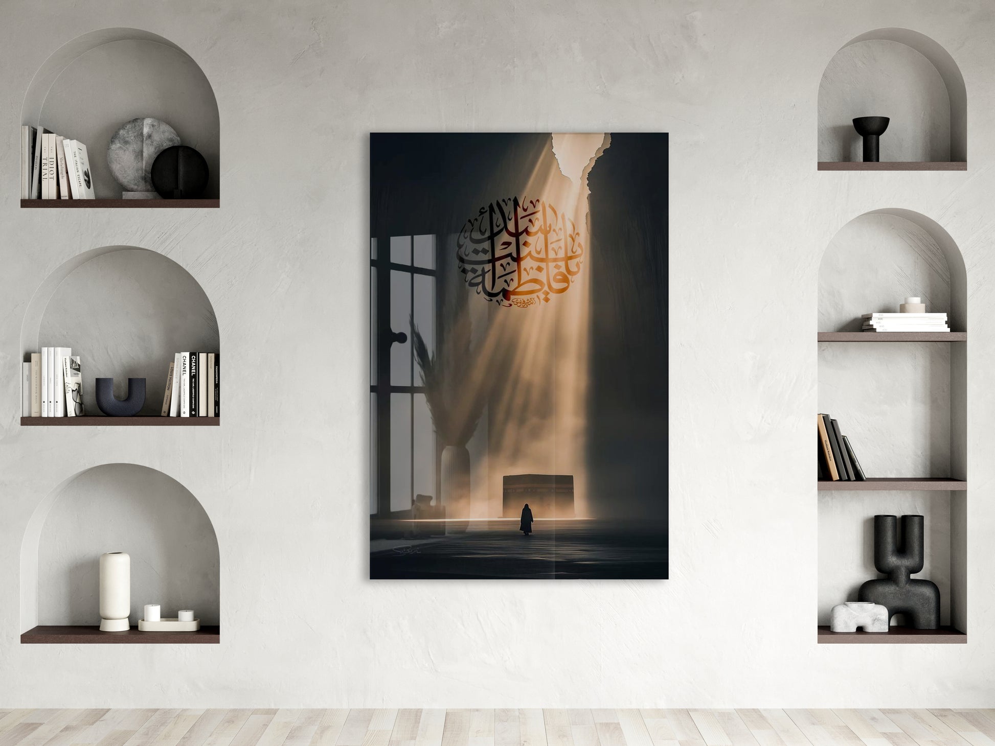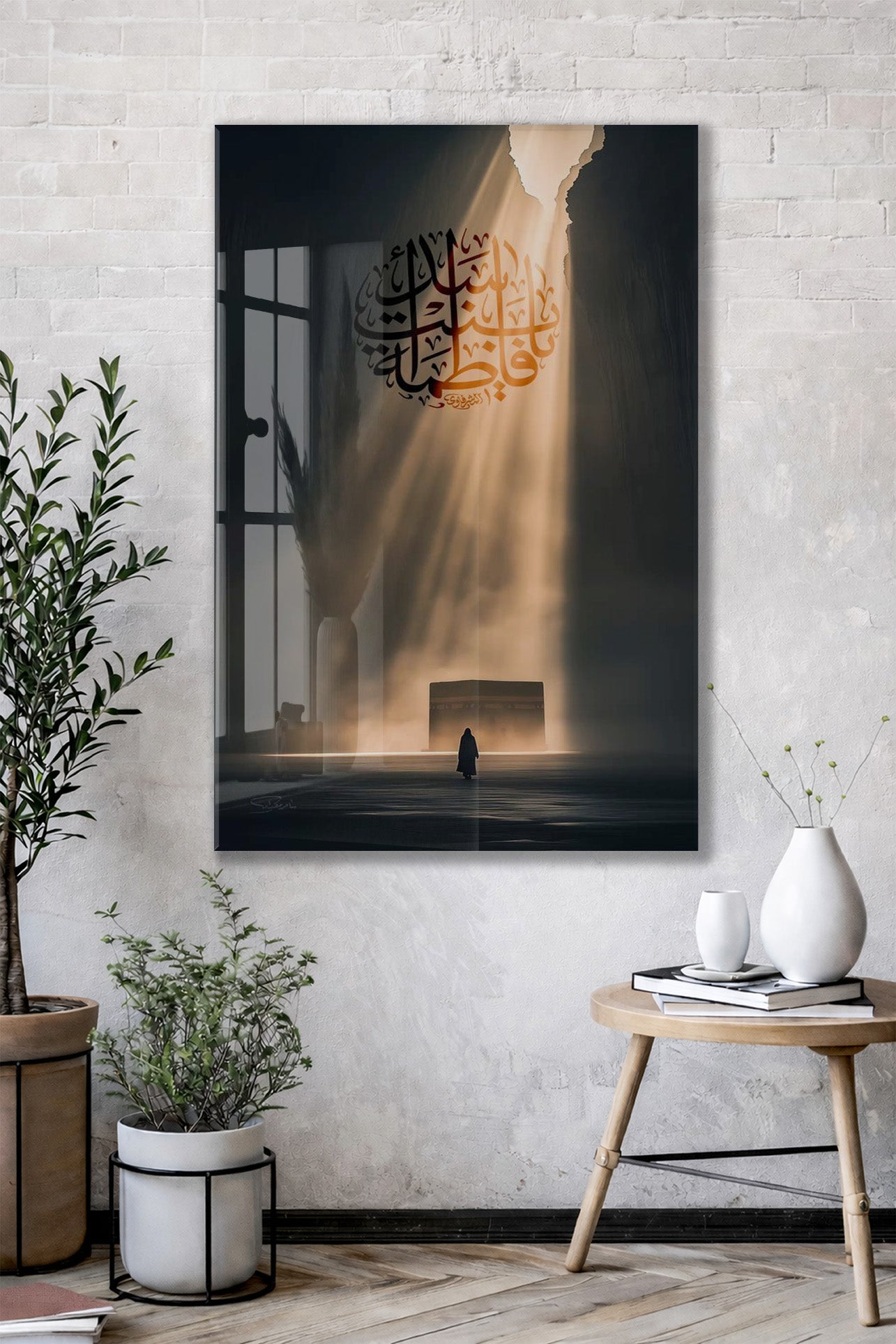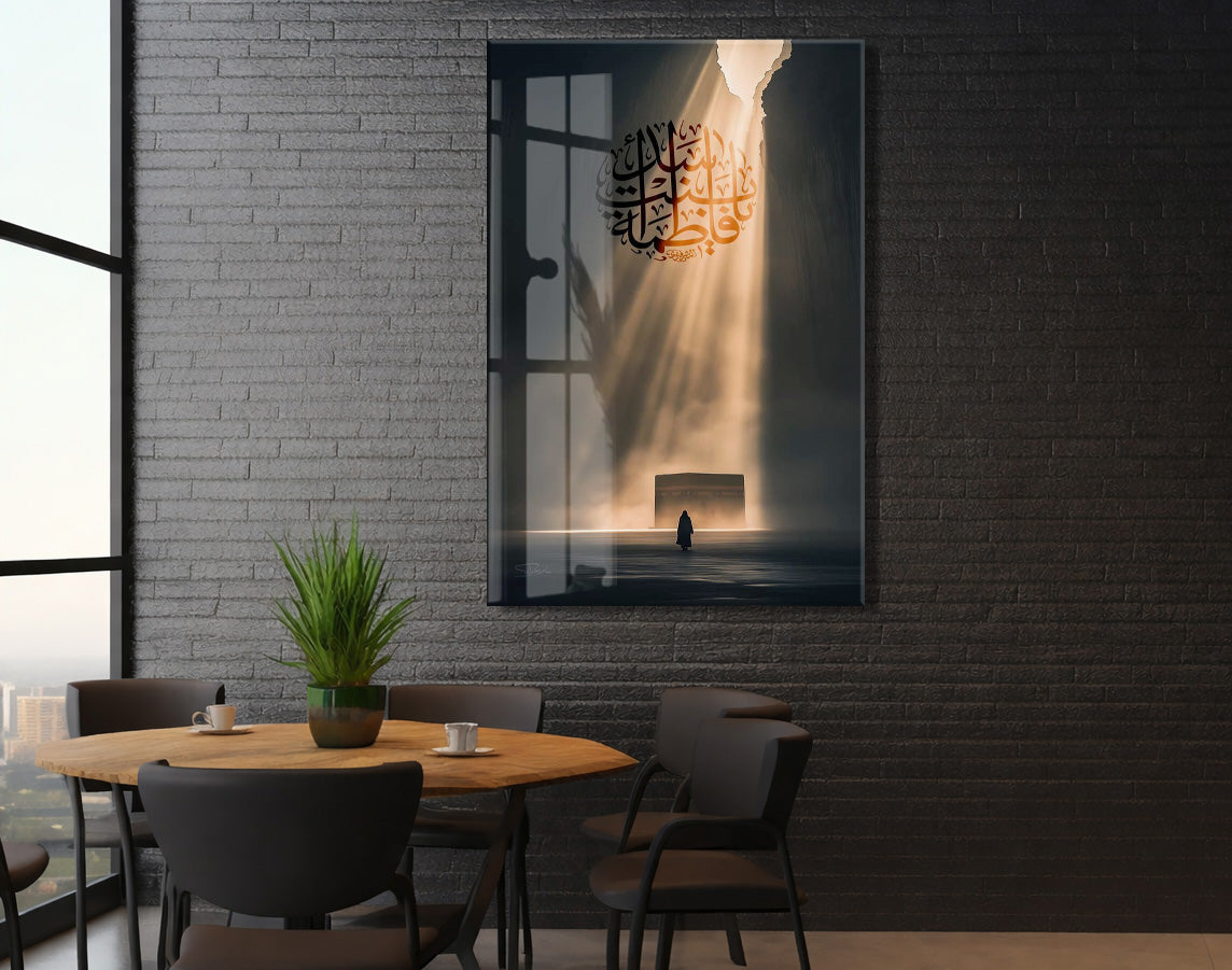 Bu cam tabloda, hat sanatıyla işlenmiş Hz. Ali (r.a.) ismi merkez alınarak manevî yolculuk ve ilahî ışık teması betimlenmiştir. Karanlıktan aydınlığa uzanan ışık huzmesi, hakikate yönelişi ve teslimiyeti simgeler. Simgesel anlatımıyla derin bir ruhsal atmosfer sunar.