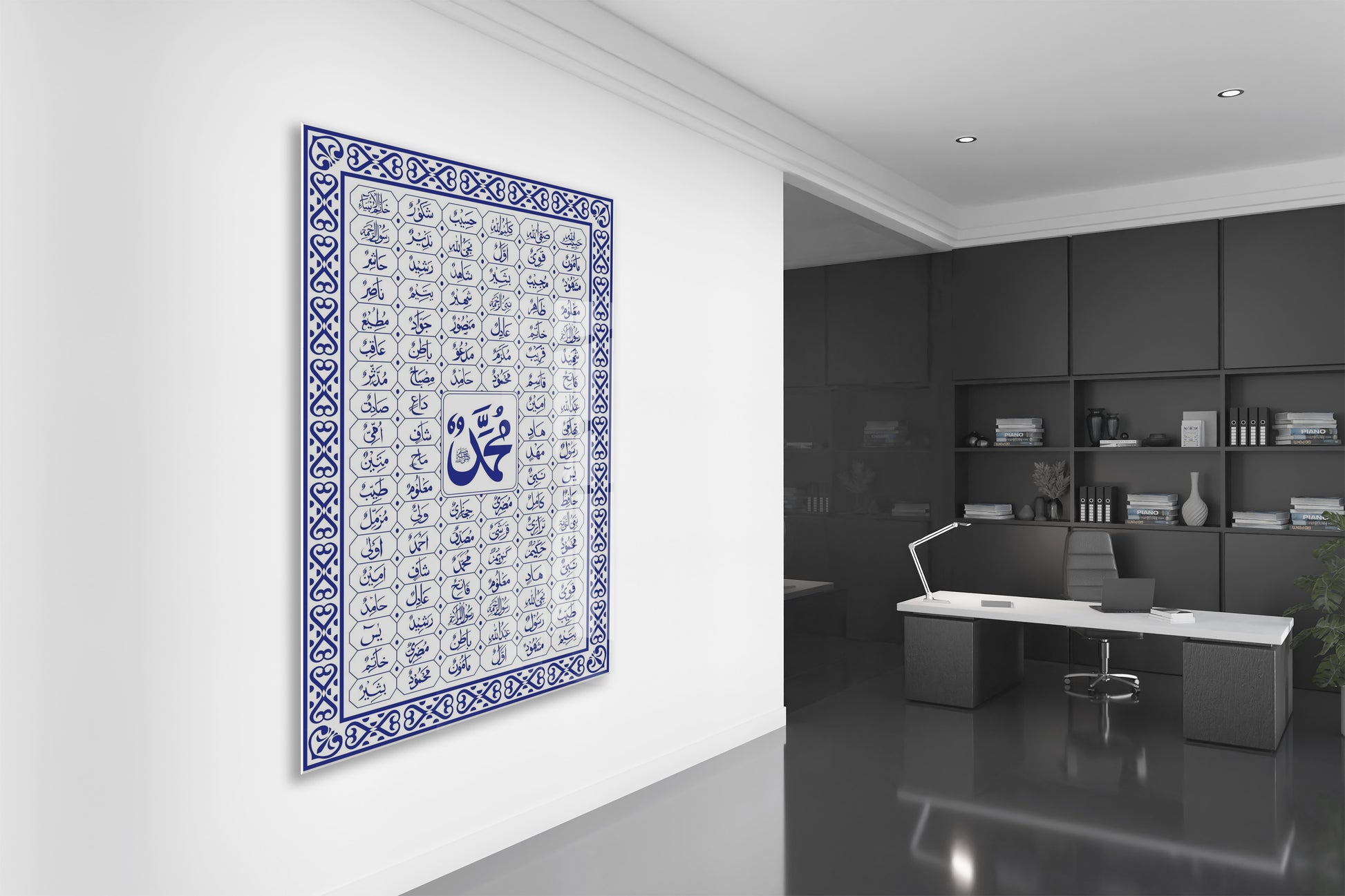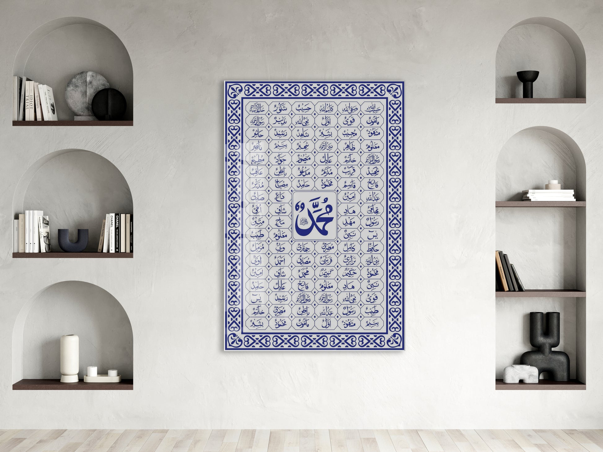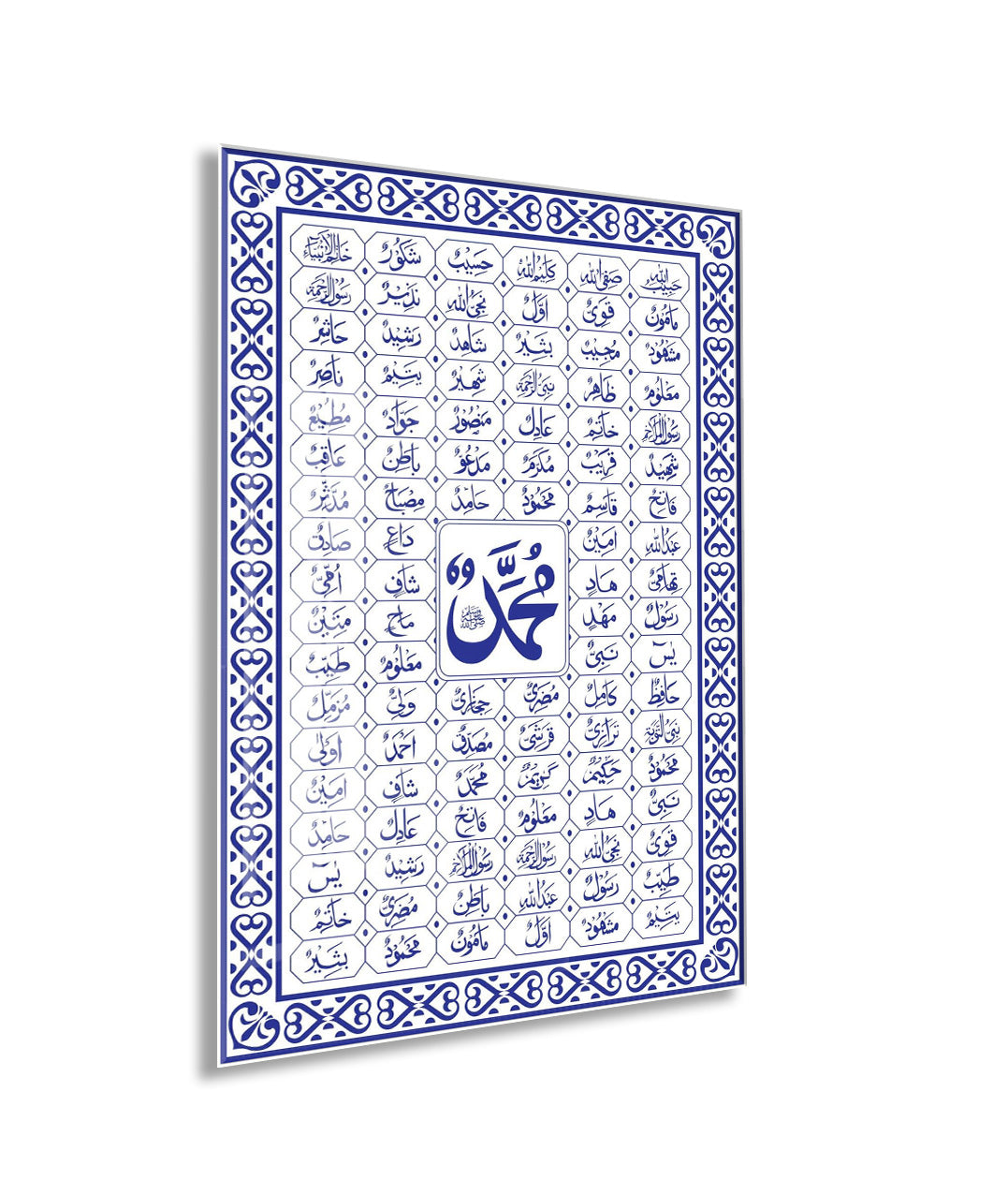 Muhammed (SAV) ve Esmaül Hüsna Cam Tablo – Mavi Beyaz İslami Duvar Dekoru - PeonyDini138