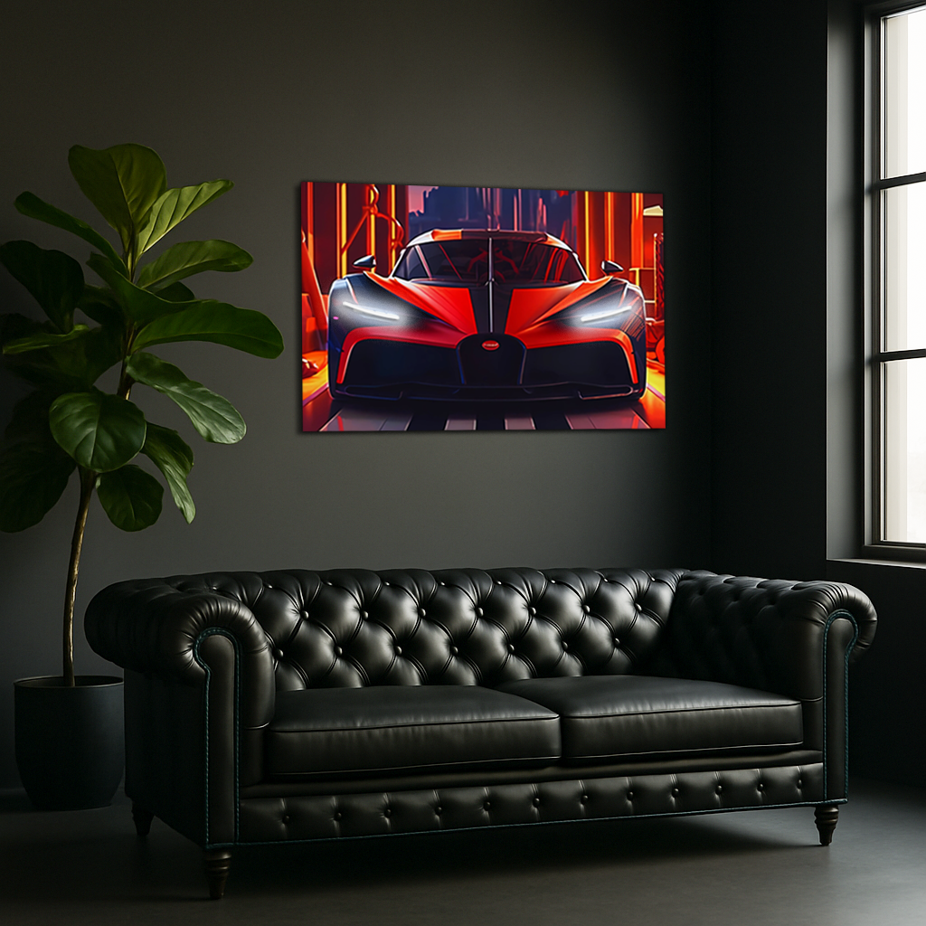 Bu kırmızı Bugatti tarzı UV baskı duvar dekoru, 5 mm kalınlığındaki dayanıklı pleksi üzerine yüksek çözünürlüklü baskı ile üretilmiştir.