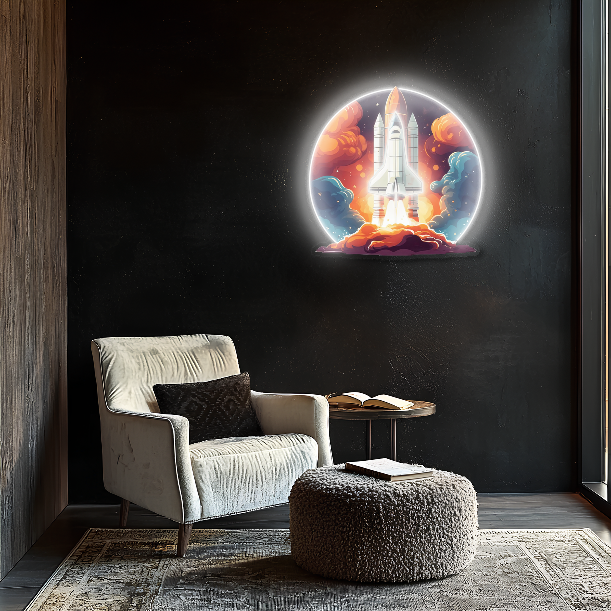 Bu Roket Lansmanı Neon Duvar Dekoru, uzaya yükselen bir roketin enerjisini duvarınıza taşır.