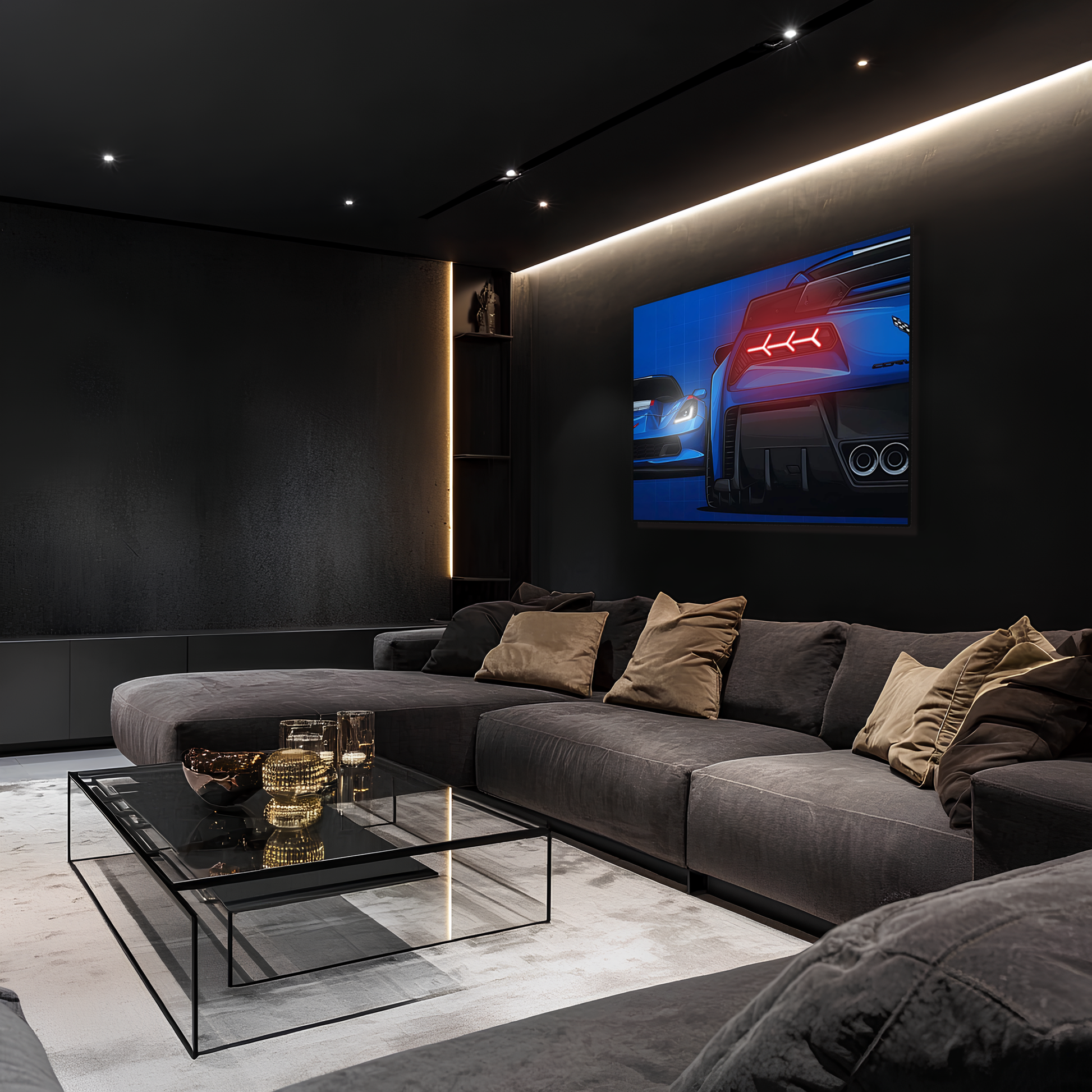 Mavi Corvette Tarzı UV Baskı Neon Duvar Dekoru | Pleksi Işıklı Süper Araba Tablo | Modern Ev ve Ofis Dekoru