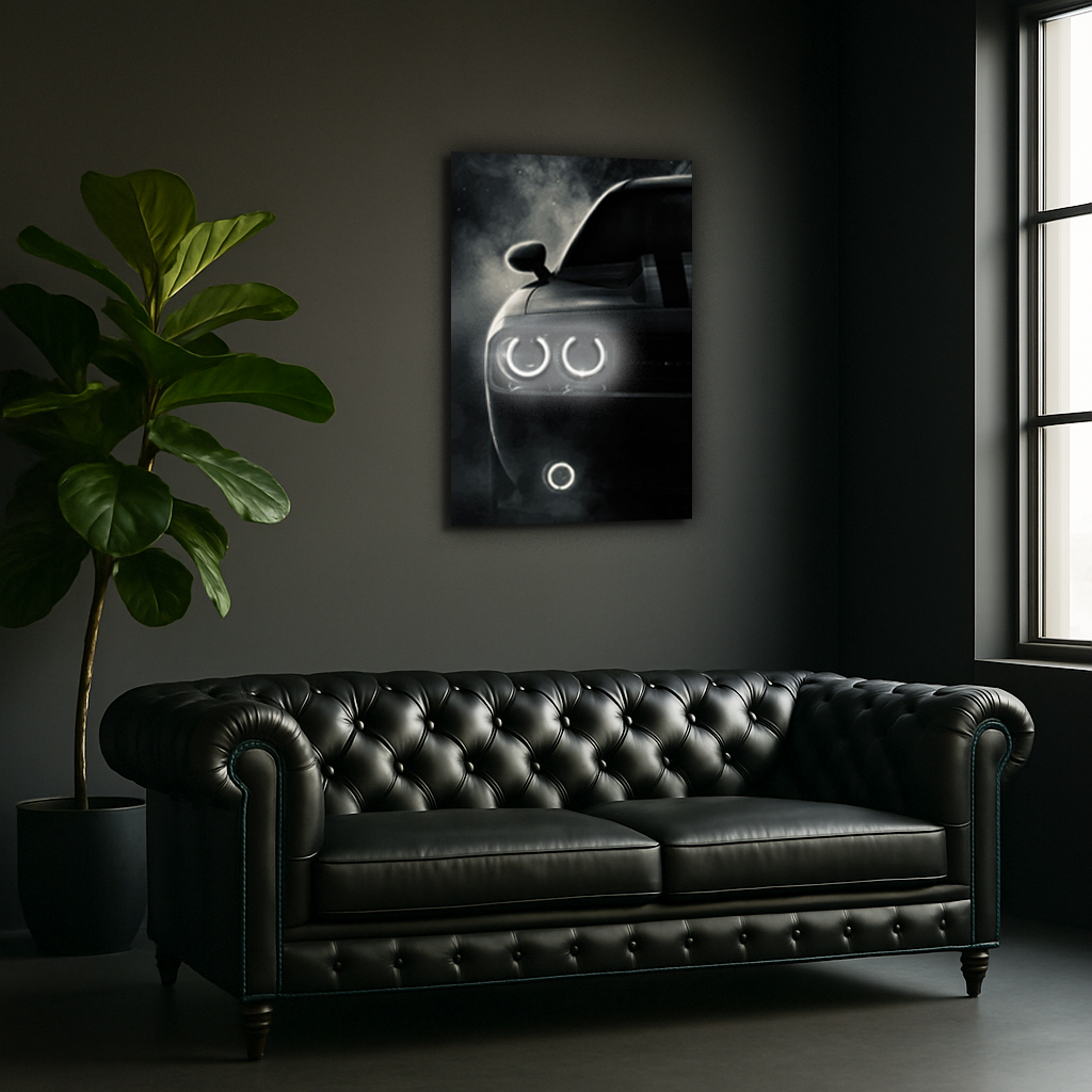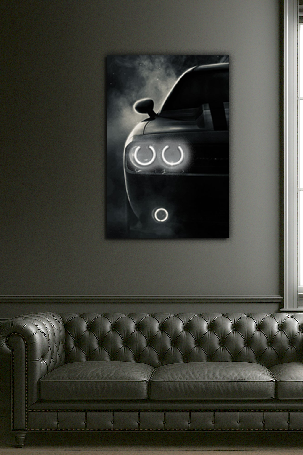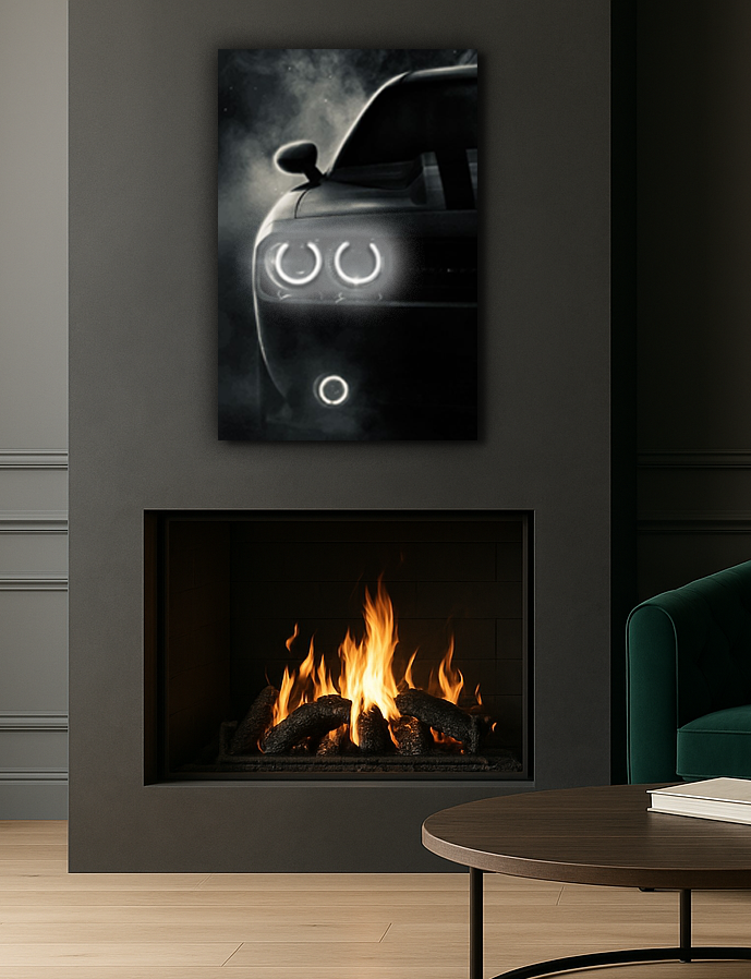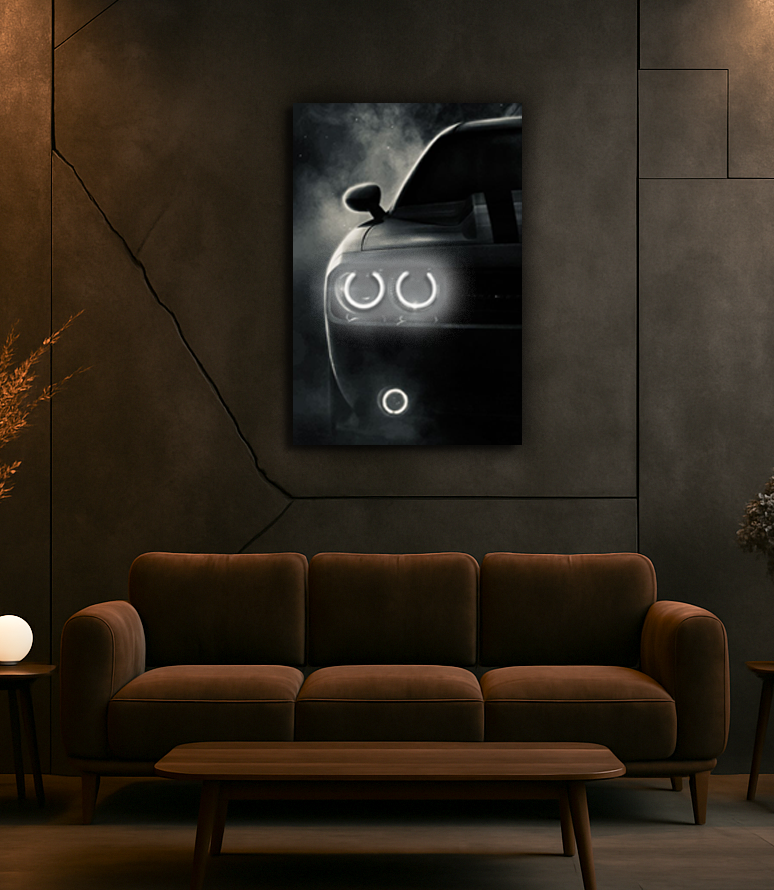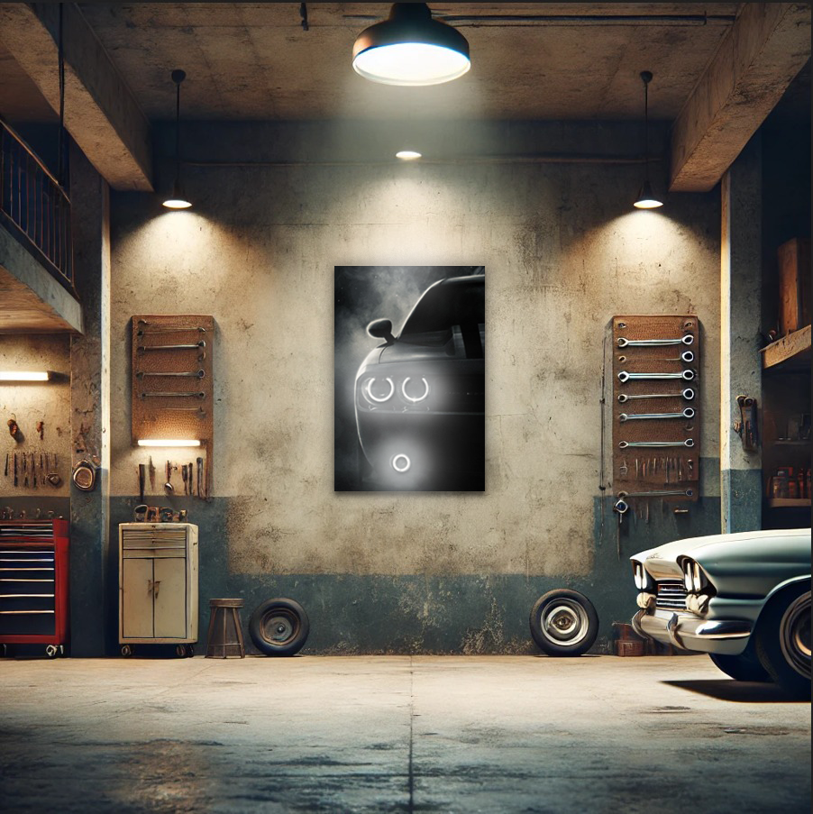 Gücü, gizemi ve tarzı aynı anda yansıtan bu UV baskı neon duvar dekoru, yüksek kontrastlı sisli arka planı ve parlak LED far efektiyle öne çıkar.