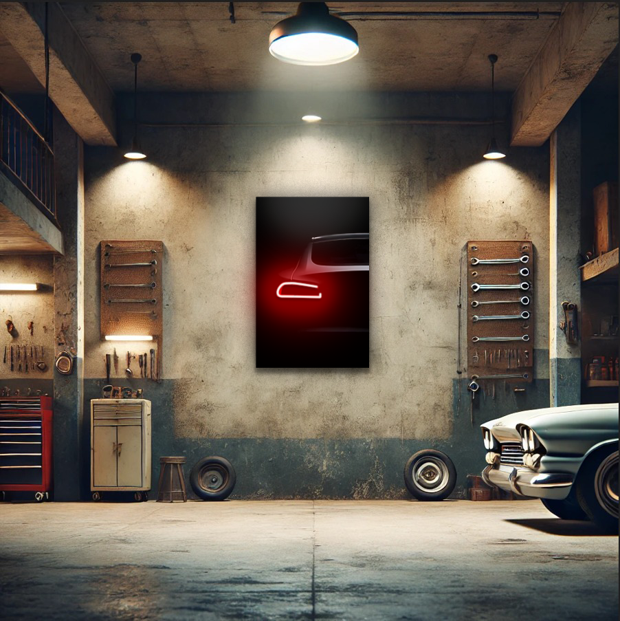 Minimalist Siyah Araba UV Baskı Neon Duvar Dekoru | Kırmızı Işıklı Pleksi Tablo | Modern Salon ve Ofis Duvar Sanatı