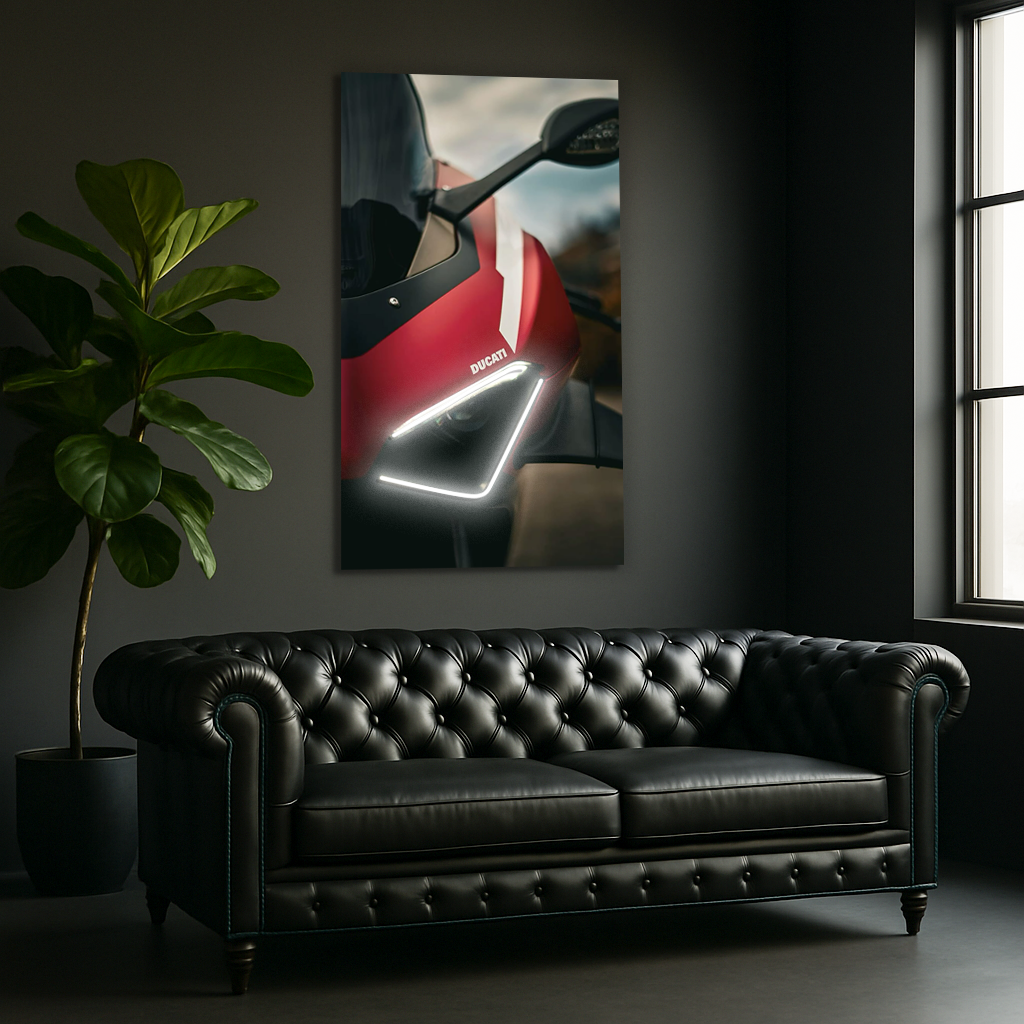 Bu kırmızı spor motosiklet UV baskı neon tablo, ön farlarında yer alan beyaz LED hatlarıyla güçlü bir enerji ve modern bir atmosfer yaratır.