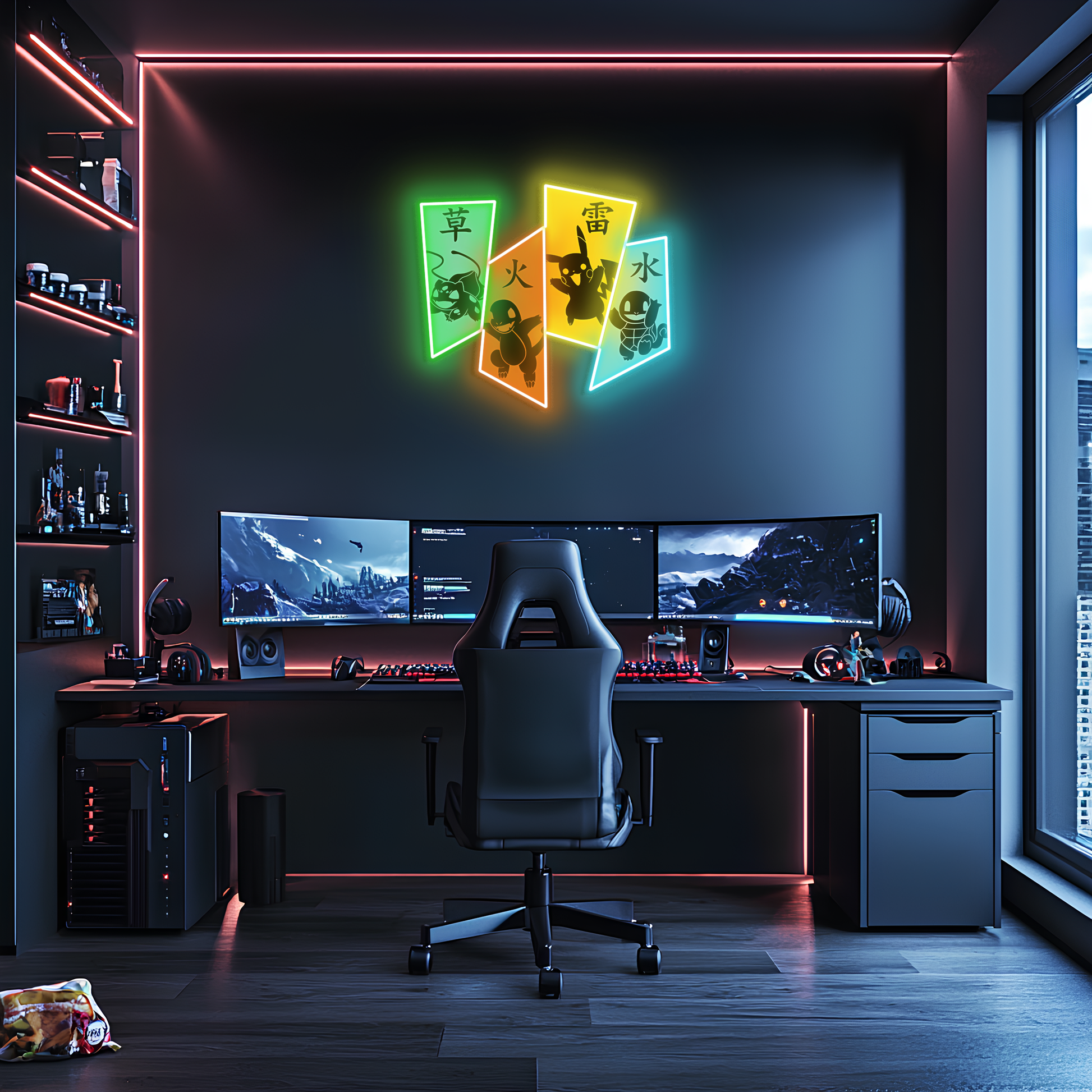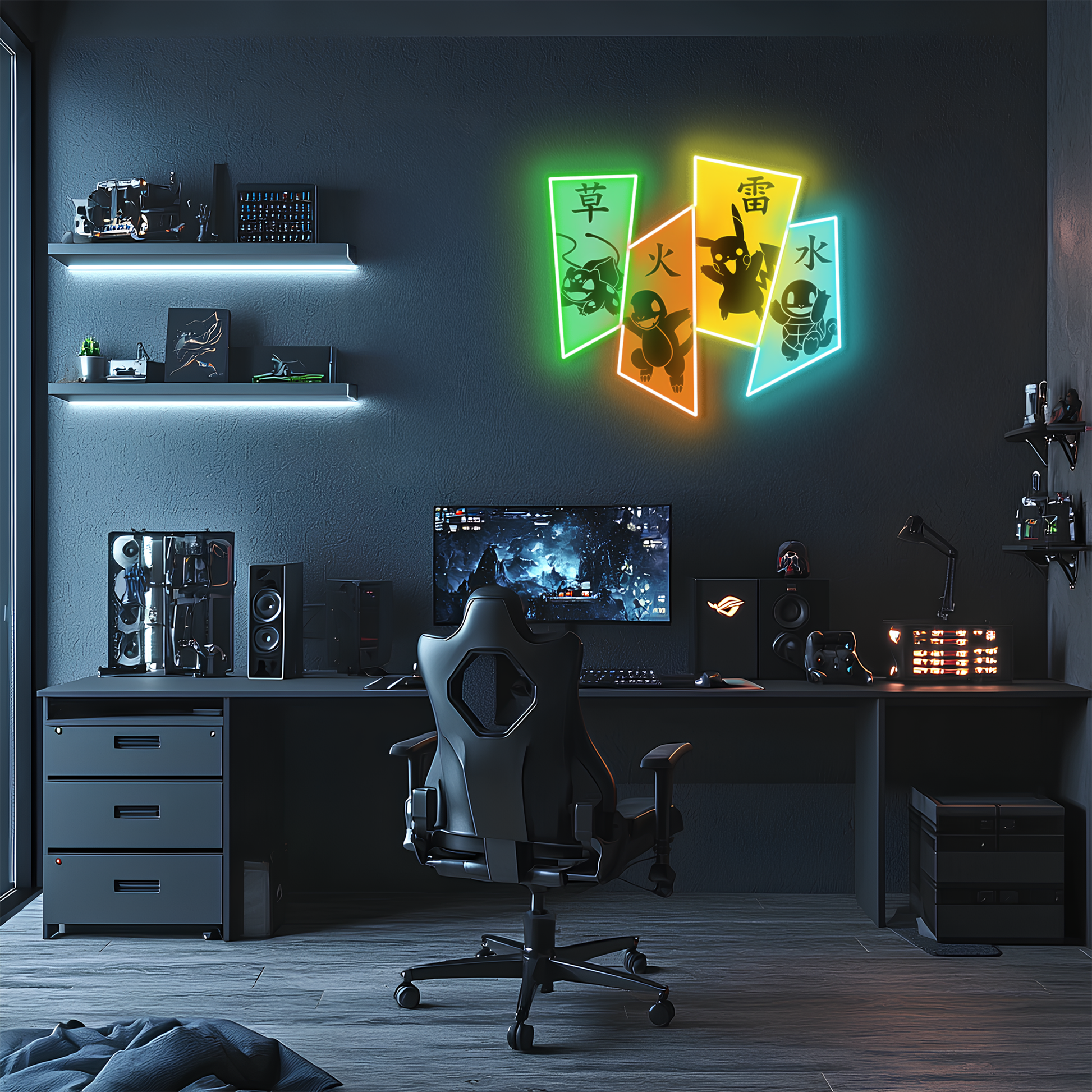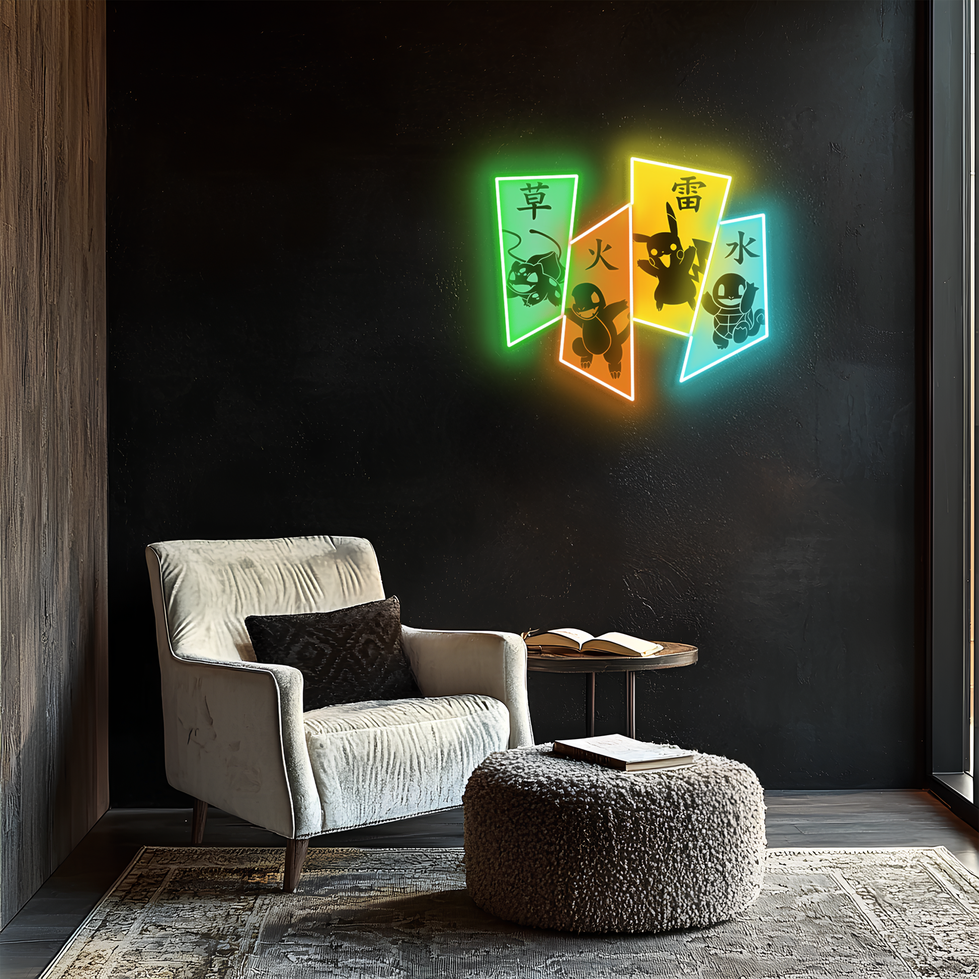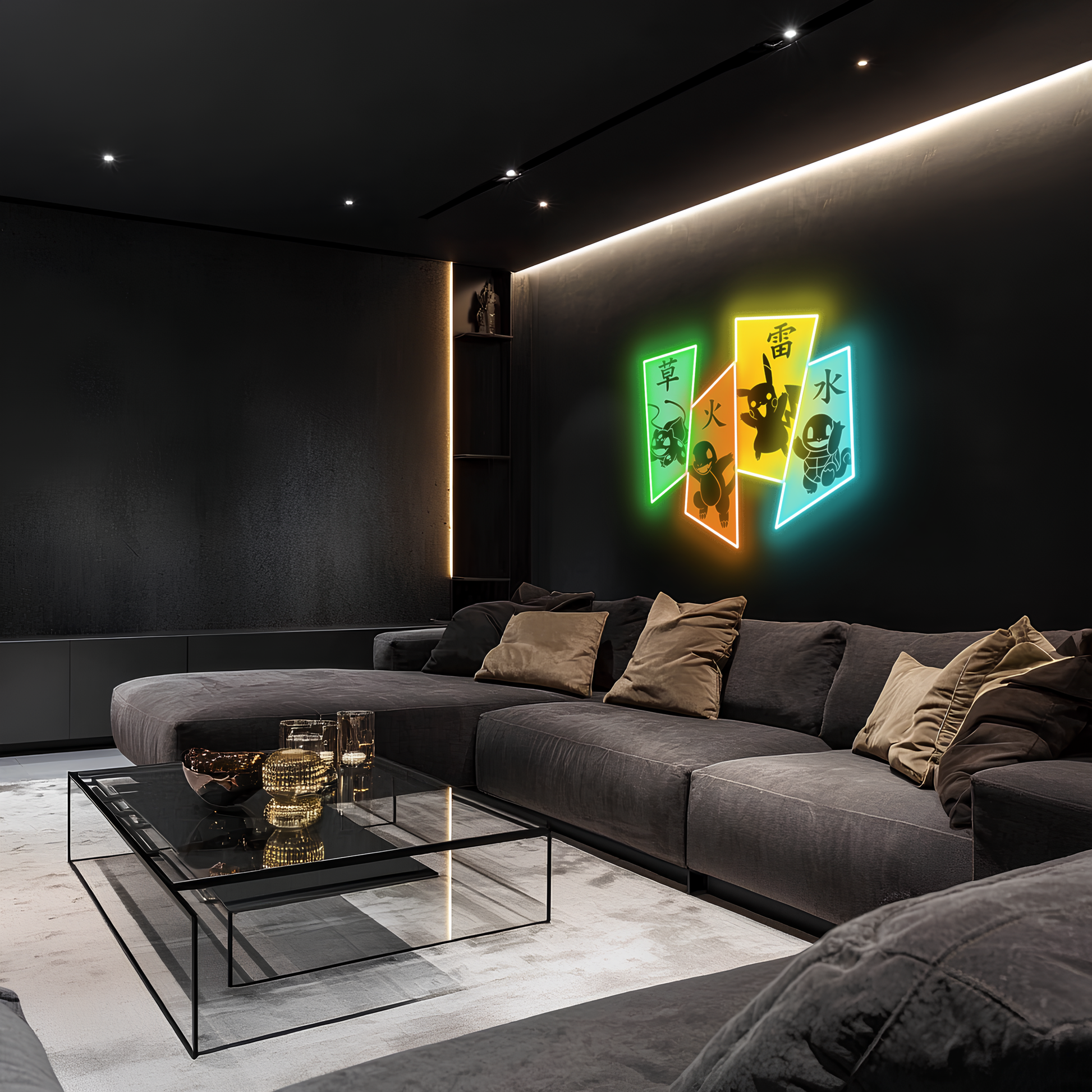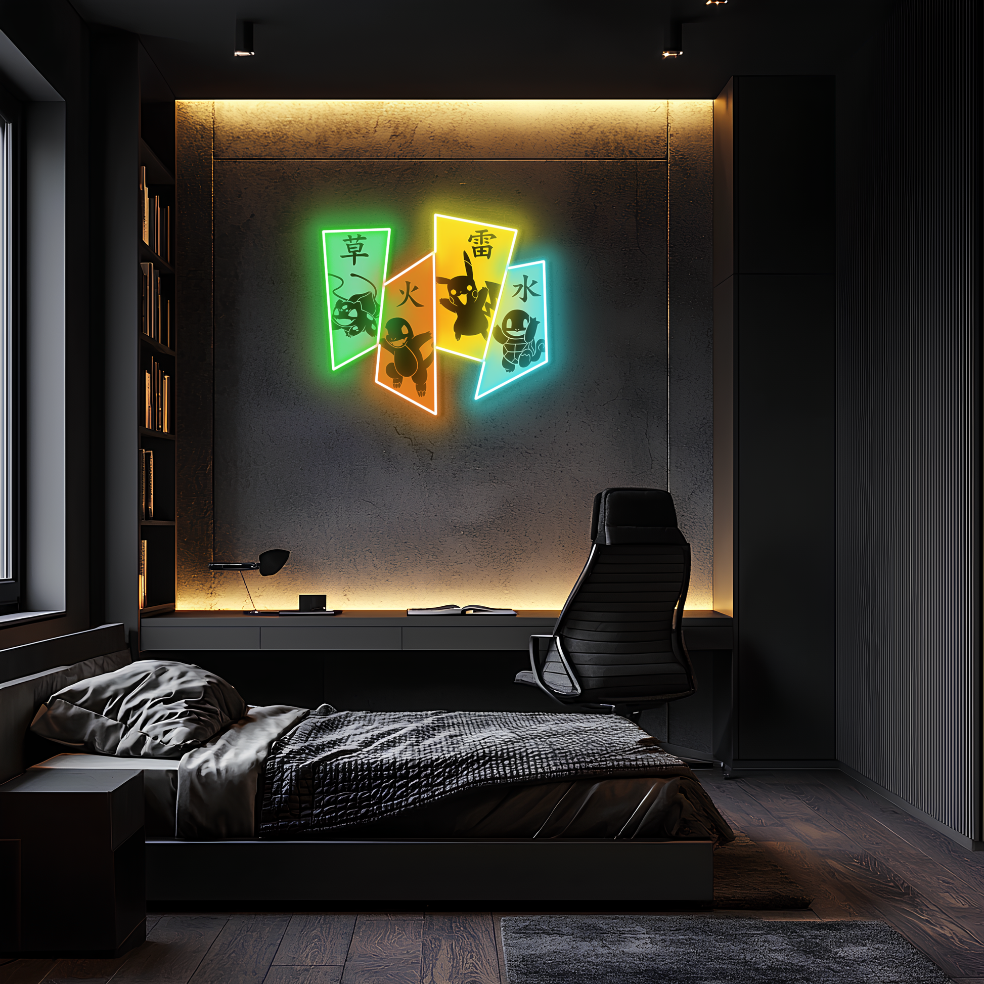 Charmander, Squirtle ve Bulbasaur’dan ilham alınarak tasarlanan bu özel neon duvar dekoru, anime ruhunu modern tasarımla birleştiriyor.